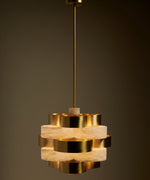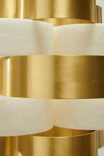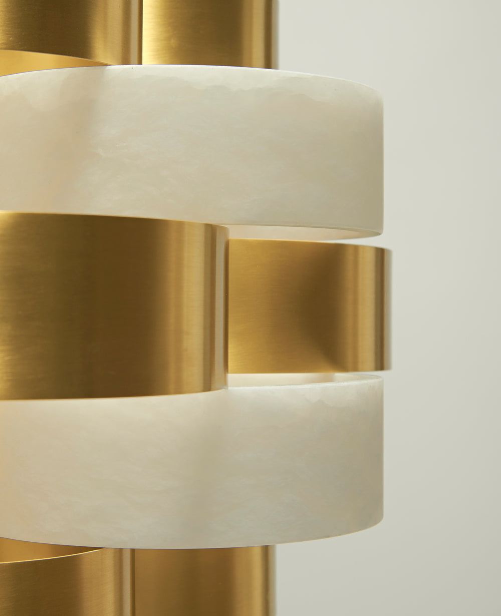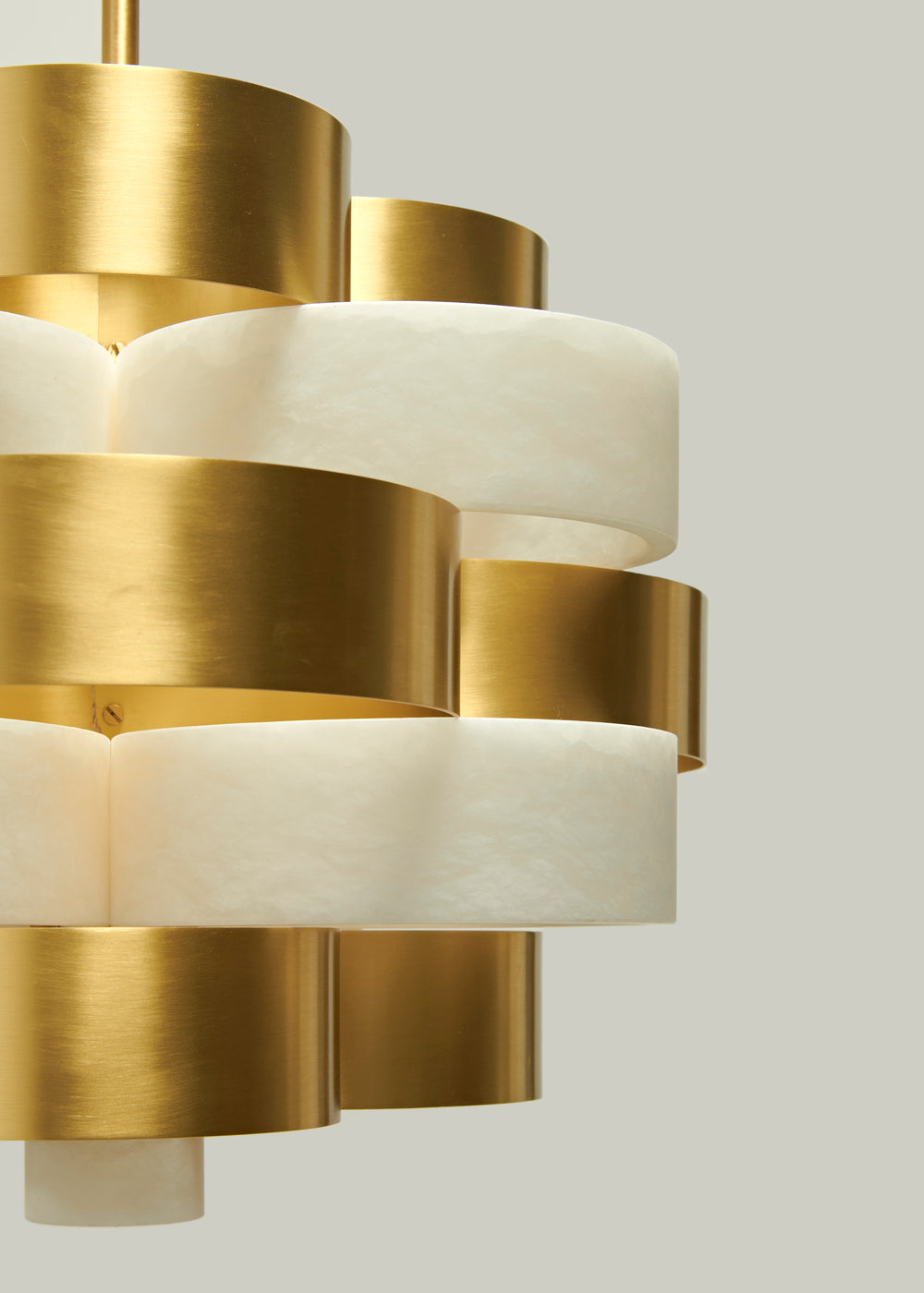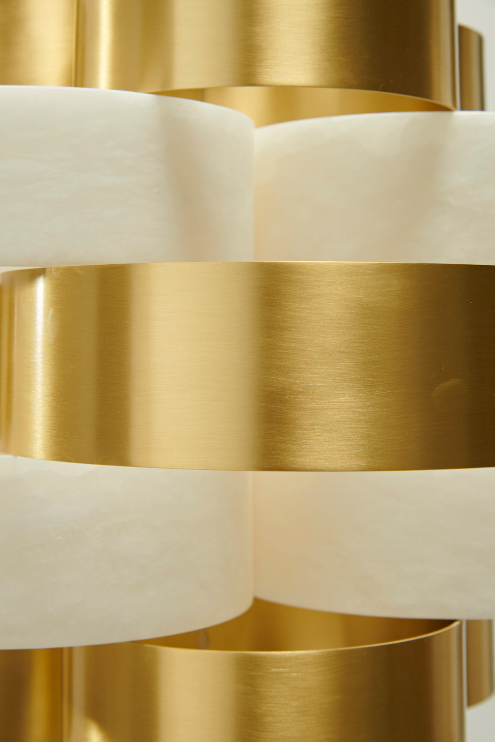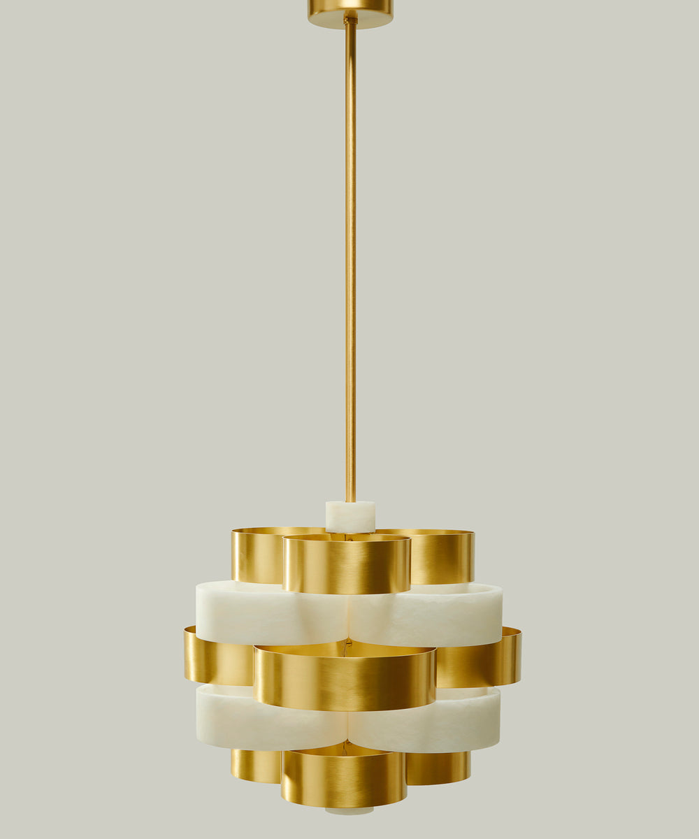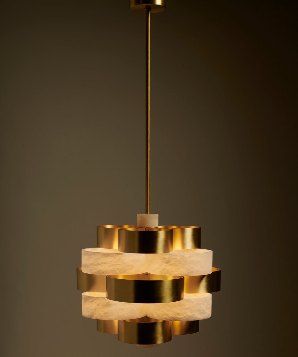 - Introducing the Vertigo Chandelier, a breathtaking pendant light that transcends mere illumination to become the defining focal point of any room. Meticulously crafted, Vertigo features a captivating spherical form composed of alternating rings of warm satin brass and pristine natural alabaster.