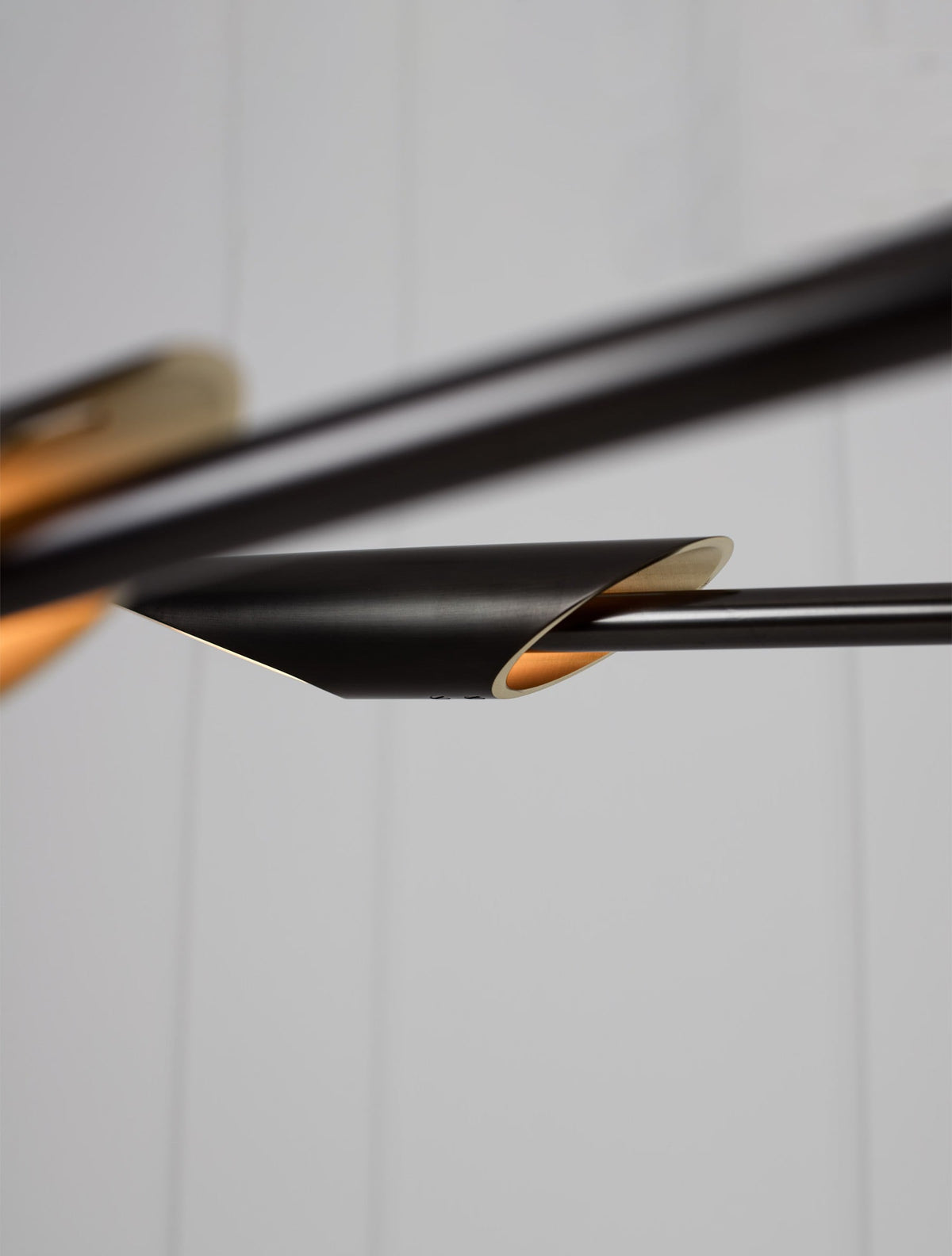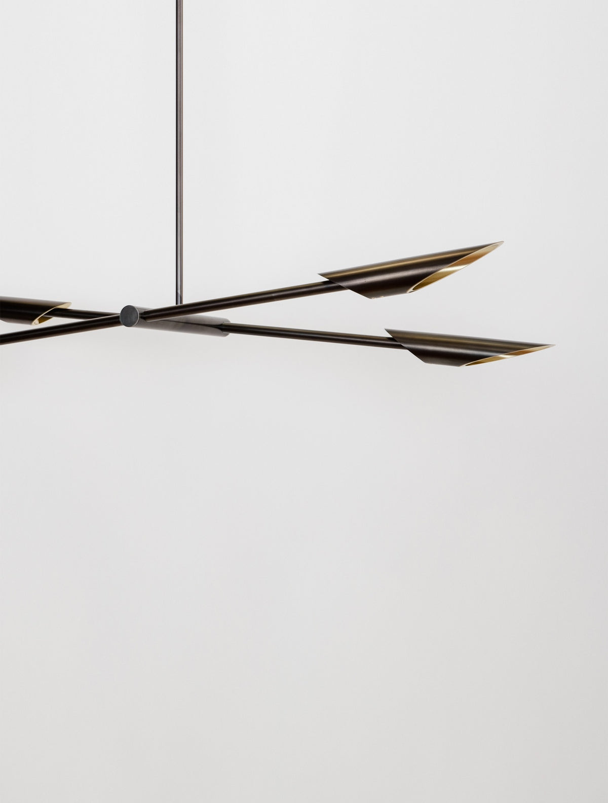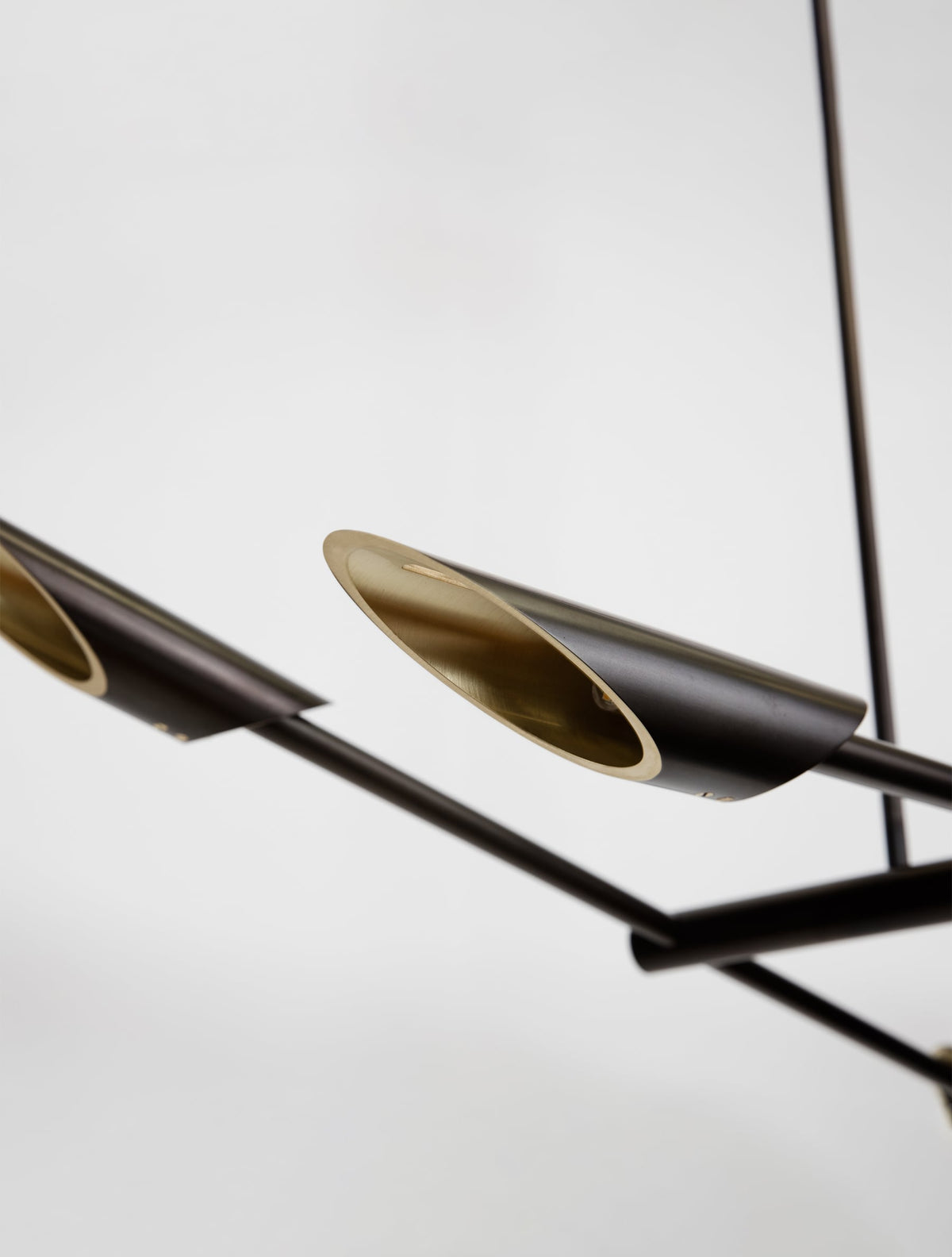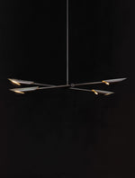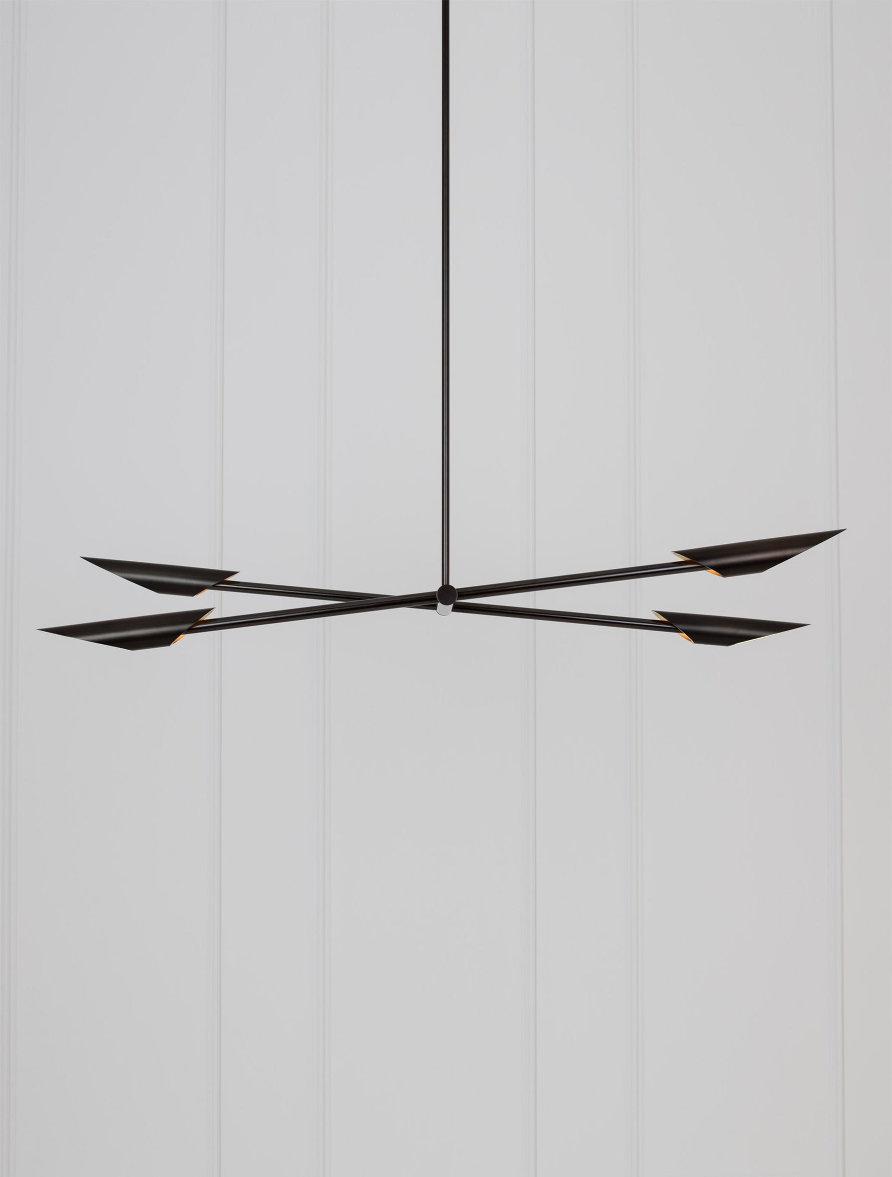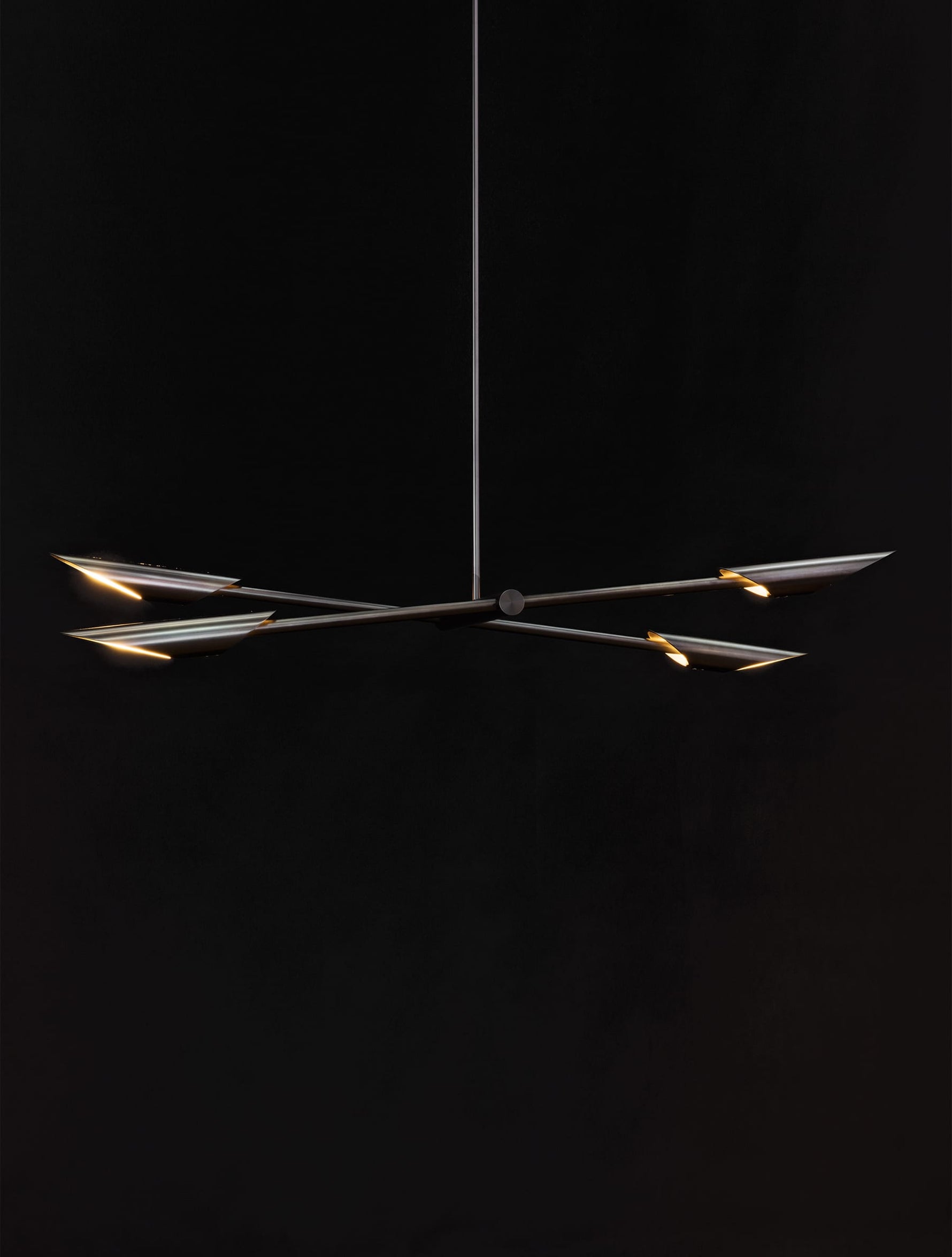 - Voyager 2 Chandelier's captivating cantilevered form features arms that sweep elegantly outward from a central core, creating a dynamic yet perfectly harmonious silhouette. Each arm is meticulously positioned to create a visually stunning display, whether the chandelier is on or off.