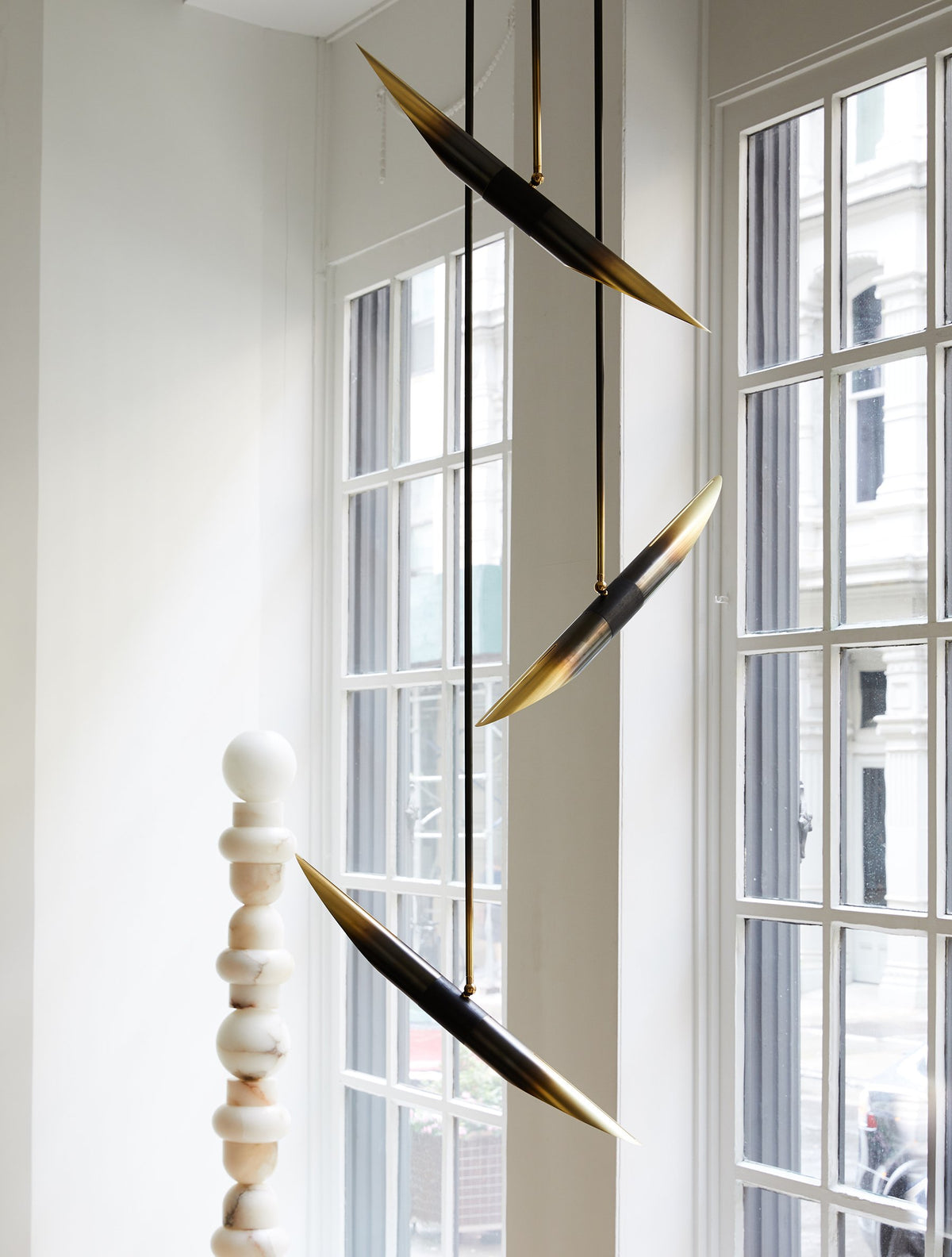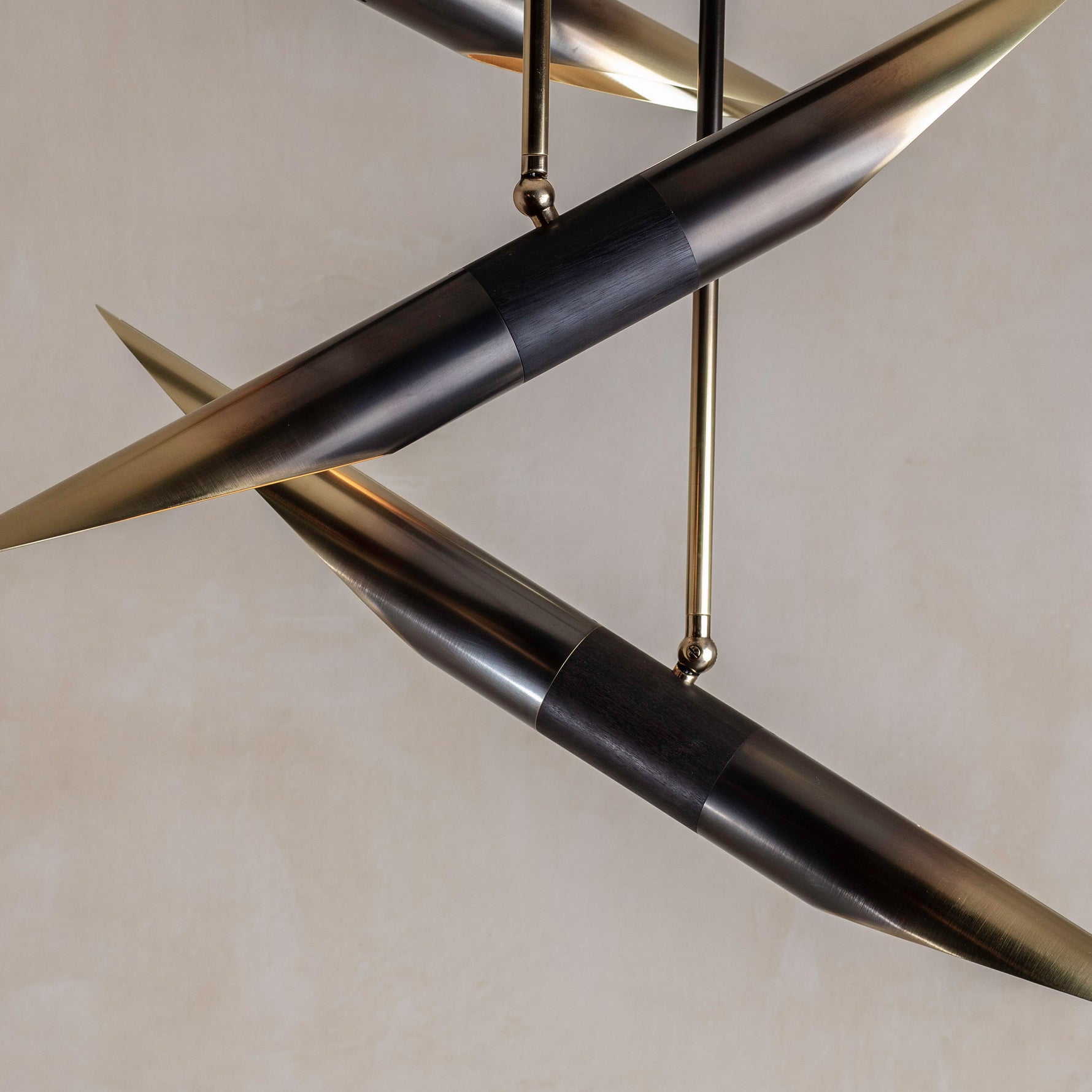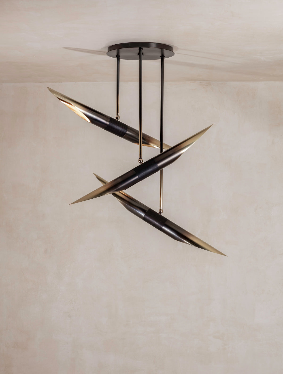 - Each chandelier features a sleek, cylindrical body crafted from solid brass. The magic, however, lies in the precision-cut, angular openings that carve through the form. From these striking geometric portals, light cascades outwards, casting dynamic, sculptural shadows and creating an ambiance of modern sophistication.