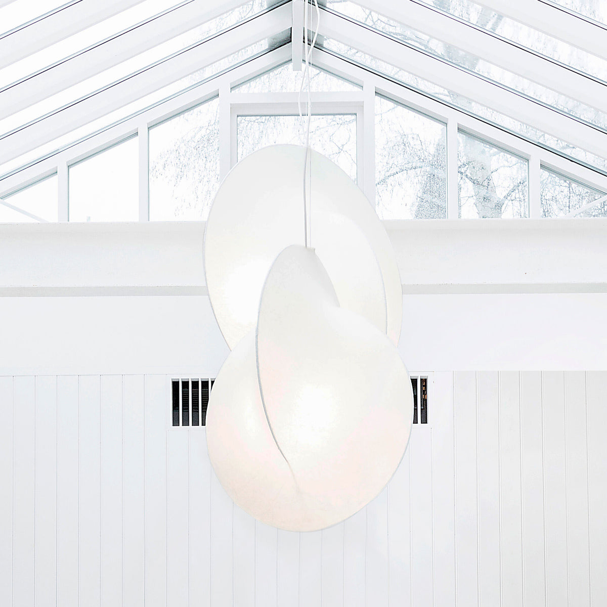 - The Overlap Suspension Lamp each lamp begins with a robust internal structure, crafted from white powder-coated steel for durability and a clean, modern base. The magic unfolds as a signature Cocoon is meticulously hand-sprayed onto the frame, creating the lamp's unique, web-like texture. This artisanal process is finished with a transparent protective spray, ensuring the delicate appearance is matched with lasting resilience.