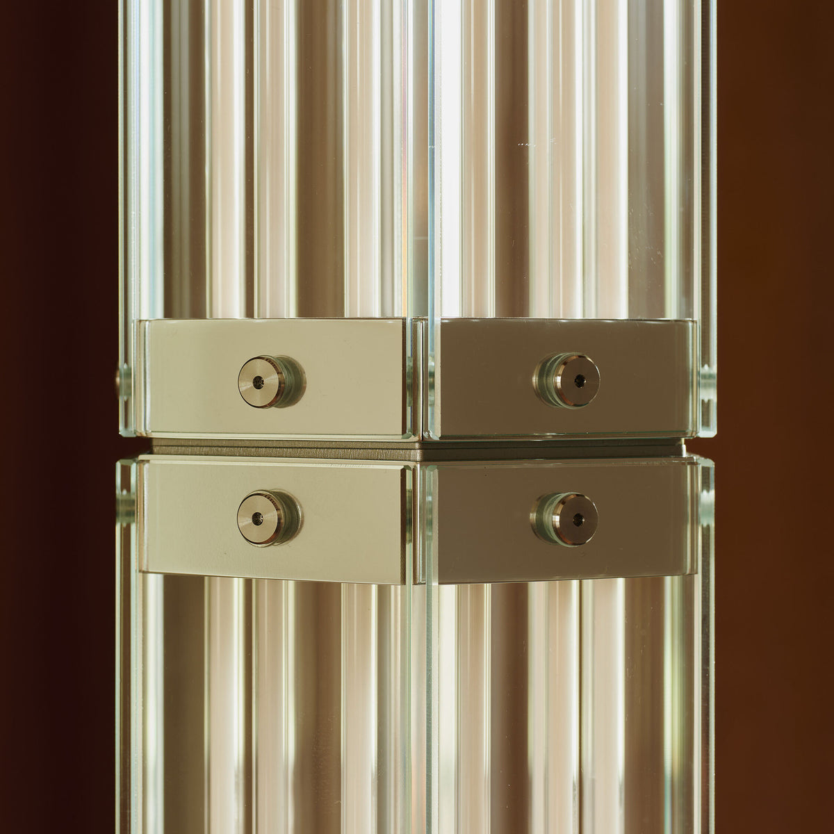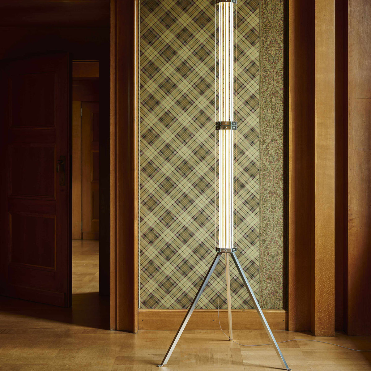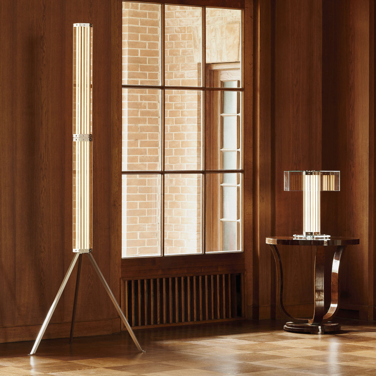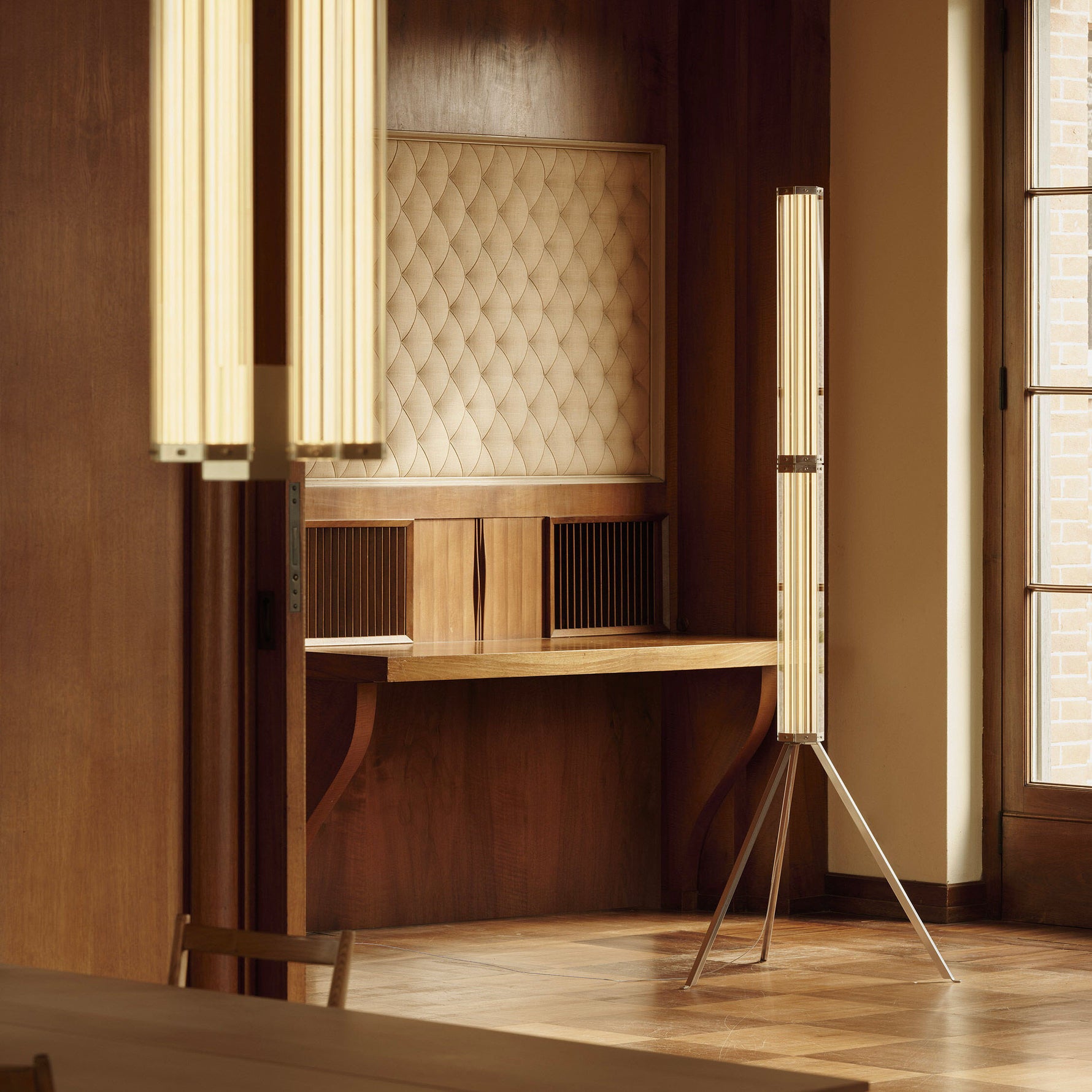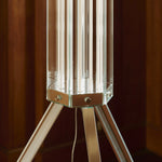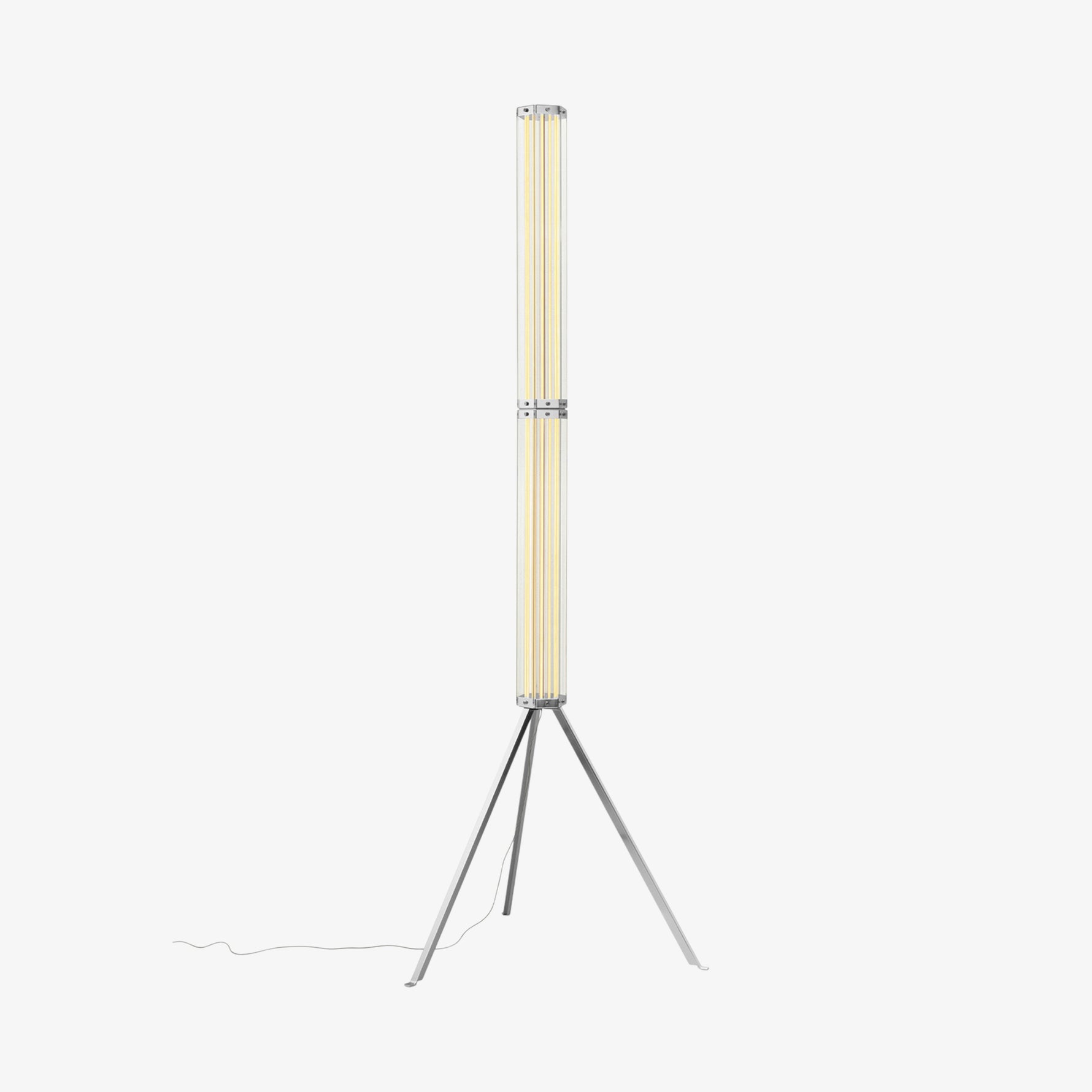 - The SuperWire Floor Lamp is a statement piece. Its design is composed of two elegant 75 cm hexagonal glass modules, stacked vertically and connected by a sleek polished aluminum spine. This luminous column rests upon a stable and iconic steel tripod base—a deliberate tribute to the historic floor lamps of the mid-century, reimagined with a bold, geometric purity.