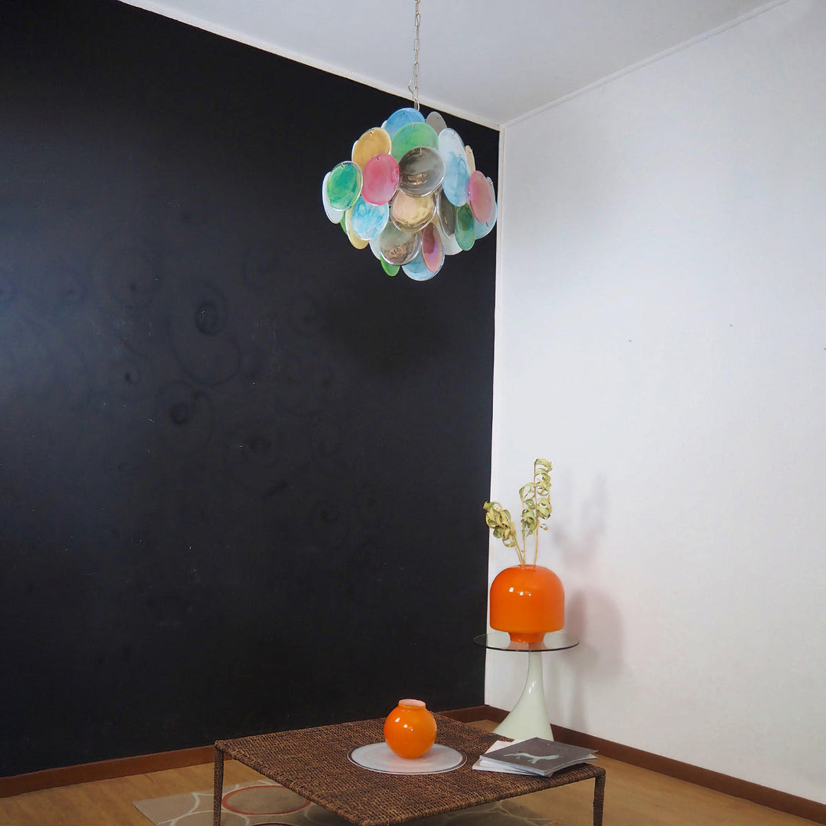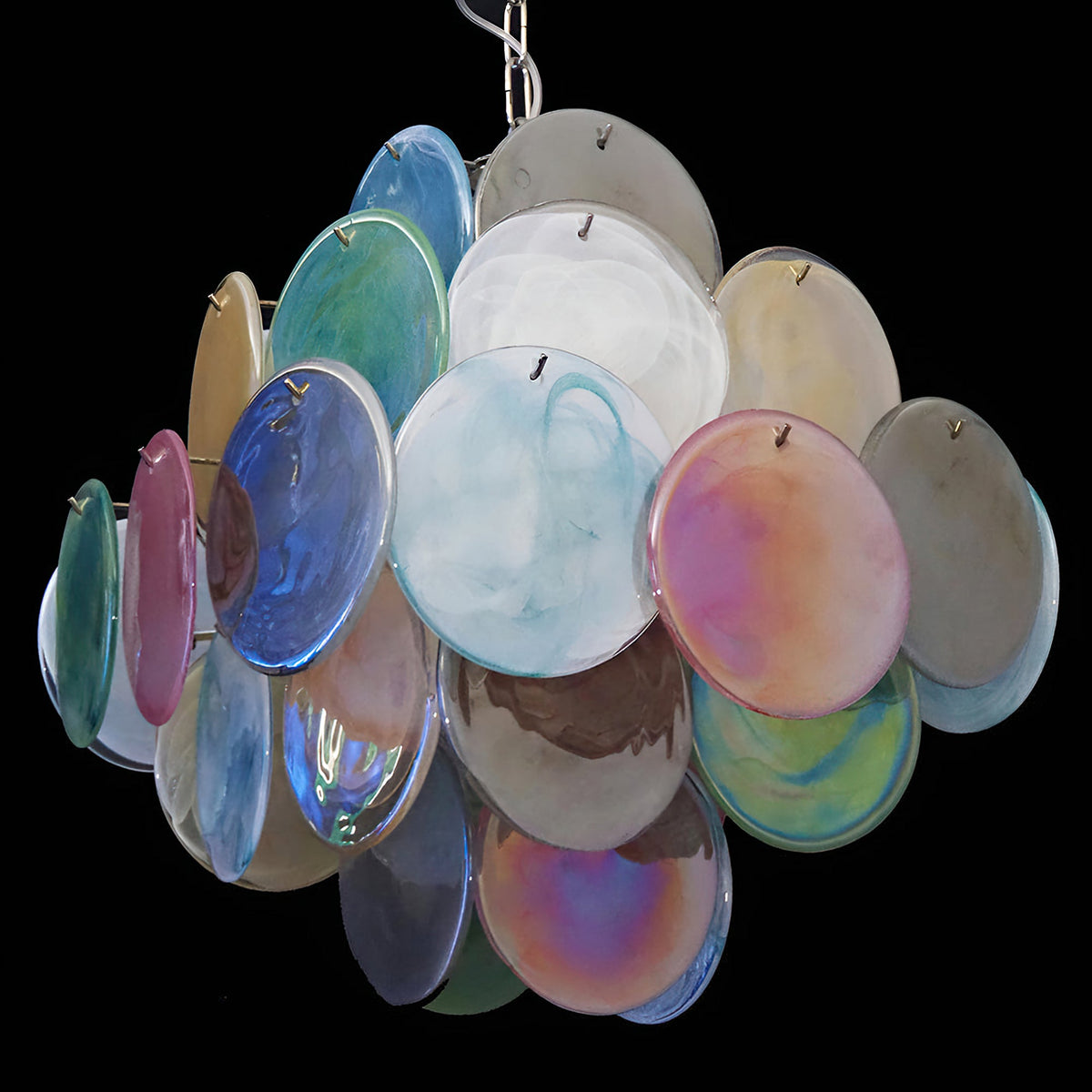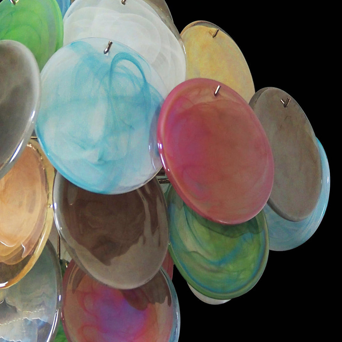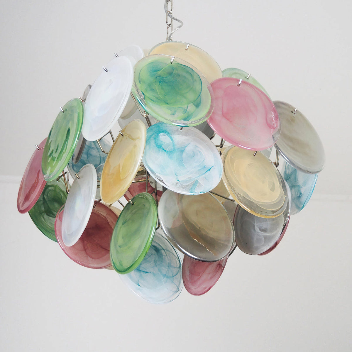 - Inspired by the legendary artisans of Murano and the soft, blended technique of sfumato, the Murano Disc Chandelier Arlecchino 36 features a stunning palette of handcrafted pink, blue, green, and yellow glass. The textured, gradient finish creates a dynamic visual depth, ensuring your fixture is a conversation starter even when unlit.