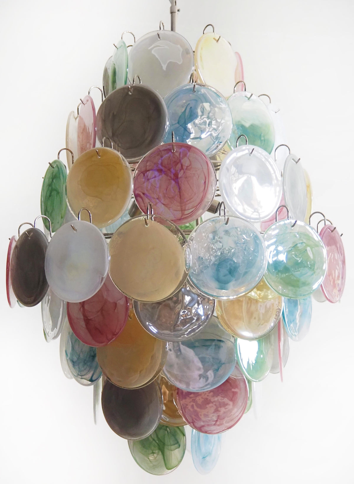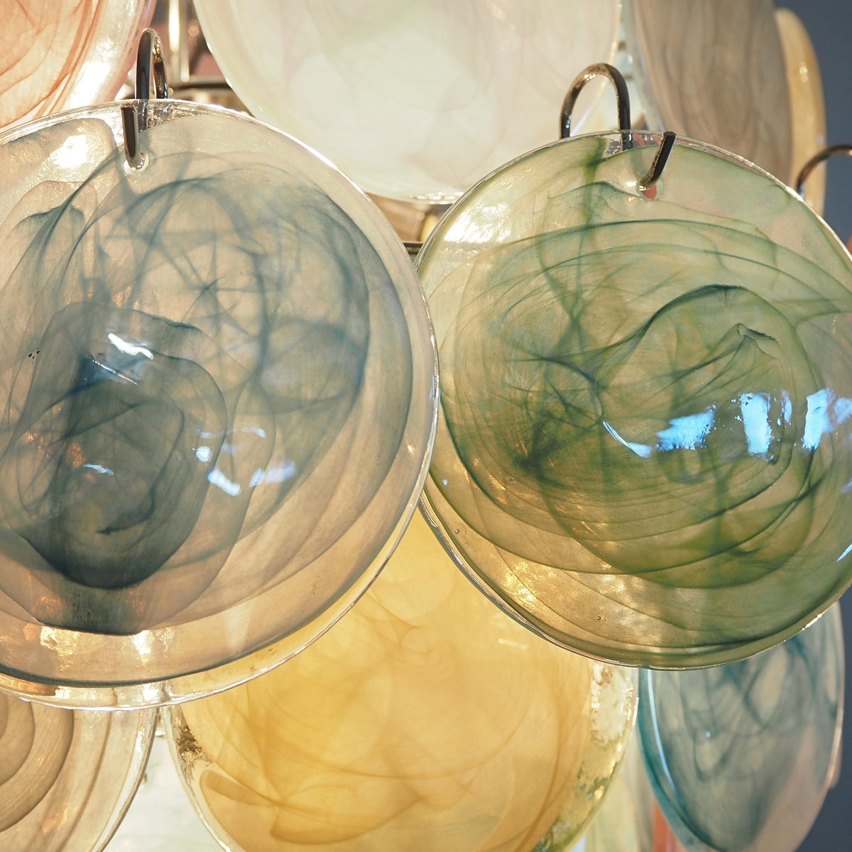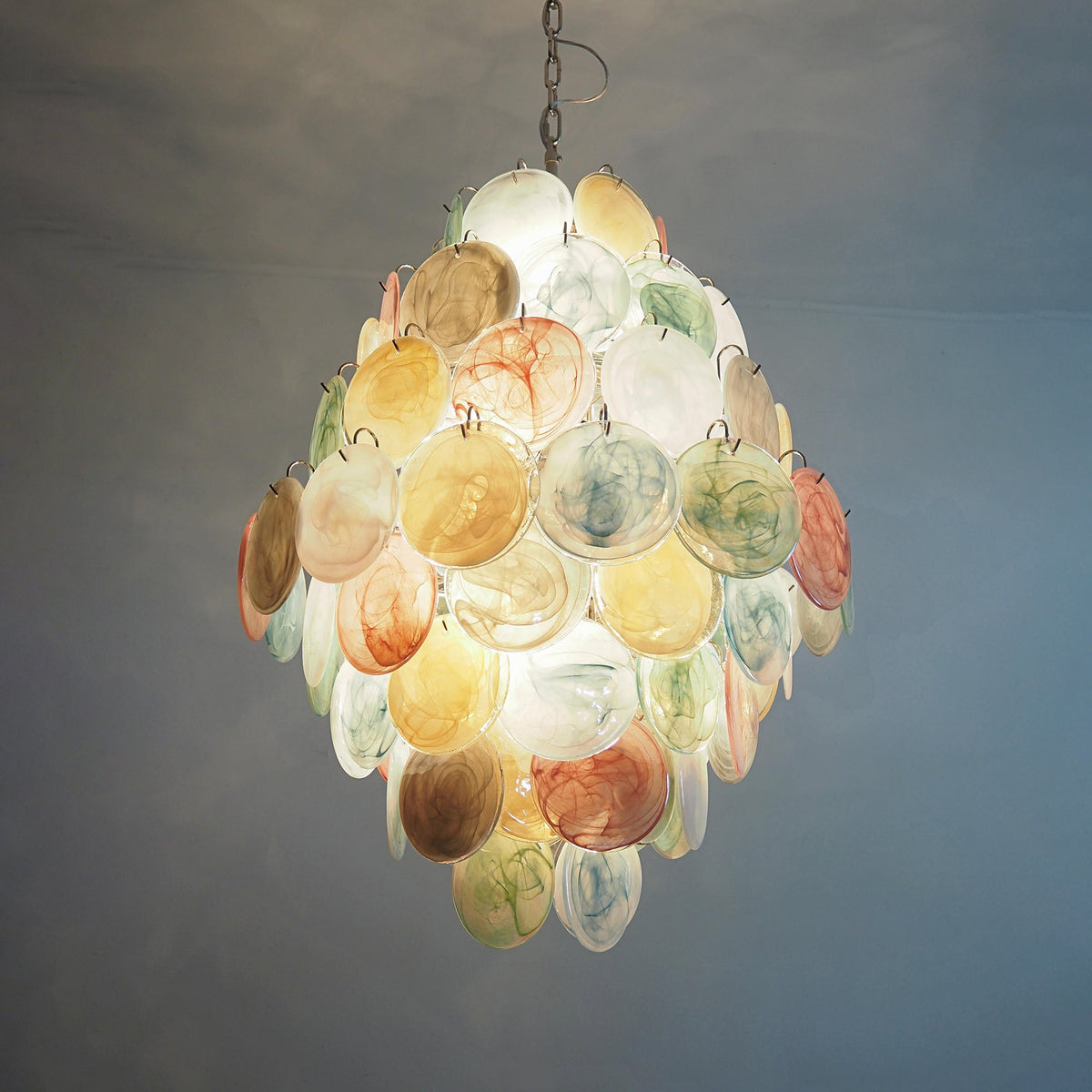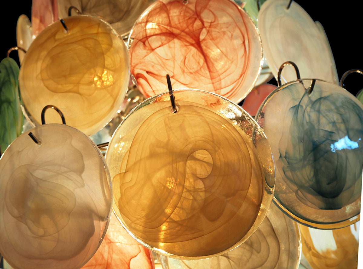 - Drawing inspiration from the centuries-old glassmaking traditions of Murano, Italy, each Murano Disc Chandelier Arlecchino 87 features an exquisite collection of hand-finished glass discs. These are not simple pieces of glass; each one is a unique canvas, boasting a deep, smoky texture and a subtle, variegated hue that captures and plays with light in its own way. The palette is a harmonious symphony of soft, pastel tones—think of the gentle blush of a setting sun, the soft warmth of primrose yellow, the tranquil whisper of seafoam green, and the serene depth of dusty blue. These colors are layered and intertwined, creating a vibrant yet soothing visual tapestry.