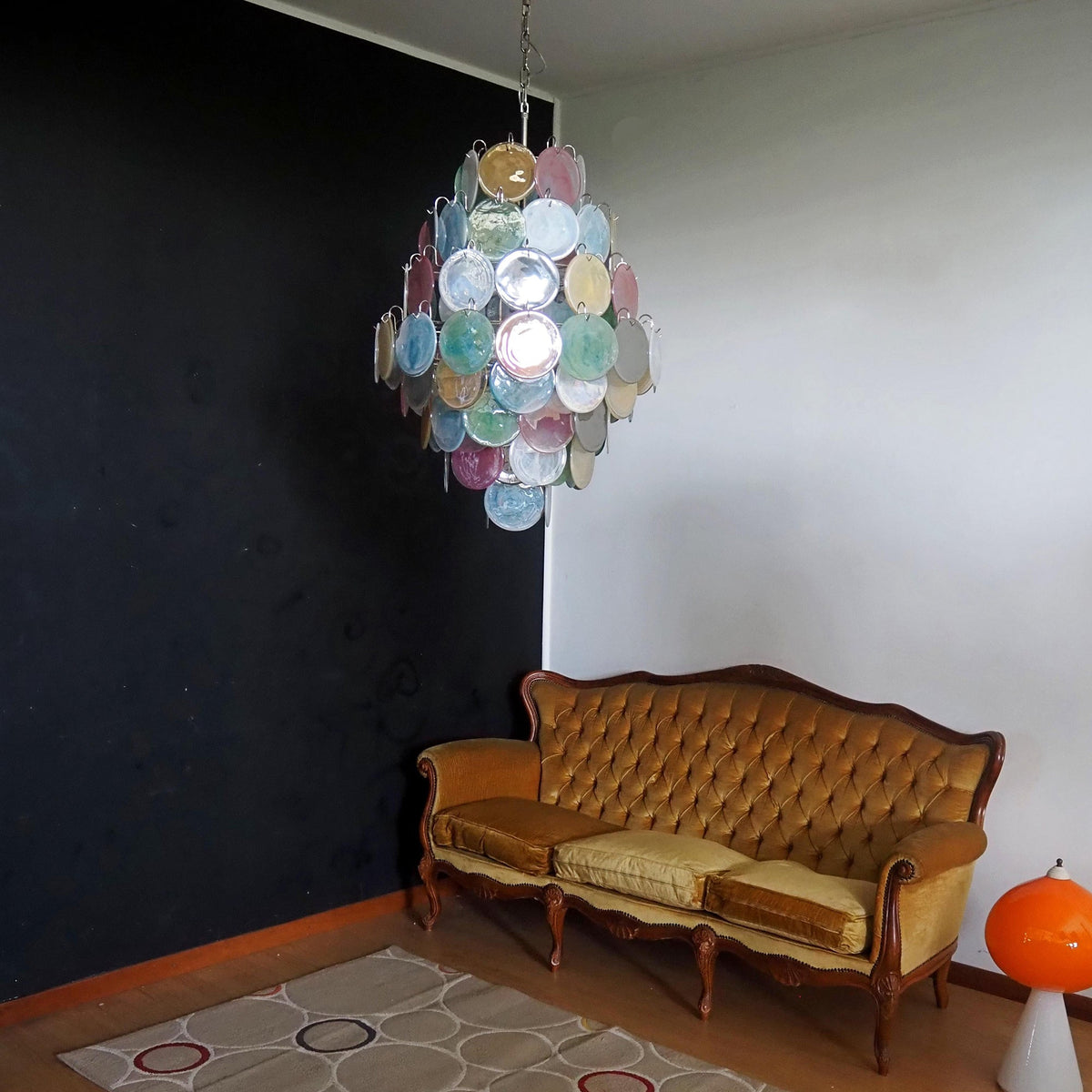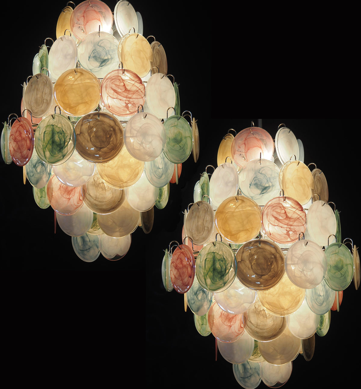 - When darkness falls, the true magic begins. As the internal light source illuminates, a warm and diffuse radiance filters through the multitude of colored, textured disks. The light is softened and tinted, casting a kaleidoscope of gentle, ambient color across your walls and ceiling. The effect is a profoundly warm and artistic atmosphere, evoking the feeling of a sun-drenched stained-glass window or a sophisticated modern art installation. Murano Disc Chandelier Arlecchino 87 provides perfect ambient lighting for dining, relaxing, or entertaining, eliminating all harshness and inviting a sense of calm and wonder.