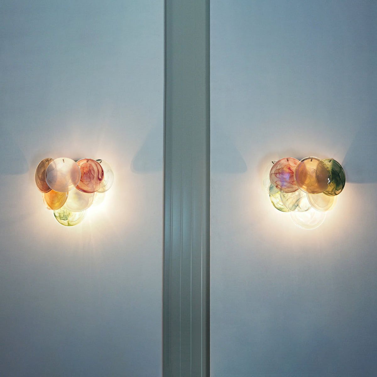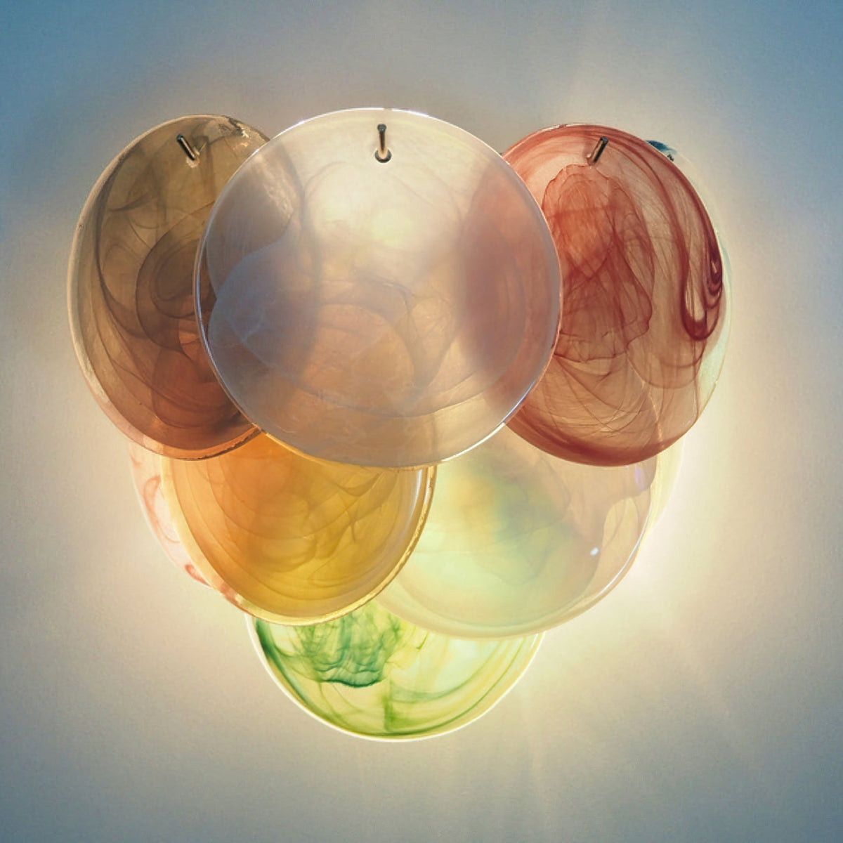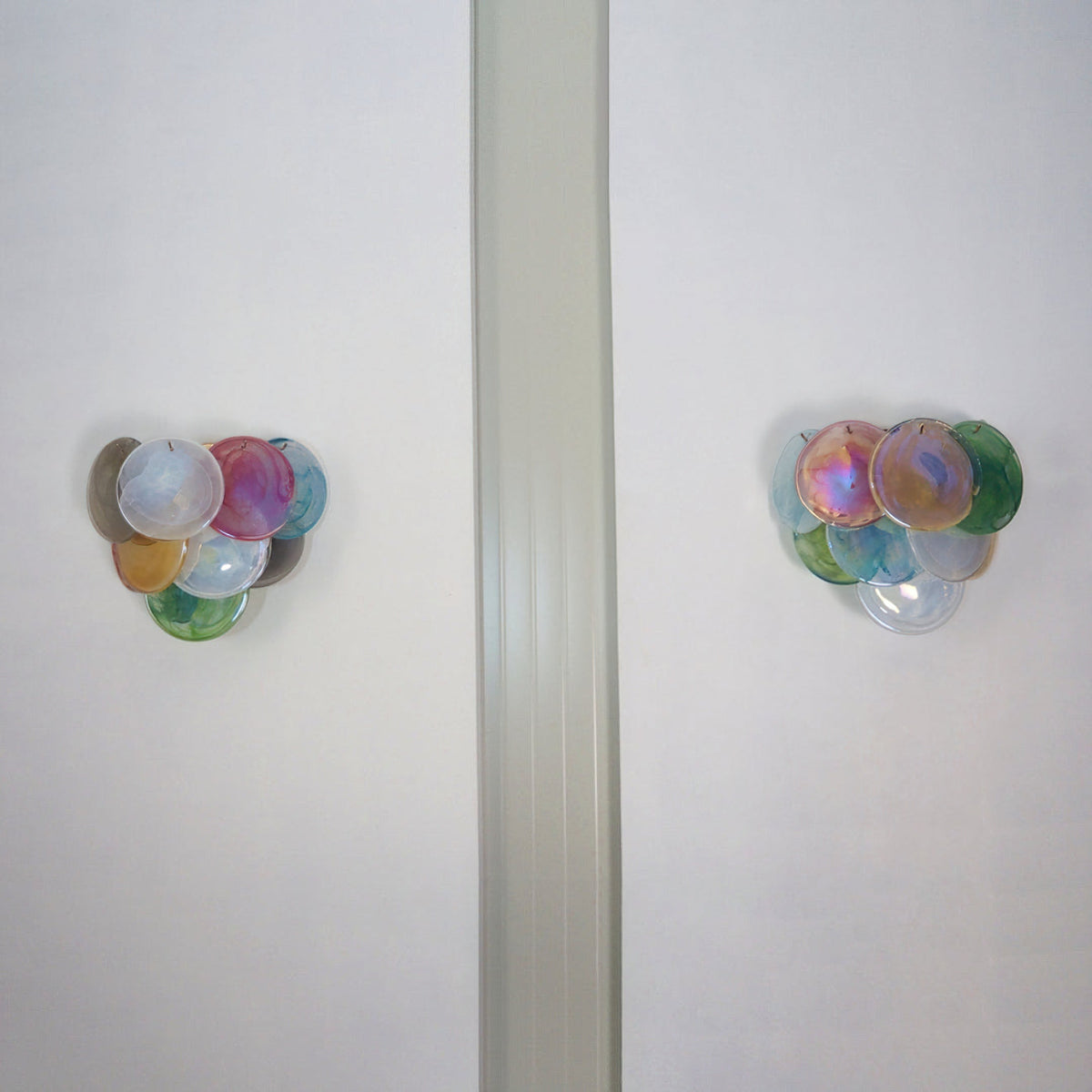 - Elevate your interior with these stunning Murano Disc Wall Sconce Colorful appliques, inspired by the iconic Vistosi style. Each wall light features 10 iridescent colorful discs, meticulously crafted from Murano glass. Murano Disc Wall Sconce Colorful's unique composition reflects a mesmerizing spectrum of colors, transforming your space into a captivating work of art. These sconces are a perfect blend of timeless design and artisanal craftsmanship, adding a touch of luxury and sophistication to any room.