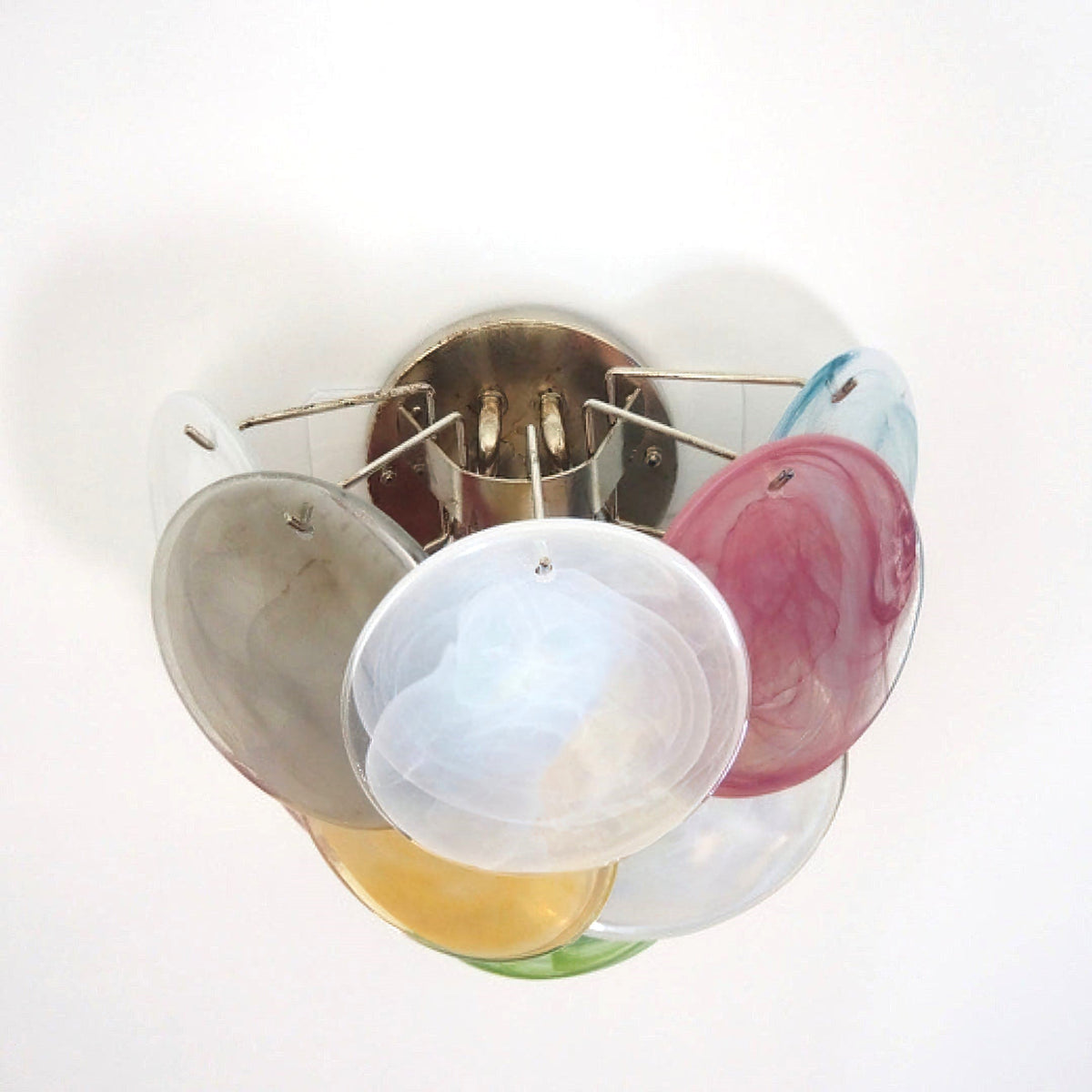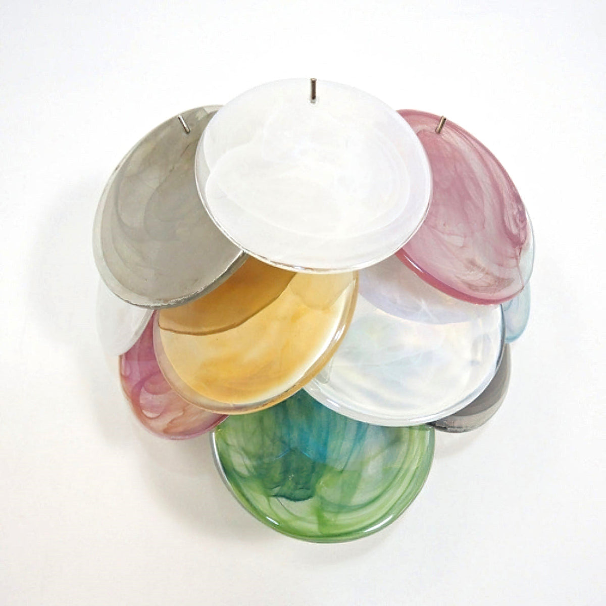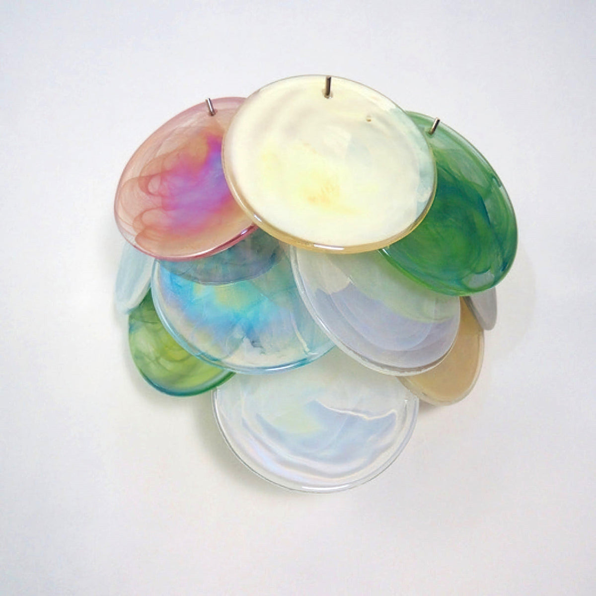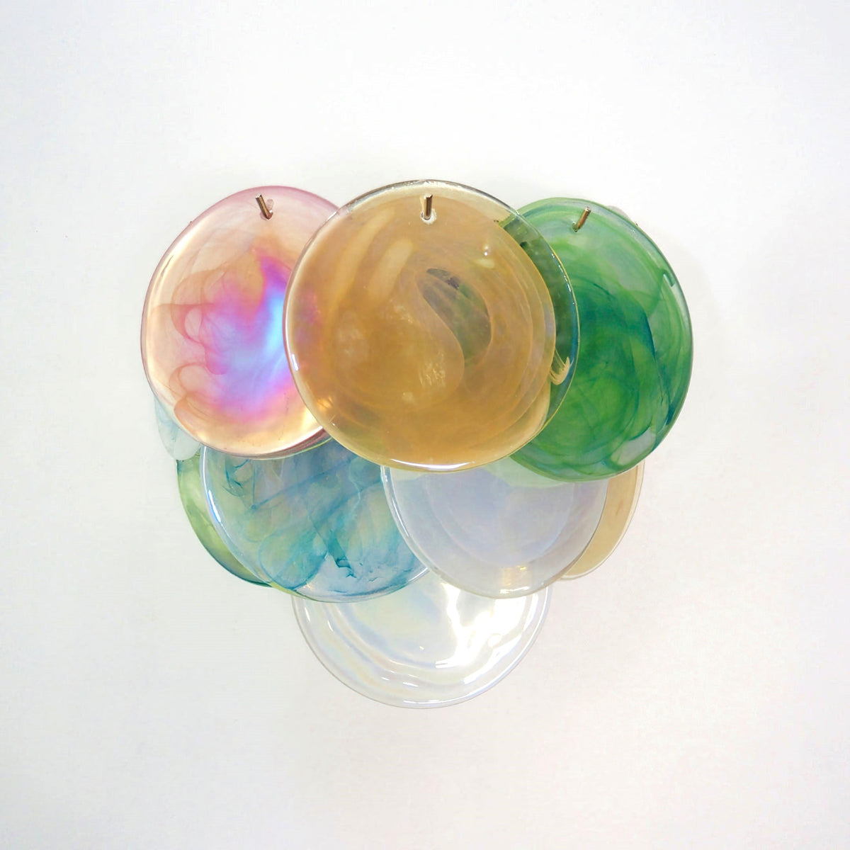 - Elevate your interior with these stunning Murano Disc Wall Sconce Colorful appliques, inspired by the iconic Vistosi style. Each wall light features 10 iridescent colorful discs, meticulously crafted from Murano glass. Murano Disc Wall Sconce Colorful's unique composition reflects a mesmerizing spectrum of colors, transforming your space into a captivating work of art. These sconces are a perfect blend of timeless design and artisanal craftsmanship, adding a touch of luxury and sophistication to any room.
