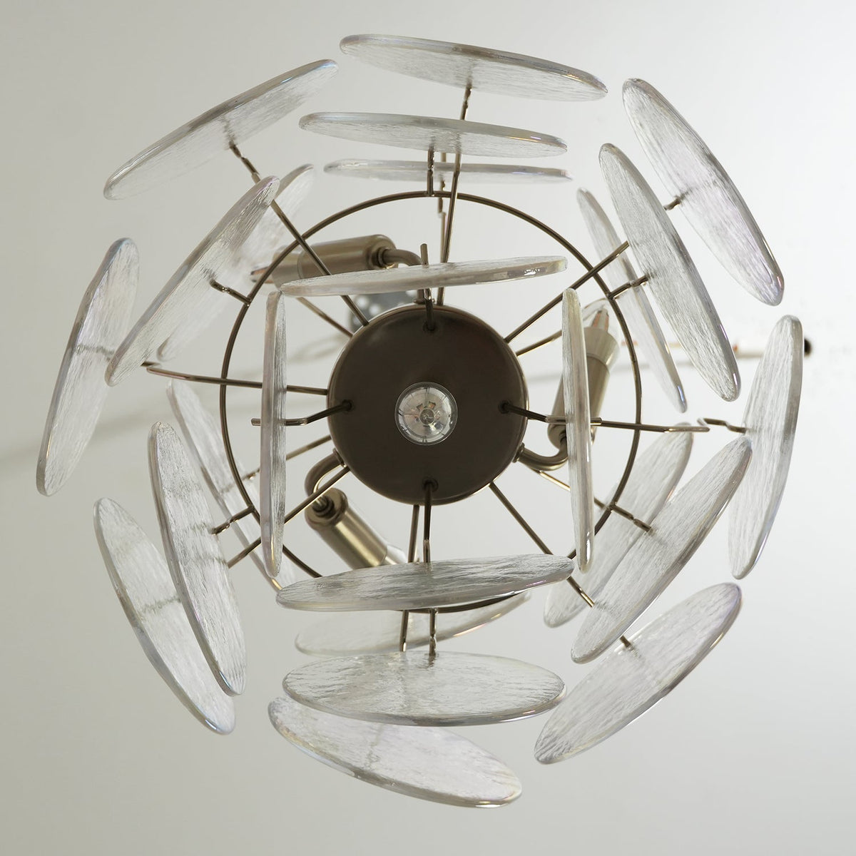- Crafted with meticulous attention to detail, the Murano Iridescent Grit Disc Chandelier 24 features a symphony of countless hand-finished glass discs. Each disc is uniquely textured, catching the light from every angle to create a delicate play of transparency and reflection. When sunlight streams into the room, it hints at the potential within, glinting softly. Once illuminated, however, the true magic unfolds: light travels through each textured pane, refracting into a soft, shimmering multicolored halo that dances across your walls and ceiling. This iridescent effect ensures your fixture is never static, but a dynamic element that brings a sense of wonder and elegance to your everyday moments.