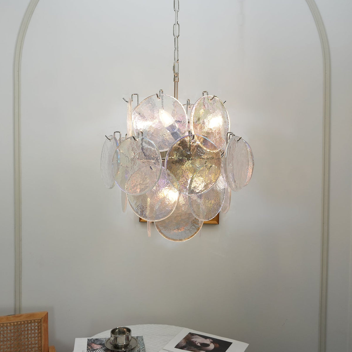 - Bask in the radiant glow of a modern masterpiece. Our Murano Iridescent Grit Disc Chandelier 24 is more than a lighting fixture; it is a captivating sculpture of light and color, designed to become the soul of your interior space. Drawing inspiration from the centuries-old glassmaking traditions of Murano, Italy, this chandelier reinterprets classic artistry for the contemporary home, offering a dazzling display that evolves with the changing light of day.