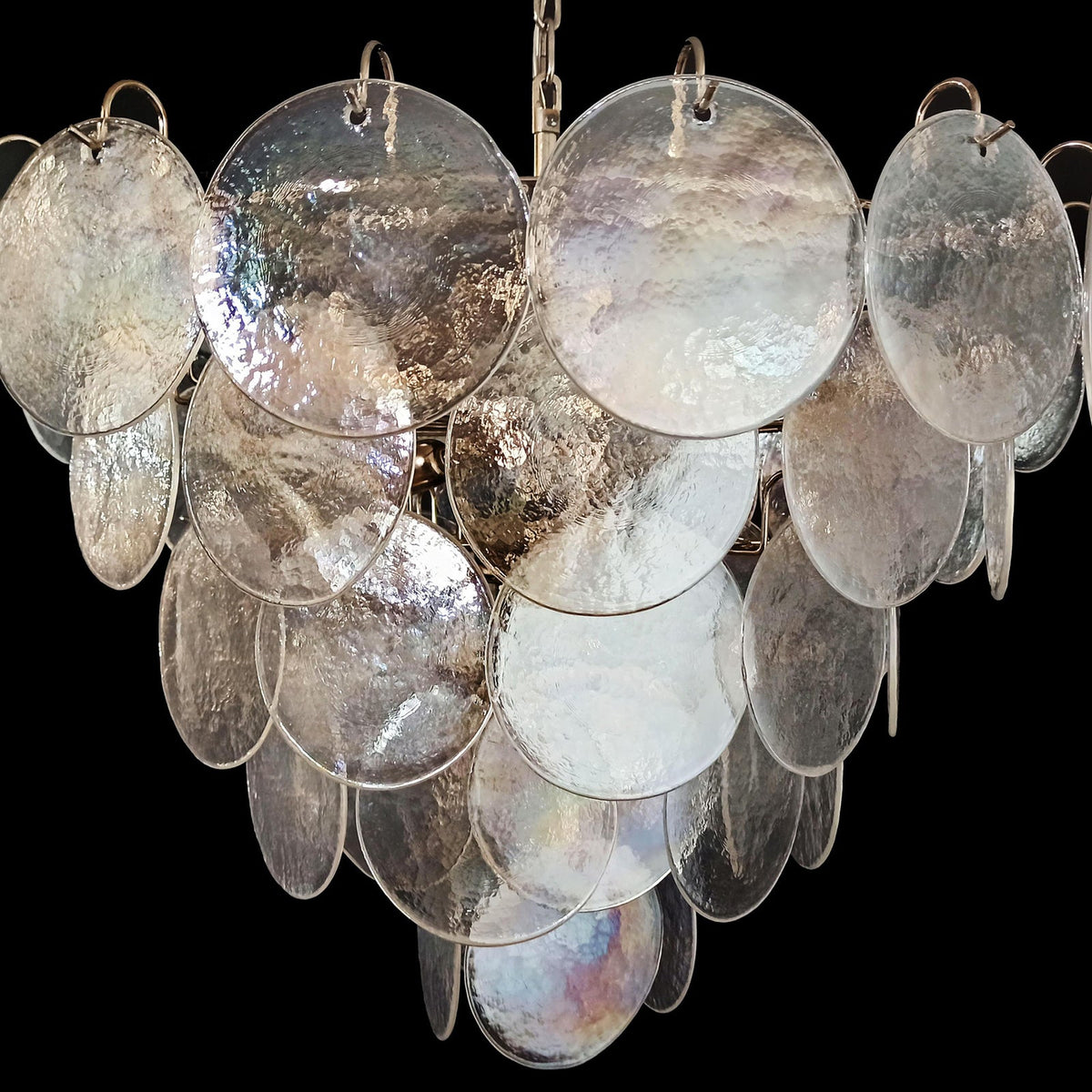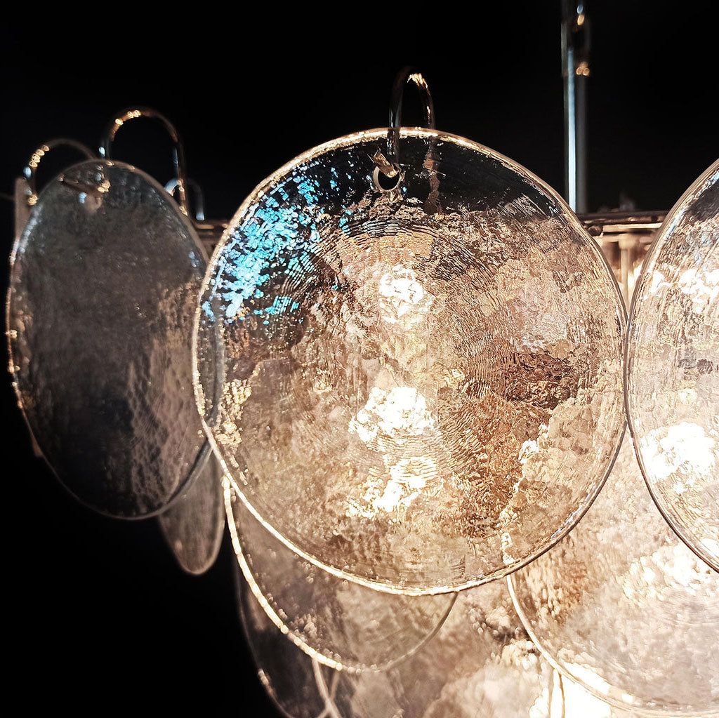 - Each component of Murano Iridescent Grit Disc Chandelier 57 tells a story of superior craftsmanship.Features multiple pieces of clear, textured glass. Each disc boasts a unique, delicate grain that resembles natural carvings, ensuring your piece is one-of-a-kind.