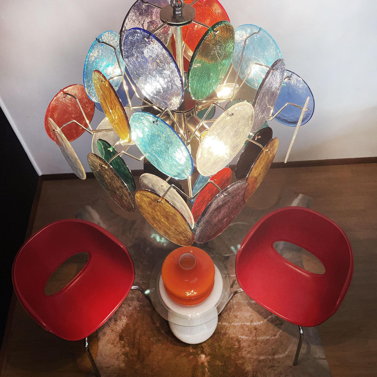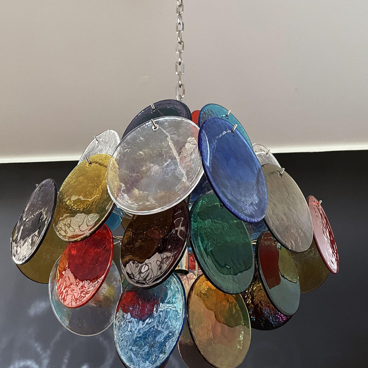- Transform your space into a gallery of light with our breathtaking Murano Multicolored Disc Chandelier 36. This fixture transcends ordinary lighting, embodying the spirit of Venetian glassblowing artistry to create a dynamic and immersive centerpiece. Each glance reveals a new interplay of color, texture, and radiance, making it a true conversation starter.