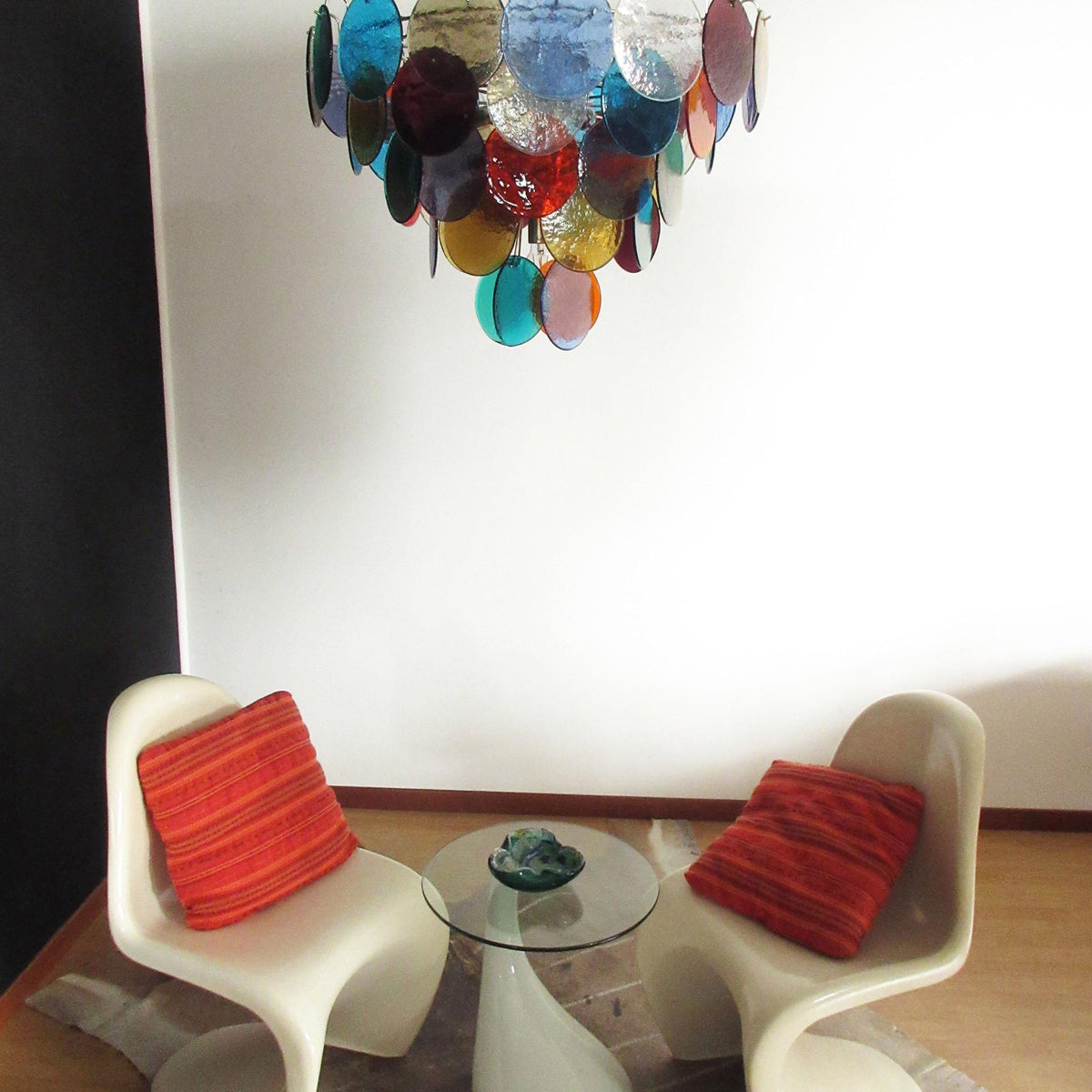- Inspired by the legendary glassblowers of Murano, the Murano Multicolored Disc Chandelier 57 features a rich tapestry of handcrafted colored glass discs in vibrant red, deep green, brilliant blue, and sunny yellow. Each piece of glass boasts a unique, intricate texture, creating a mesmerizing visual pattern that delights the eye even when the light is off. The overall effect is that of a stunning, permanent stained-glass installation.
