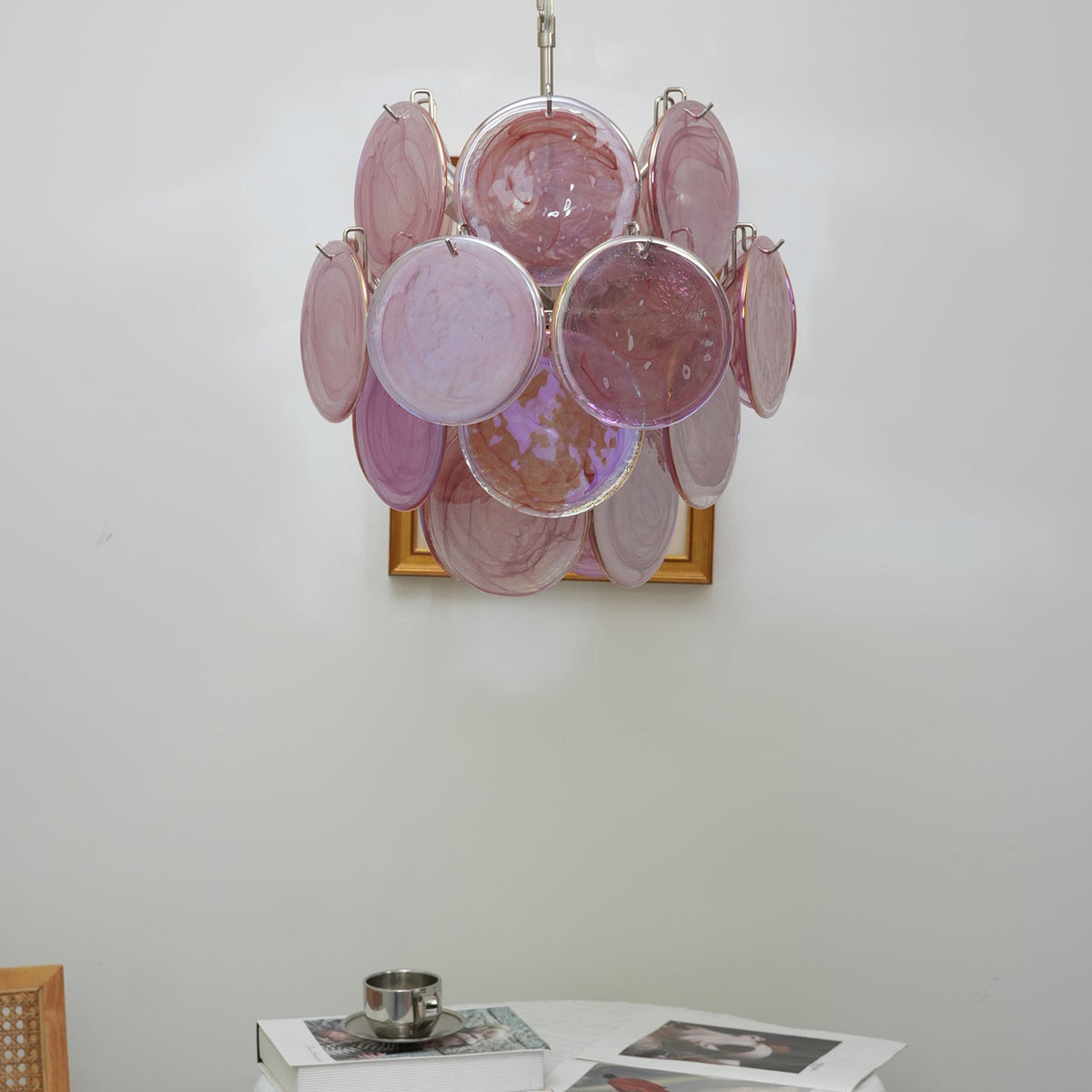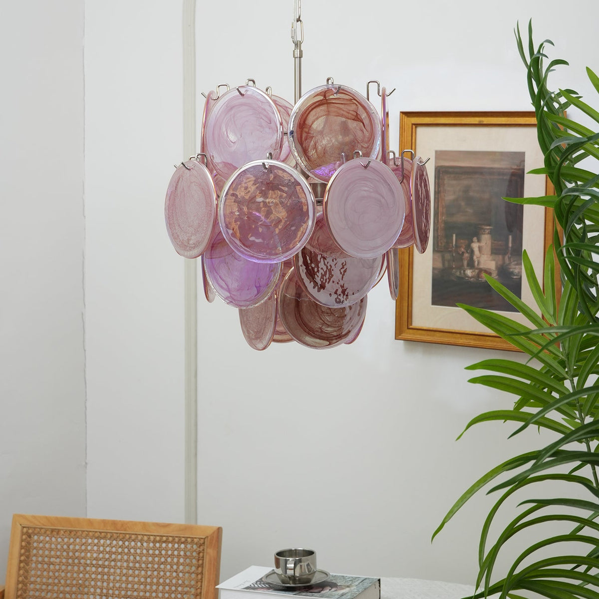 - Elevate your interior décor with the exquisite Murano Pink Disc Chandelier 24, a masterpiece where timeless artistry meets modern design. This stunning fixture features a harmonious blend of a sturdy iron frame and dozens of delicately crafted glass discs, creating a sculptural piece that is as beautiful illuminated as it is unlit. Designed to be a captivating focal point, it infuses any room with an aura of sophisticated romance and warm, inviting light.