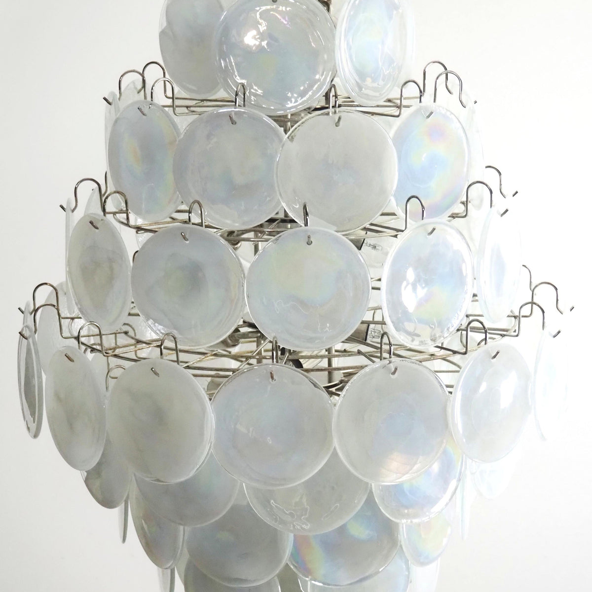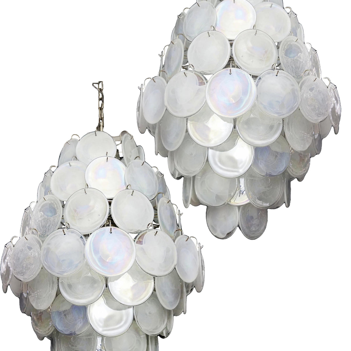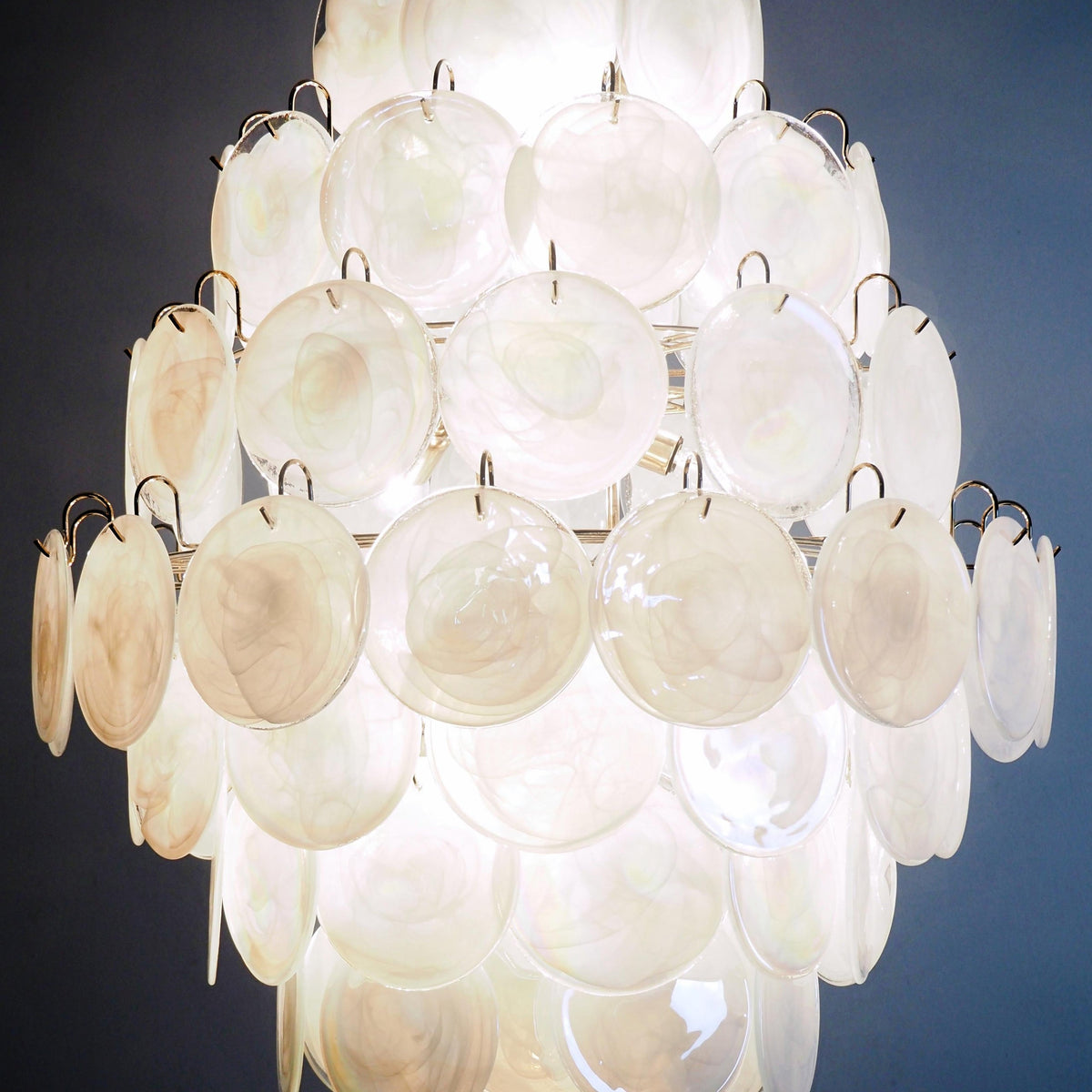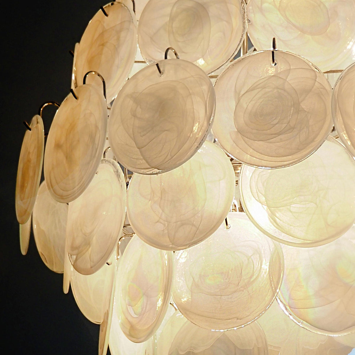 - Breathe elegance and artistry into your space with the stunning Murano White Disc Chandelier 87. This masterpiece of light and design combines robust iron structure with the delicate beauty of hand-finished glass, creating a focal point that is as functional as it is breathtaking.