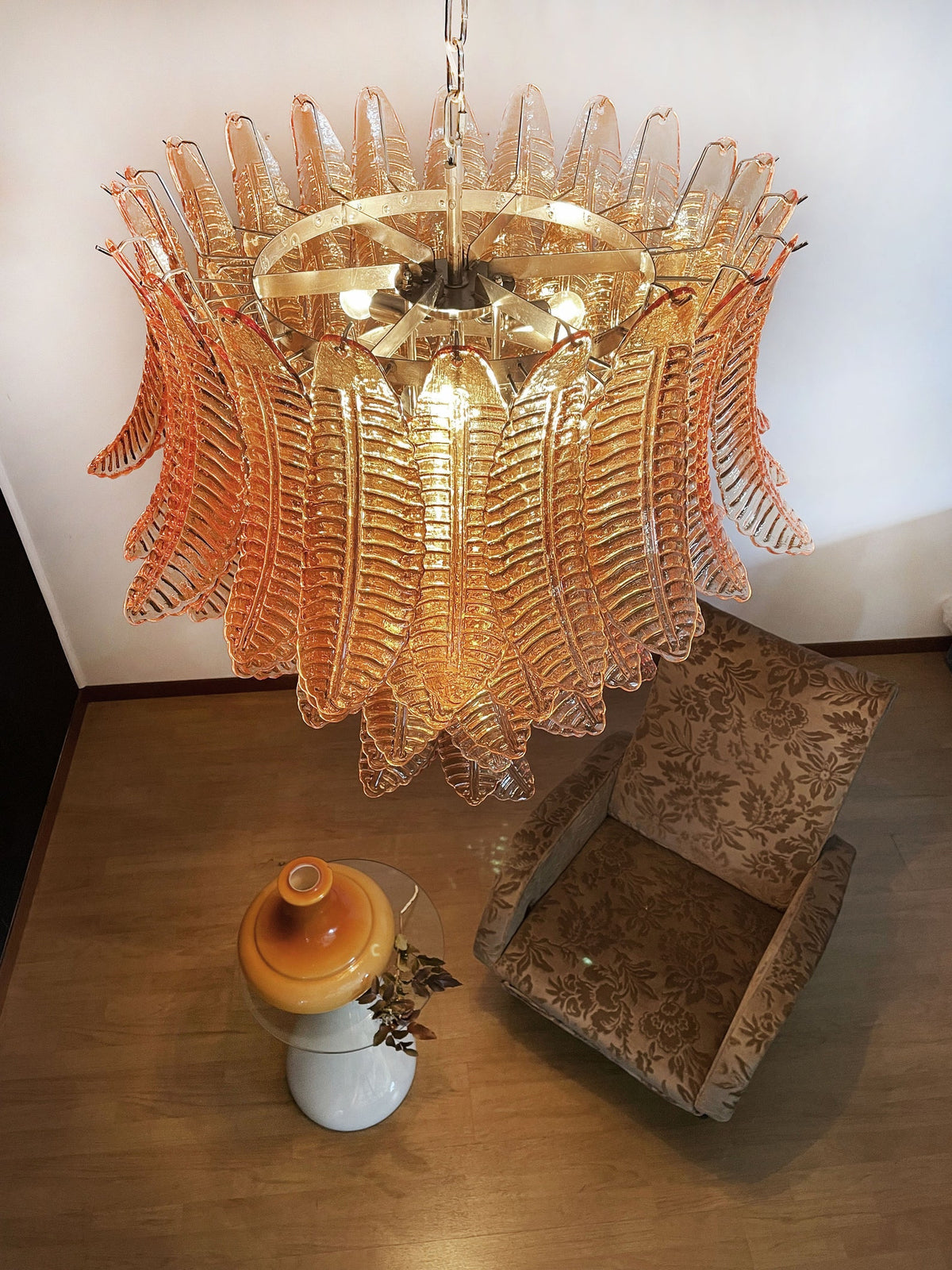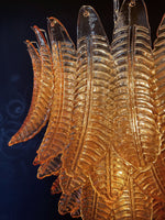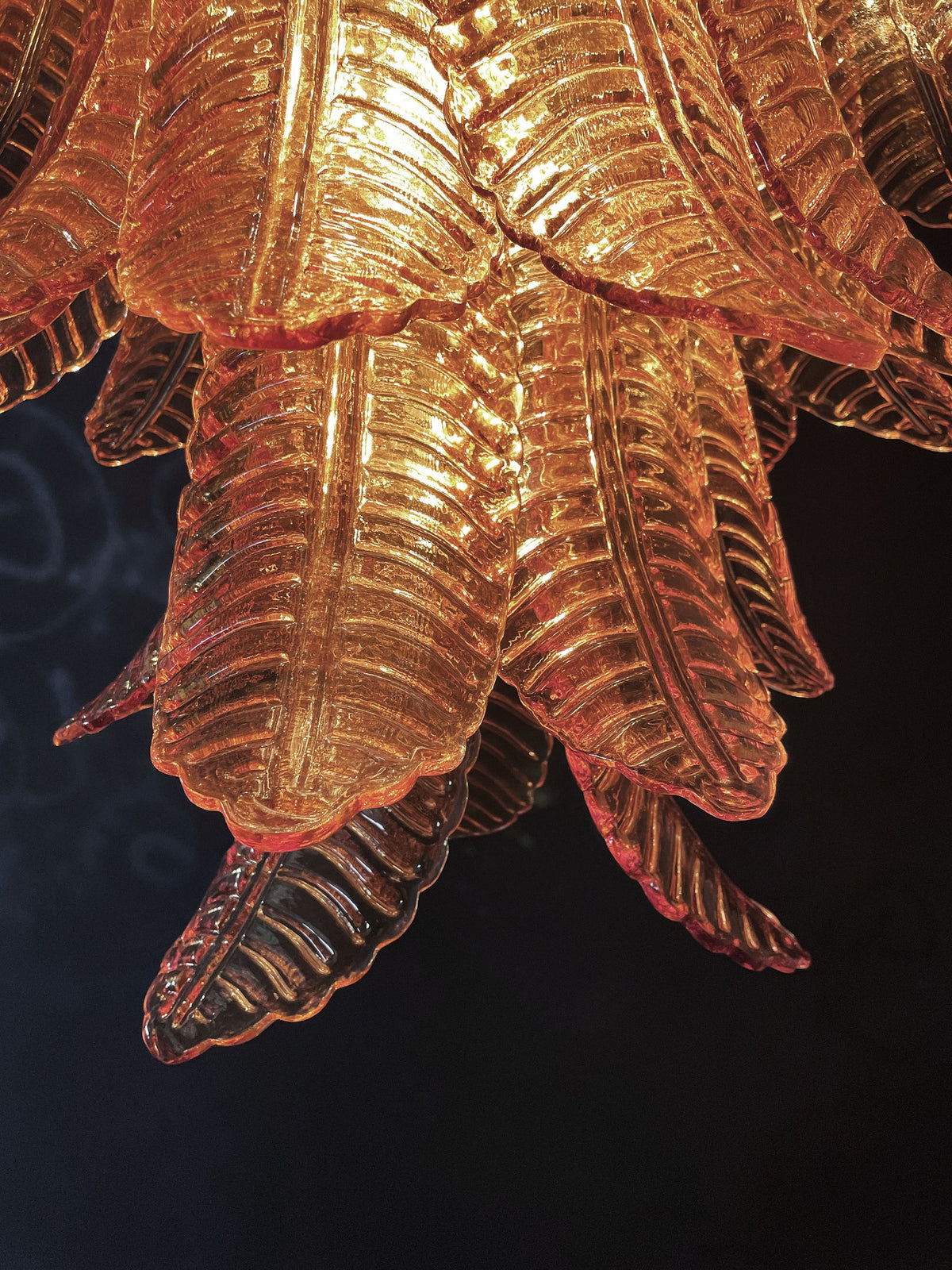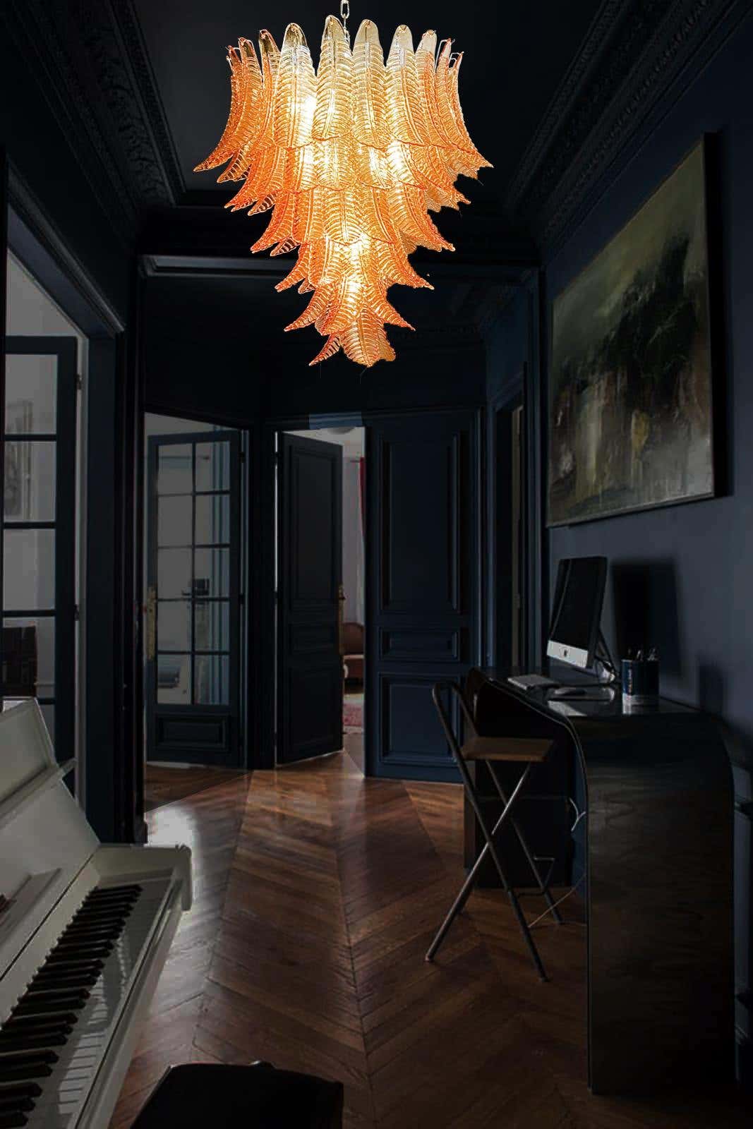 - Imagine a cascade of 75 individually crafted amber glasses, each one a unique work of art. The Felci Murano Glass Chandelier commands attention, casting a warm, golden, and inviting glow that transforms any room into a palatial setting. The rich amber hue evokes a sense of timeless elegance, reminiscent of a Venetian sunset, and adds a touch of sophisticated warmth to grand entrances, formal dining rooms, and luxury living areas.