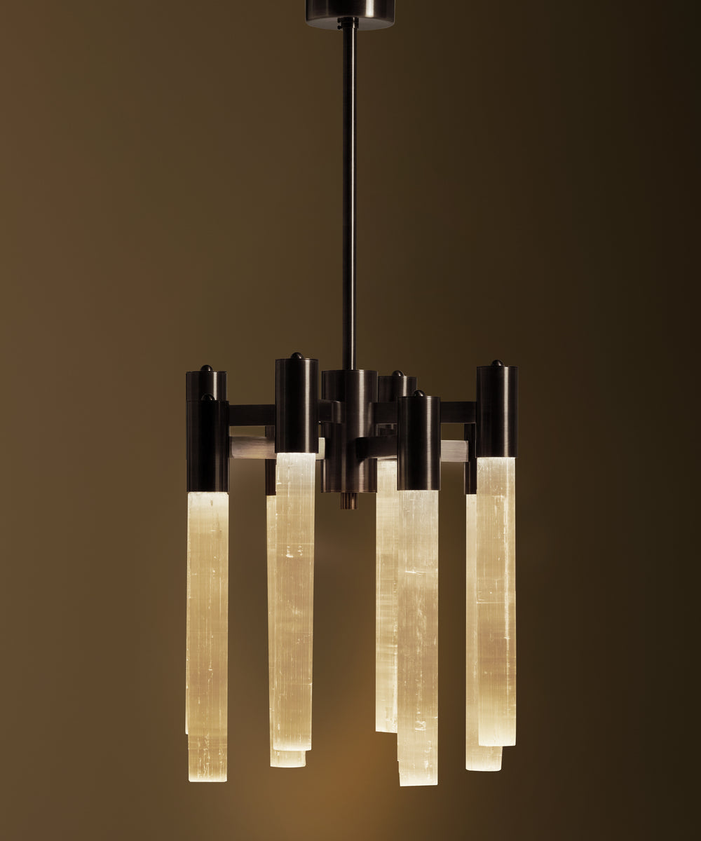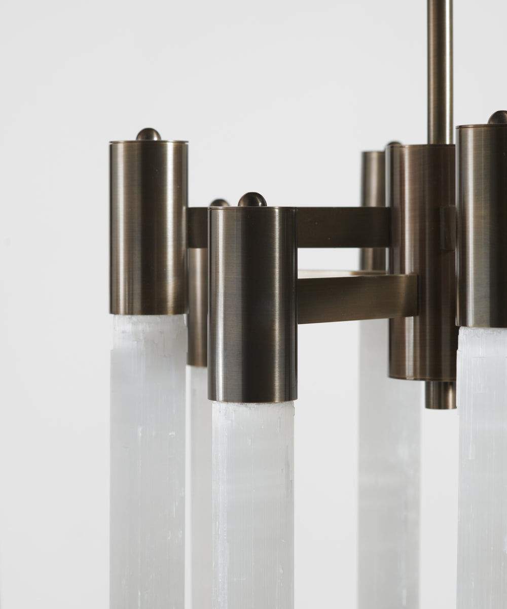 - Each cylindrical diffuser is crafted from genuine Selenite, a mineral known for its distinct, irregular striations. When illuminated, light passes through this crystalline structure, highlighting its natural, organic texture and creating a soft, enchanting glow. A key property of Selenite is its ability to transmit light with minimal power loss, ensuring the chandelier emits a beautifully potent and luminous output.