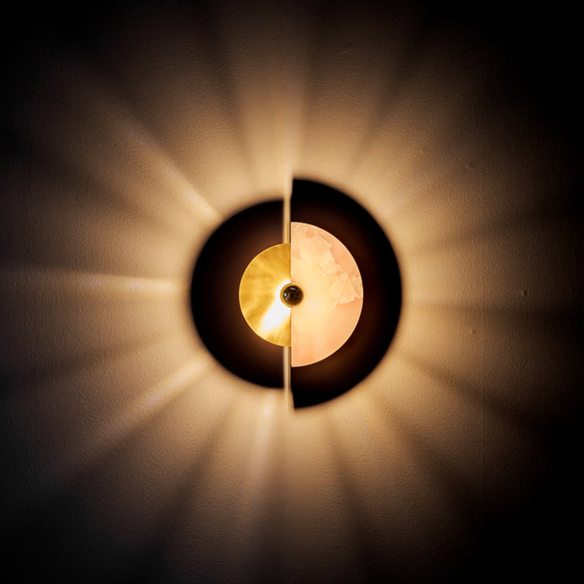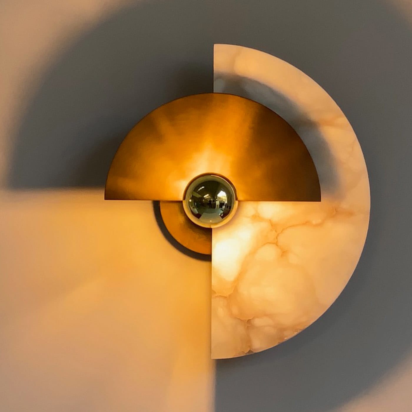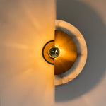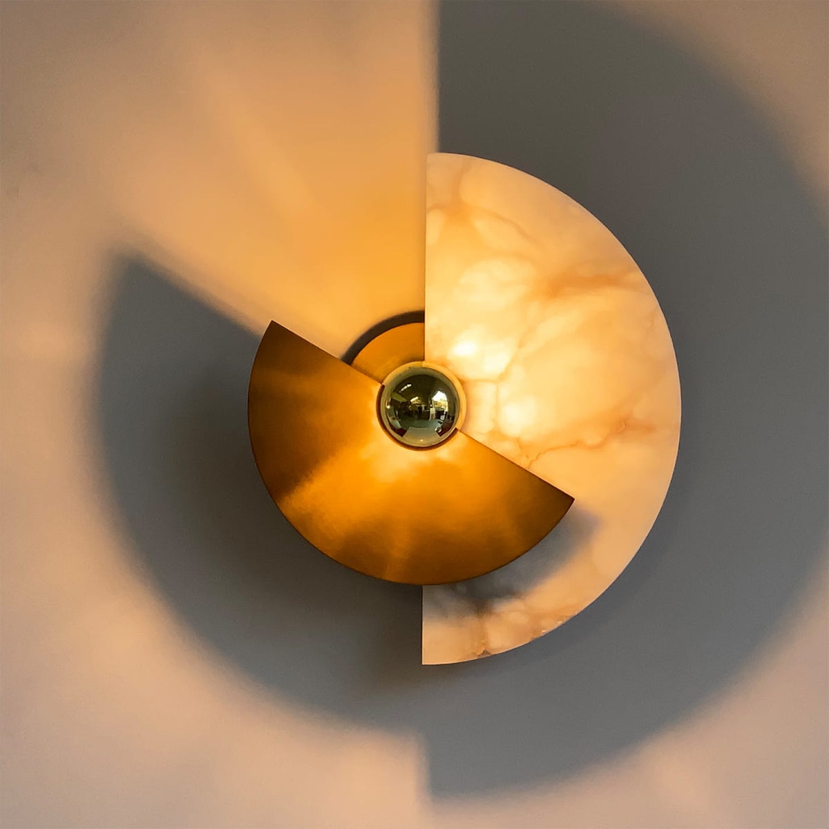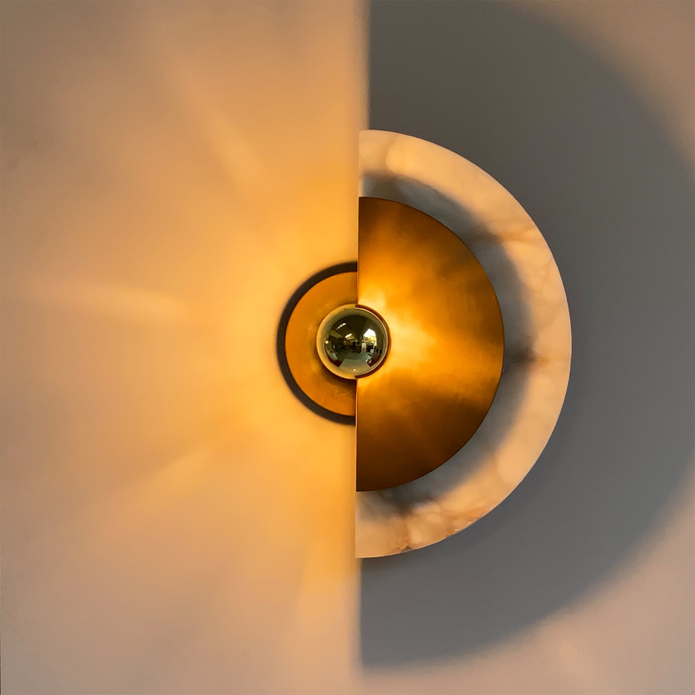 - Crafted for sophistication, the sconce features a lustrous brass structure and disc, paired with your choice of a veined alabaster or marble disc. At its heart, a warm-glow bulb with a golden cap enhances the rich tones of the materials and projects a soft, inviting light. The result is a radiant, sun-like illumination that bathes your wall in warm colors, perfect for creating a cozy and luxurious atmosphere in bedrooms, living rooms, or hallways.