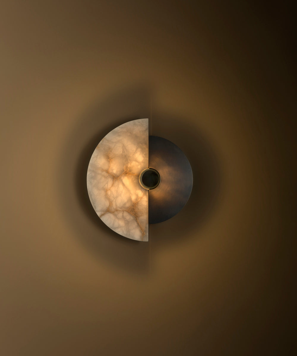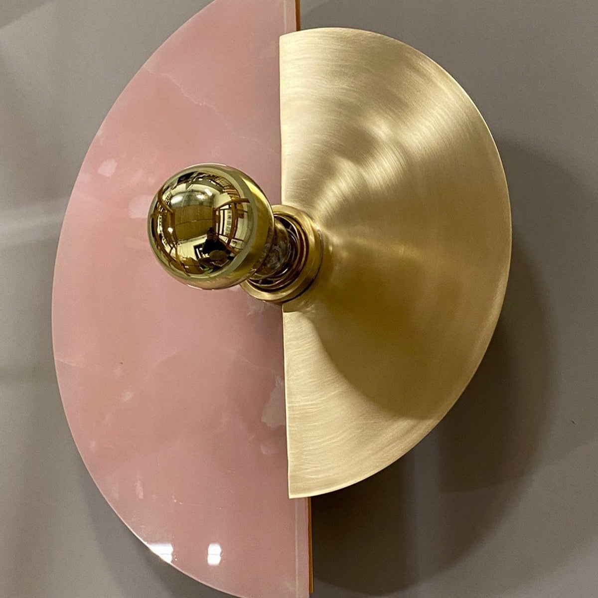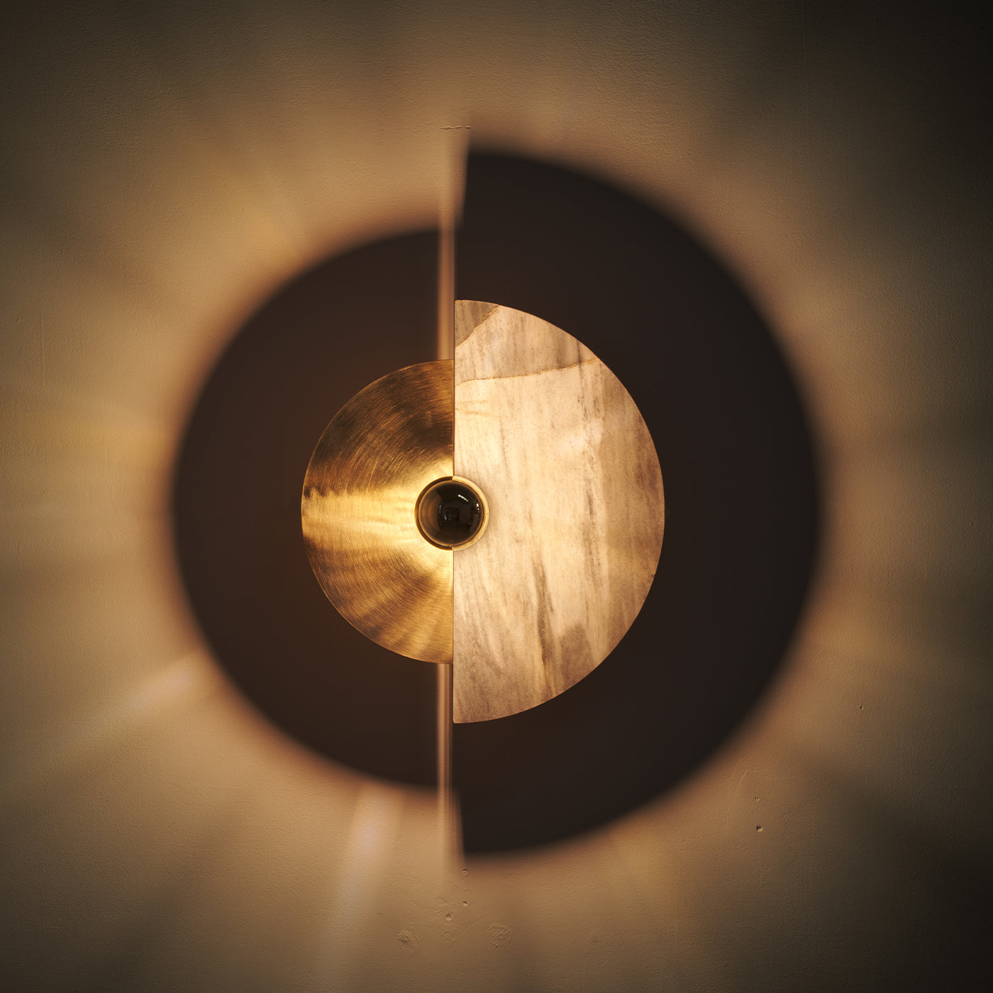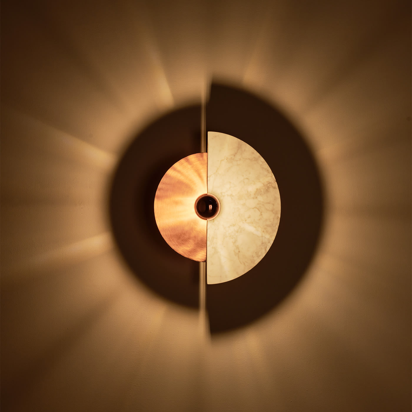 - Crafted for sophistication, the sconce features a lustrous brass structure and disc, paired with your choice of a veined alabaster or marble disc. At its heart, a warm-glow bulb with a golden cap enhances the rich tones of the materials and projects a soft, inviting light. The result is a radiant, sun-like illumination that bathes your wall in warm colors, perfect for creating a cozy and luxurious atmosphere in bedrooms, living rooms, or hallways.