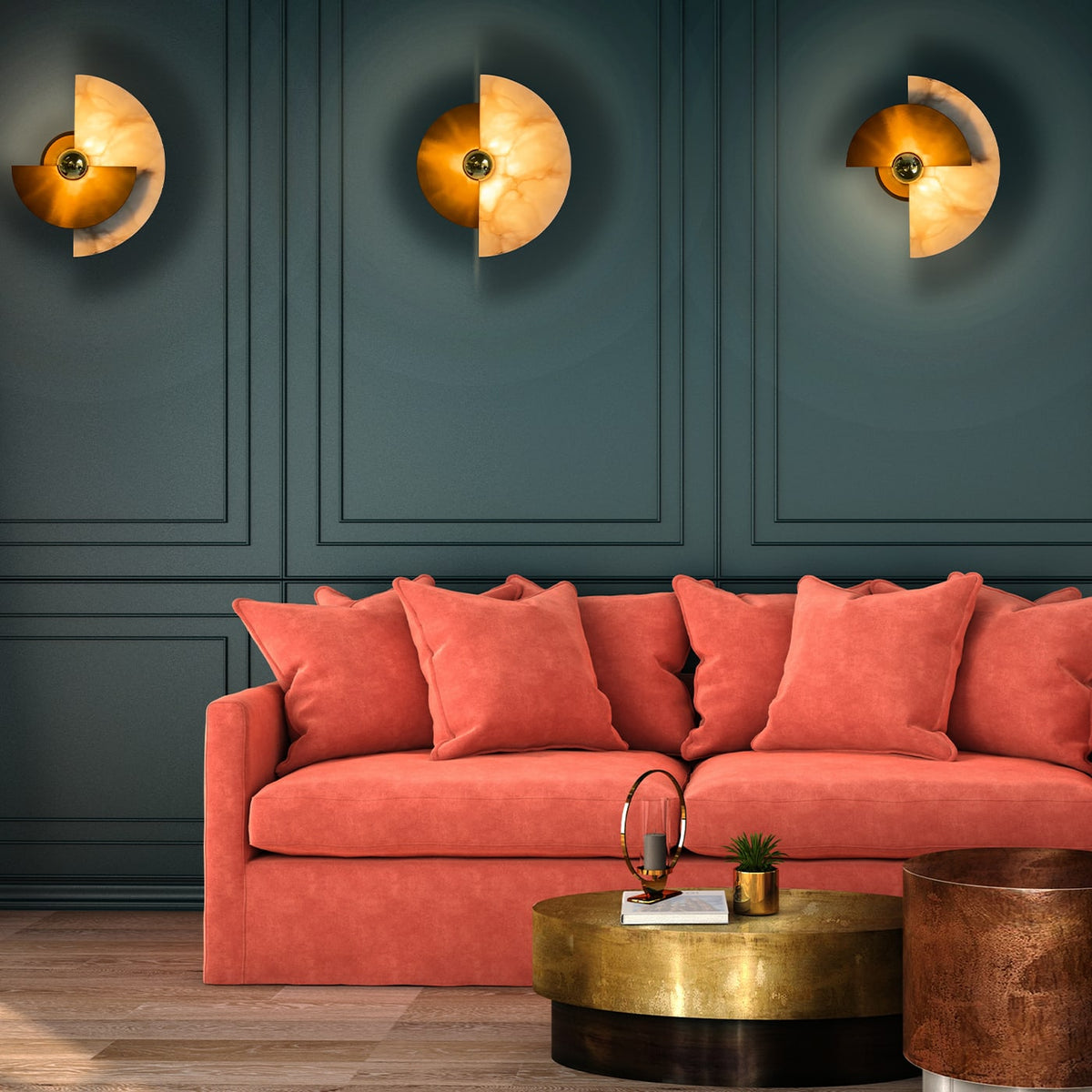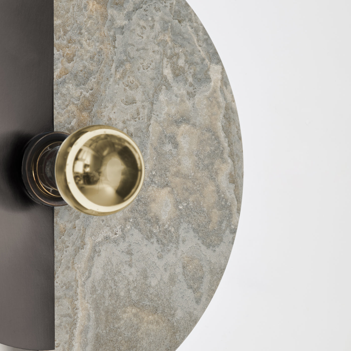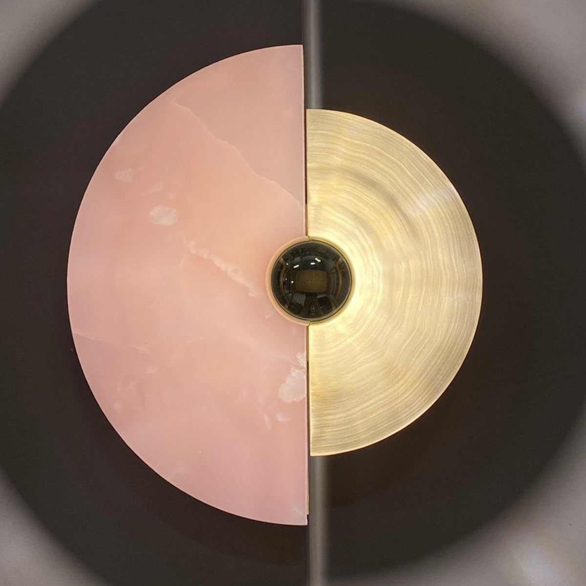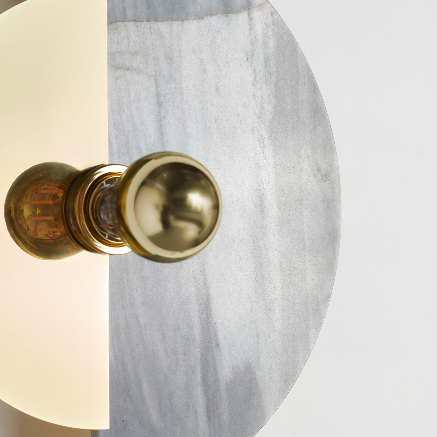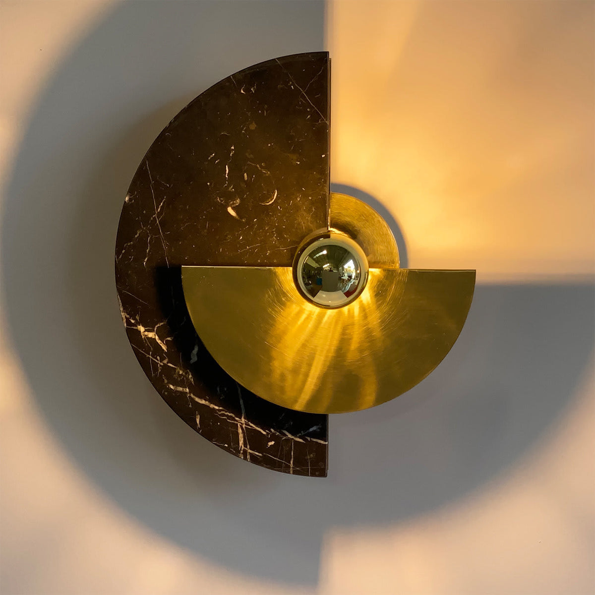 - Crafted for sophistication, the sconce features a lustrous brass structure and disc, paired with your choice of a veined alabaster or marble disc. At its heart, a warm-glow bulb with a golden cap enhances the rich tones of the materials and projects a soft, inviting light. The result is a radiant, sun-like illumination that bathes your wall in warm colors, perfect for creating a cozy and luxurious atmosphere in bedrooms, living rooms, or hallways.