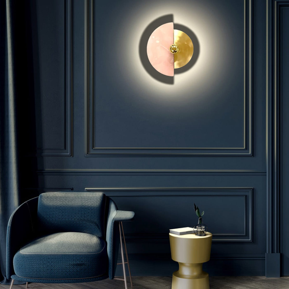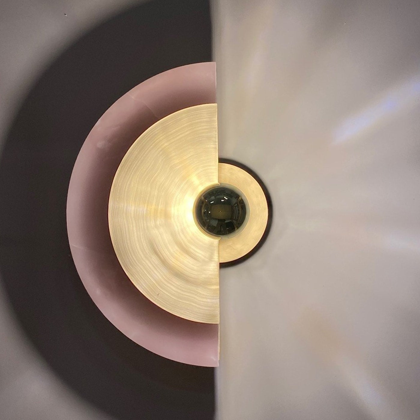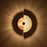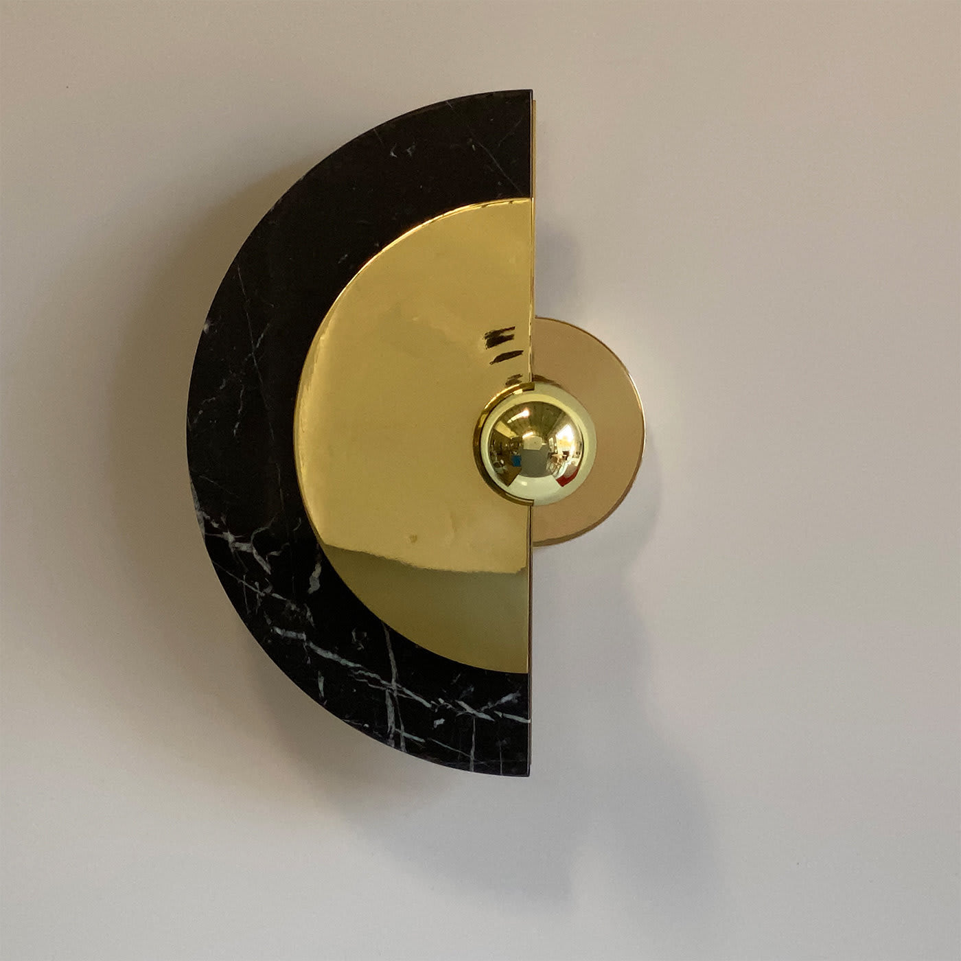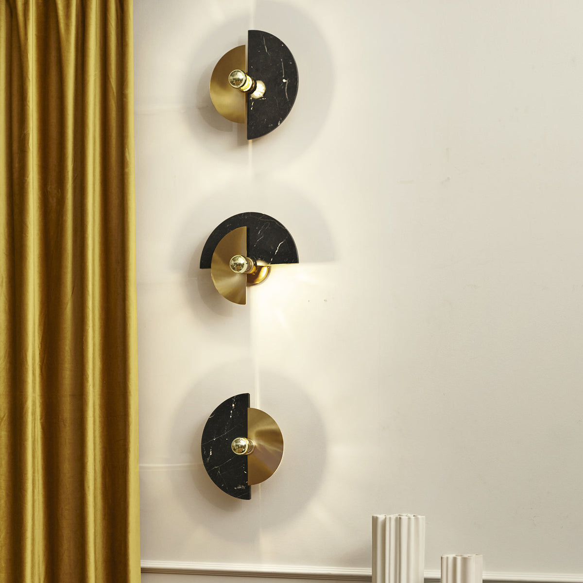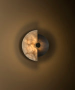 - Crafted for sophistication, the sconce features a lustrous brass structure and disc, paired with your choice of a veined alabaster or marble disc. At its heart, a warm-glow bulb with a golden cap enhances the rich tones of the materials and projects a soft, inviting light. The result is a radiant, sun-like illumination that bathes your wall in warm colors, perfect for creating a cozy and luxurious atmosphere in bedrooms, living rooms, or hallways.