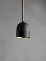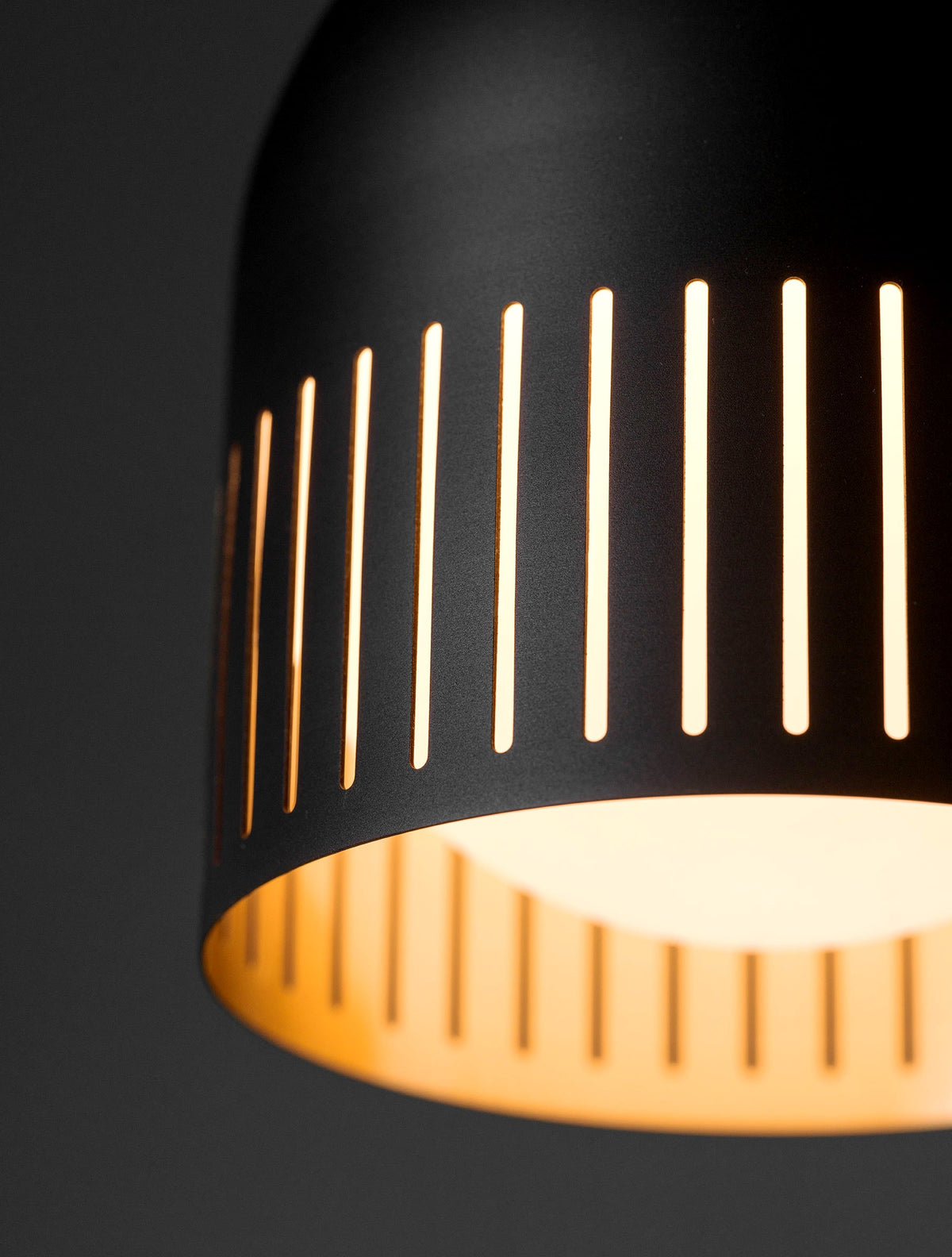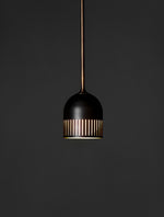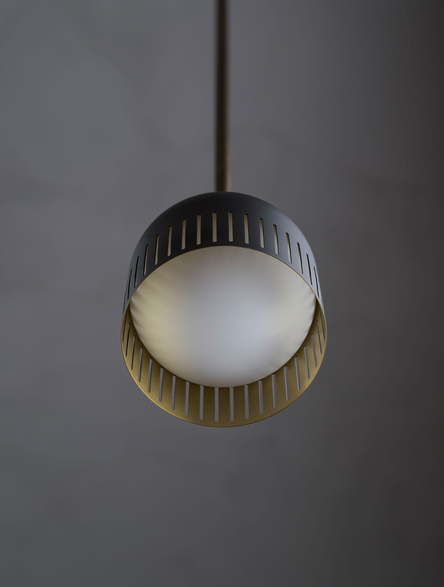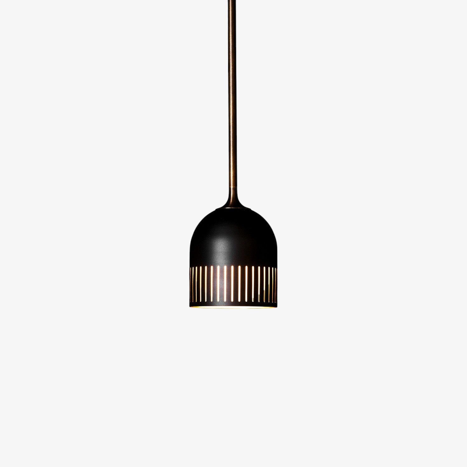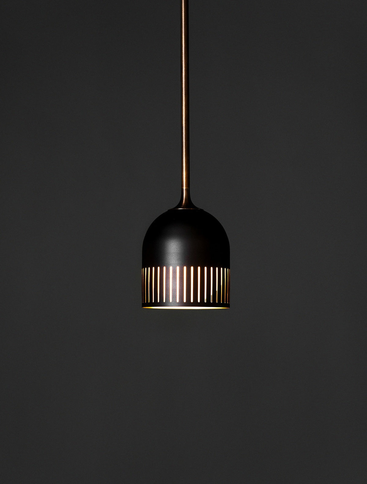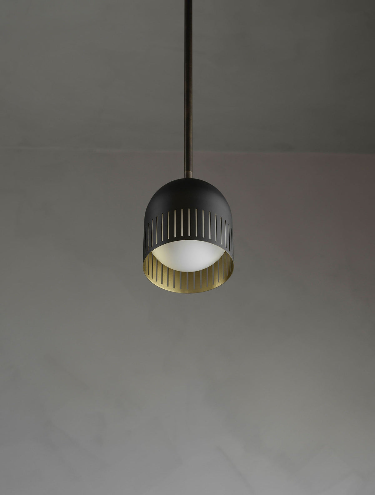 - Discover the Bishop Pendant Lamp, where minimalist design meets captivating depth. Its polished dome features individually cut openings that reveal a stunning blown-glass globe within. When illuminated, a repetition of precise lines casts a soft, geometric pattern, elevating a familiar form into a statement piece. This pendant light creates an ambiance of modern sophistication for any room.