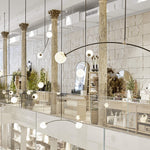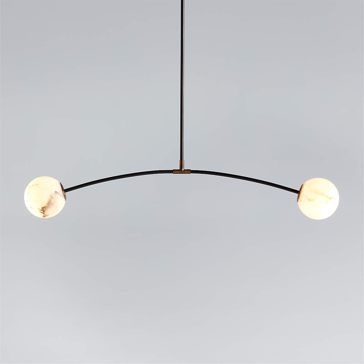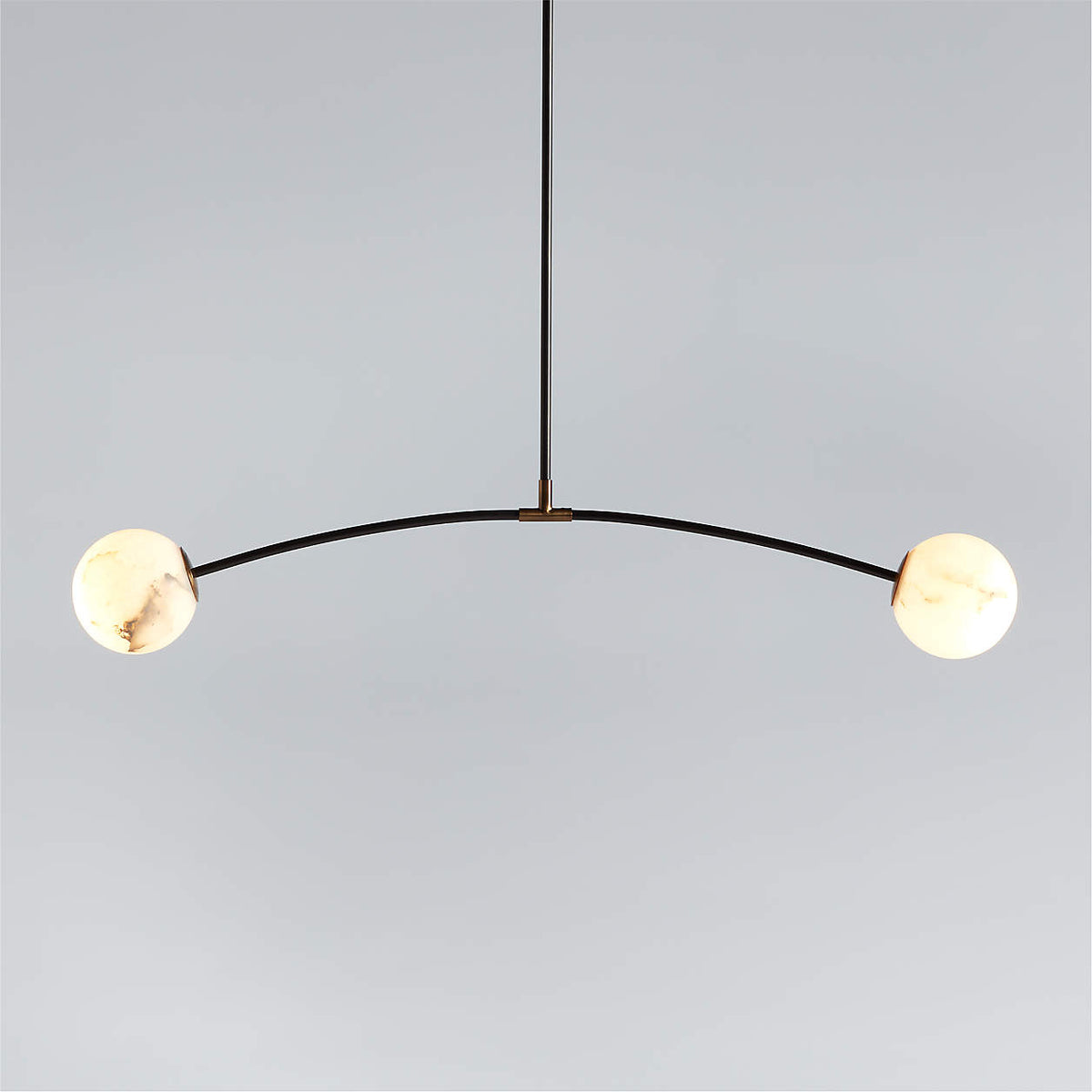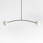 - Supporting these luminous orbs is a slender and strong arc of blackened steel. Its crisp, matte finish provides a striking contrast that highlights the soft, milky texture of the alabaster, much like a drawn line emphasizing a beautiful form in a sketch. This architectural element gives the fixture a contemporary edge, ensuring it feels both timeless and of-the-moment.