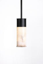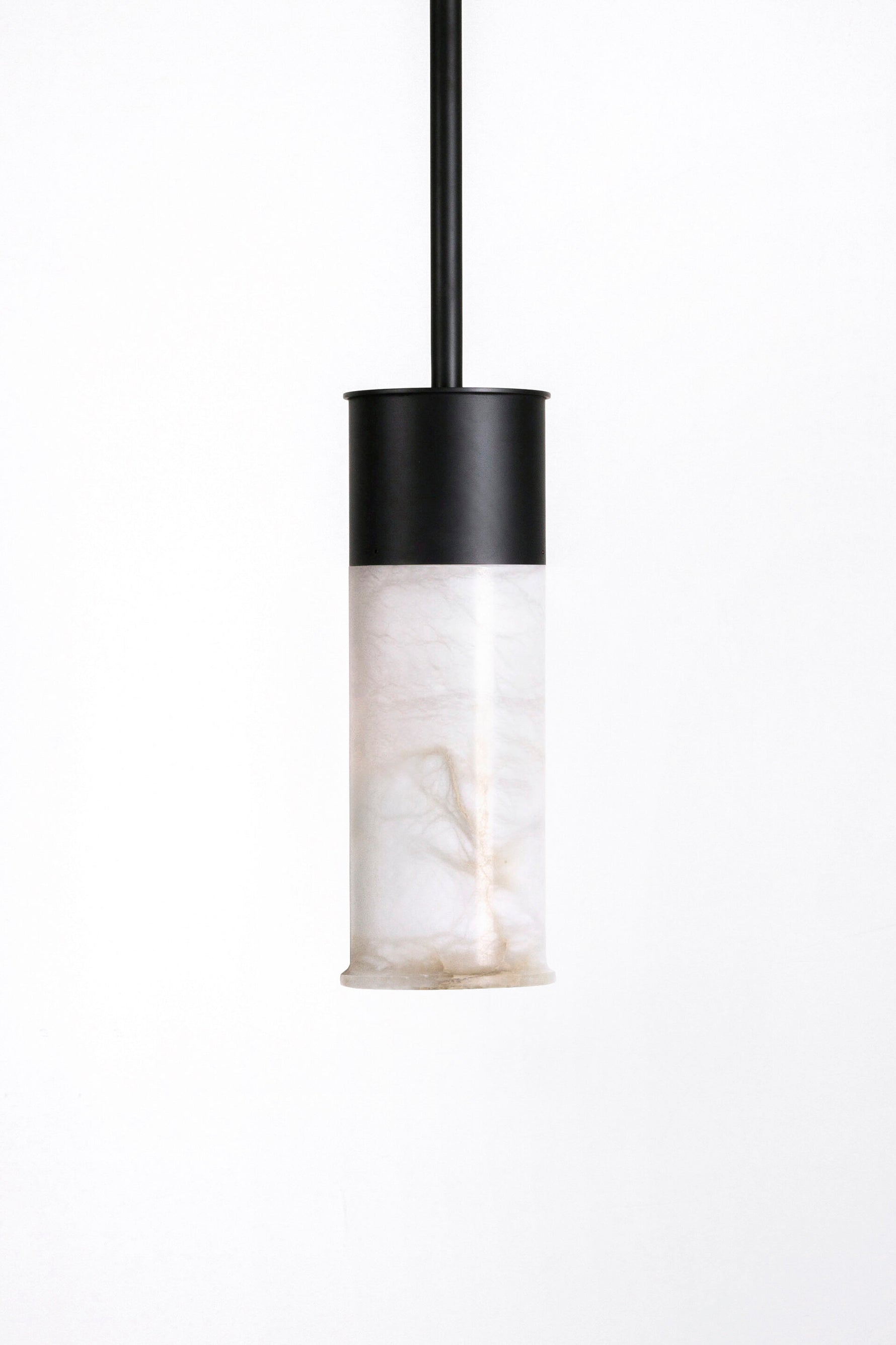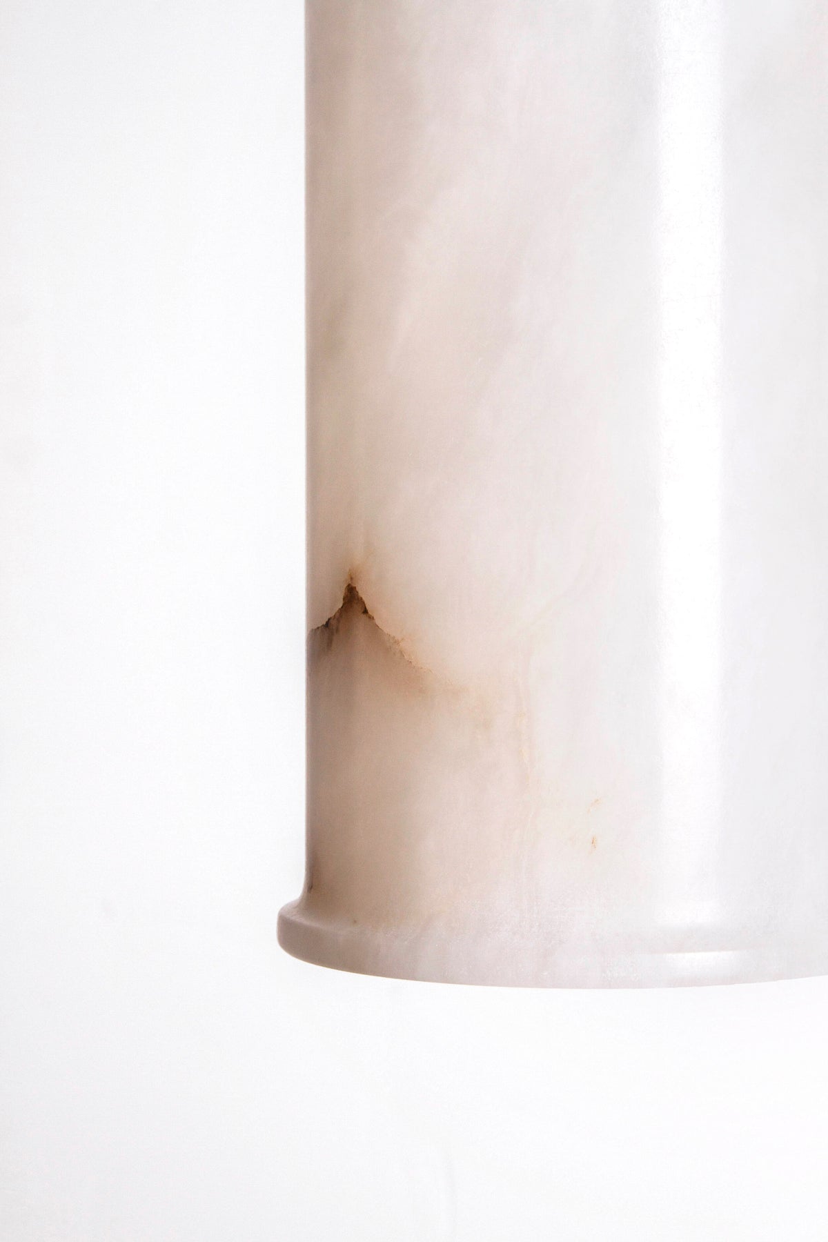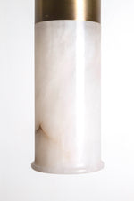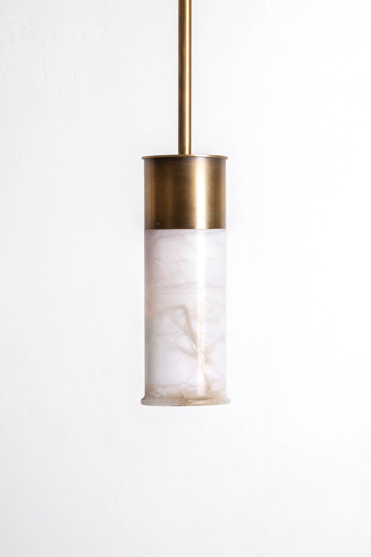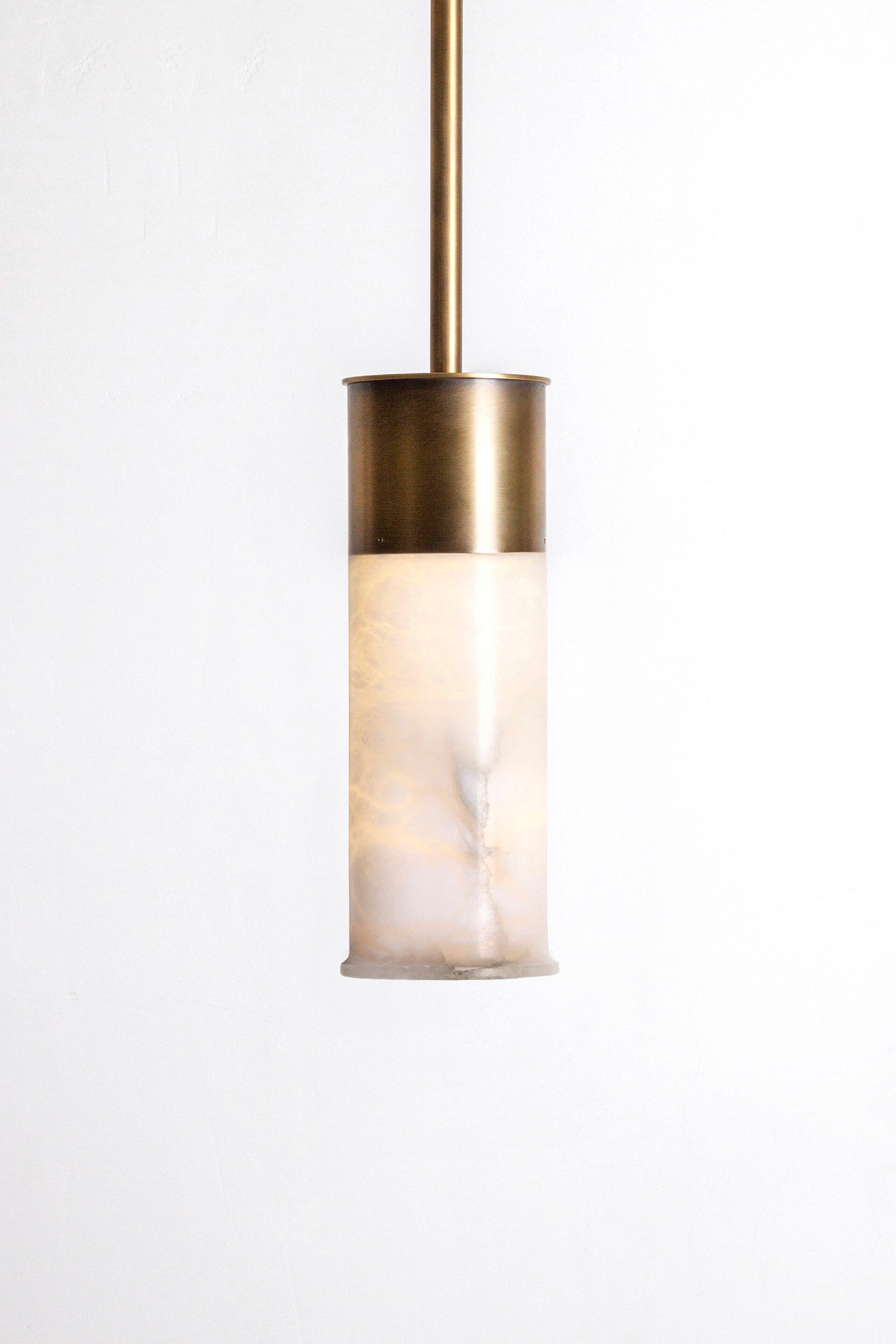 - The overall form of Erato Medium Pendant Lamp is a study in balanced, cylindrical elegance. The design favors clean, flowing lines that guide the eye effortlessly from the ceiling mount to the soft glow below. The proportions of the milky alabaster and the warm brass are meticulously calculated to be harmonious, ensuring neither overpowers the other. Subtle details, like the precise machining of the brass pendant and the slender top column, inject a layer of sophistication into the lamp's otherwise minimalist silhouette. This thoughtful execution results in a fixture that feels both substantial and gracefully airy.
