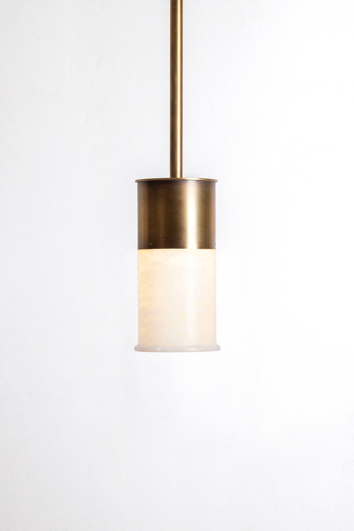 - The overall silhouette of the Erato pendant is a study in balanced, cylindrical geometry. Its clean, flowing lines are timeless, ensuring it never feels dated. The proportions between the alabaster body and the brass elements are carefully calculated to be visually harmonious from every angle. This thoughtful design philosophy makes the lamp a remarkably versatile addition to your home. It can anchor a dining table in a modern minimalist setting, add a touch of refined texture to an understated luxury bedroom, or provide a note of classic elegance in a retro-inspired entryway.