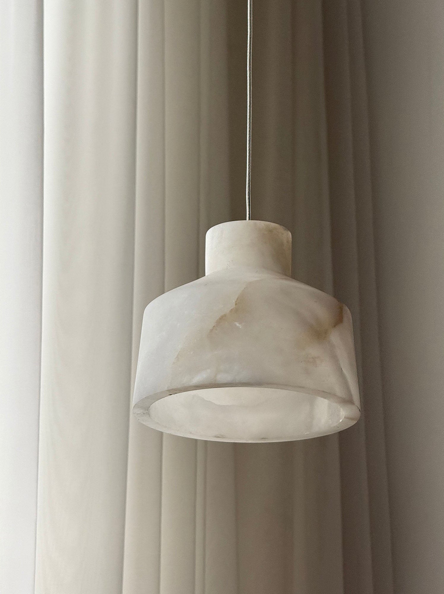 - Crafted from exquisite alabaster, the Marybelle Pendant Lamp showcases a warm, natural texture, making each piece uniquely beautiful. When illuminated, the light diffuses softly through the stone, creating a hazy, inviting glow that enhances any space with a tranquil and cozy atmosphere.