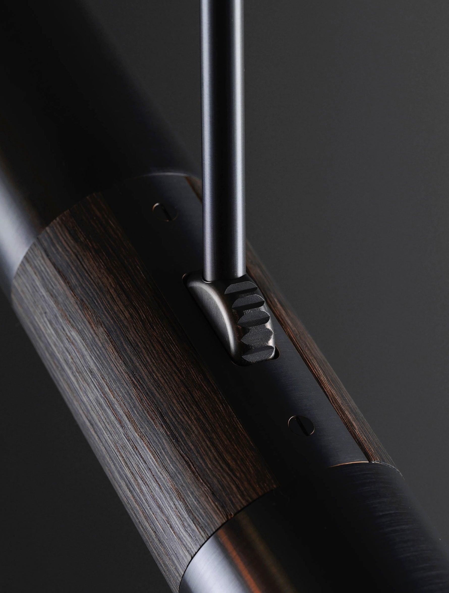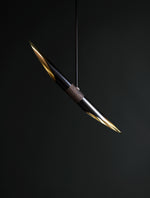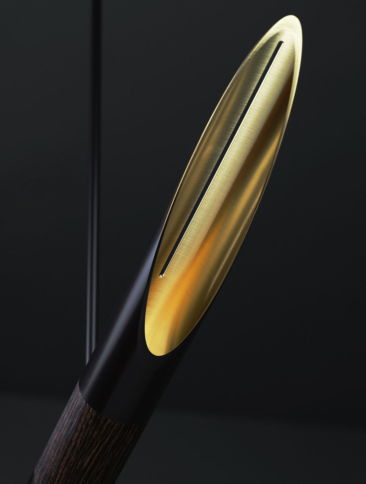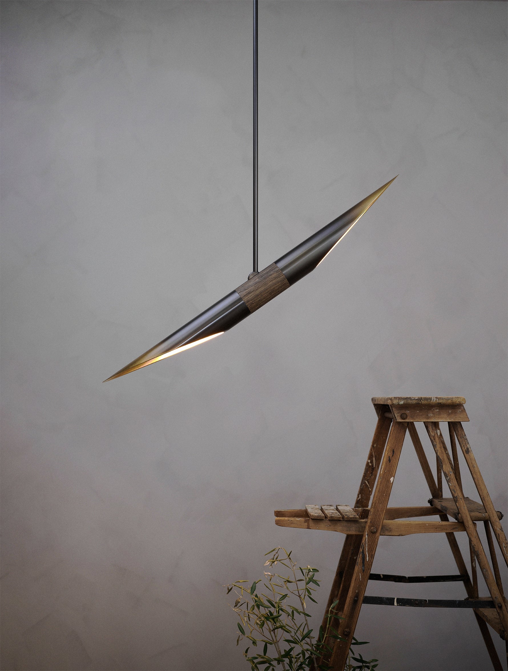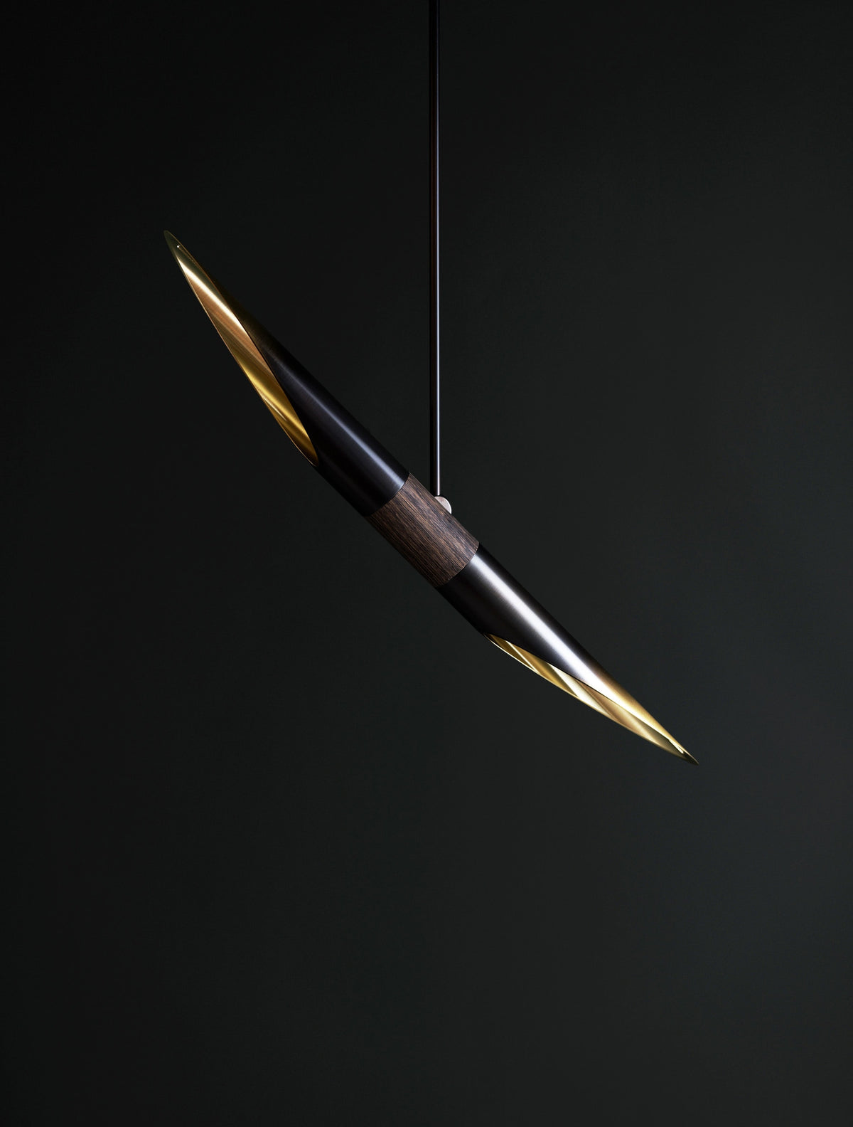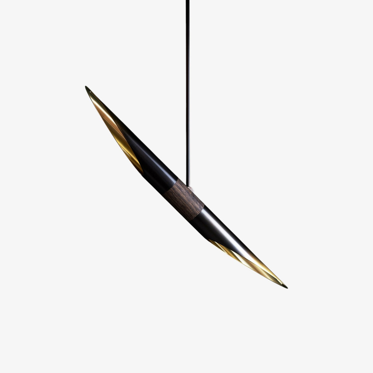 - Discover the Voyager Pendant Lamp, a stunning fusion of industrial design and ambient illumination. Crafted from solid brass, its cylindrical form features two precise, angular openings that cast captivating geometric patterns. A unique milled slot along the top offers a subtle glimpse of the light source within, creating a dynamic effect from every angle.