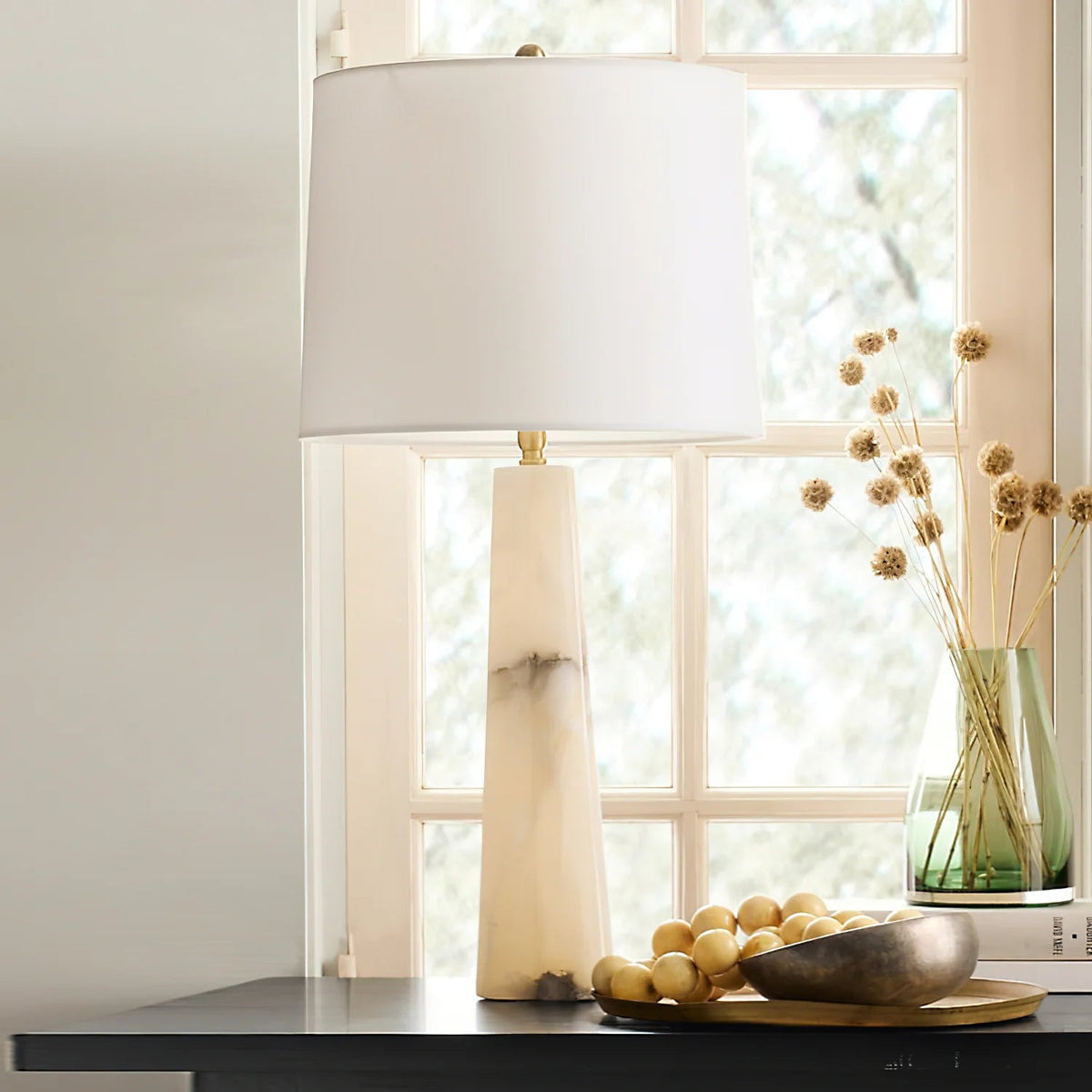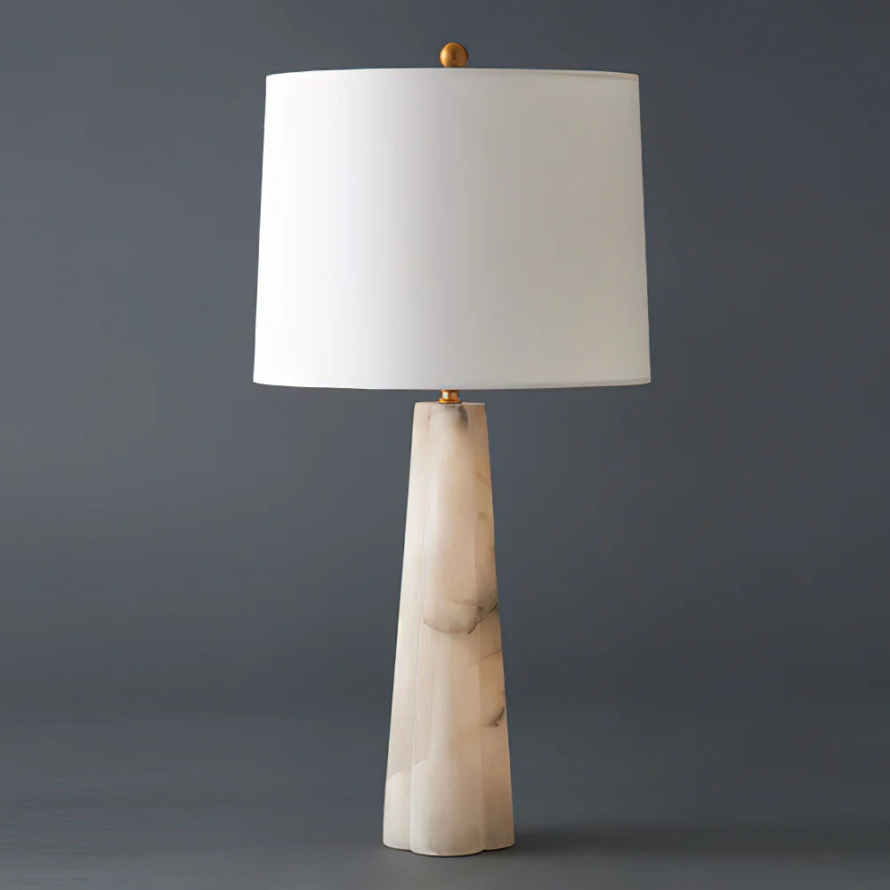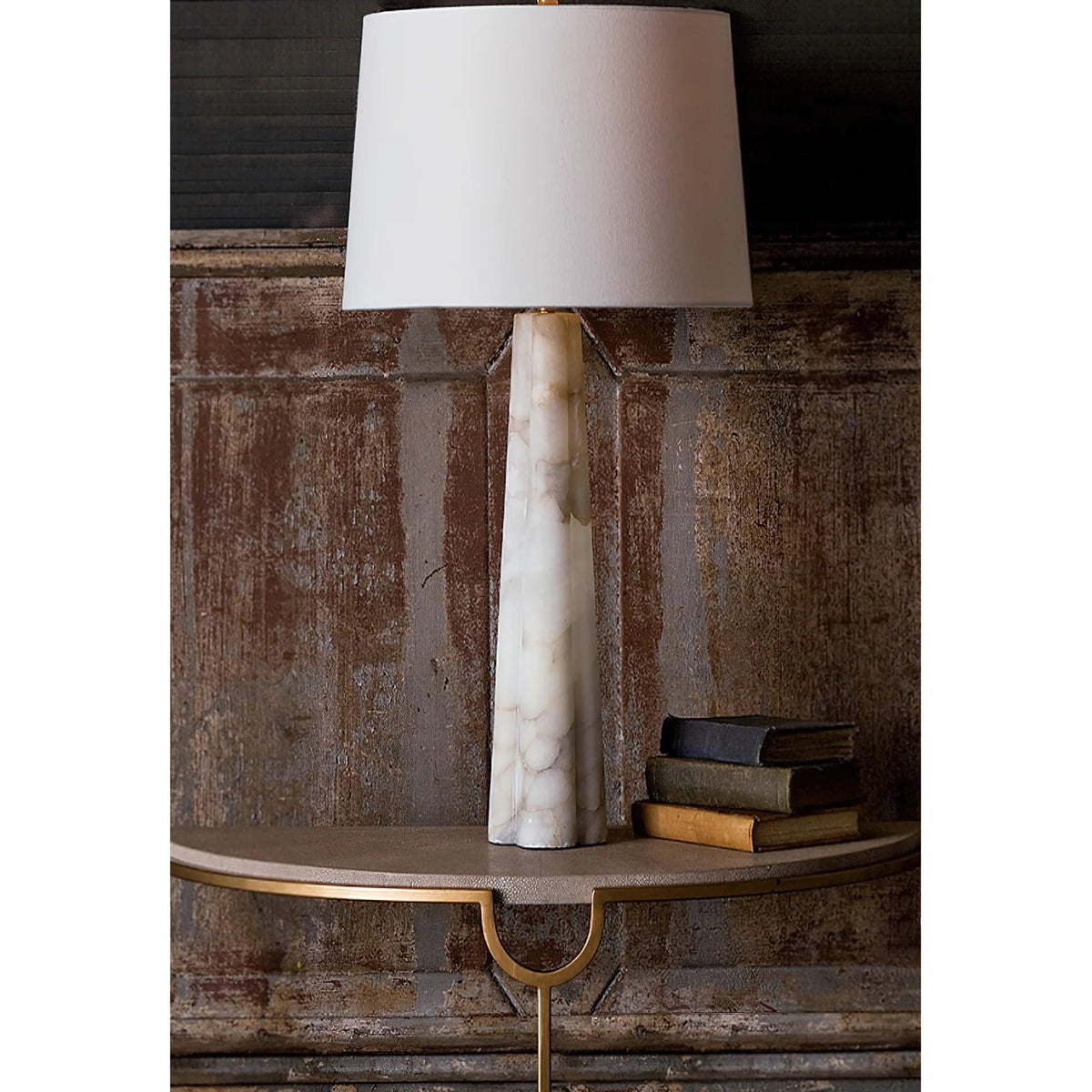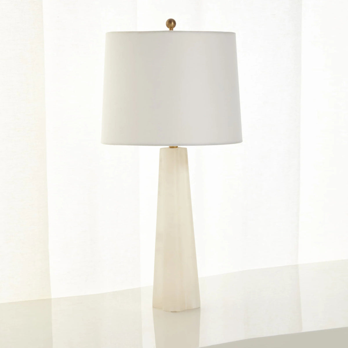 - Crafted from soft, luminous alabaster stone, the Quatrefoil Table Lamp features a gracefully tapered four-cornered base, blending organic texture with geometric sophistication. The warm glow of the alabaster pairs beautifully with the polished brass hardware, which elegantly supports a soft fabric lampshade for a harmonious balance of materials.