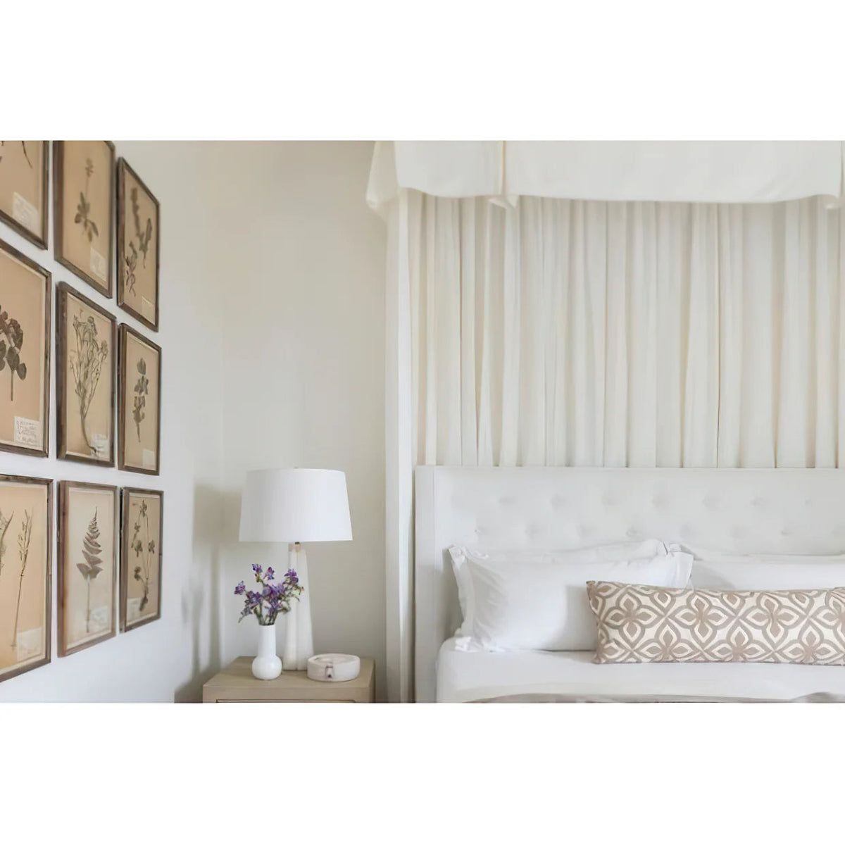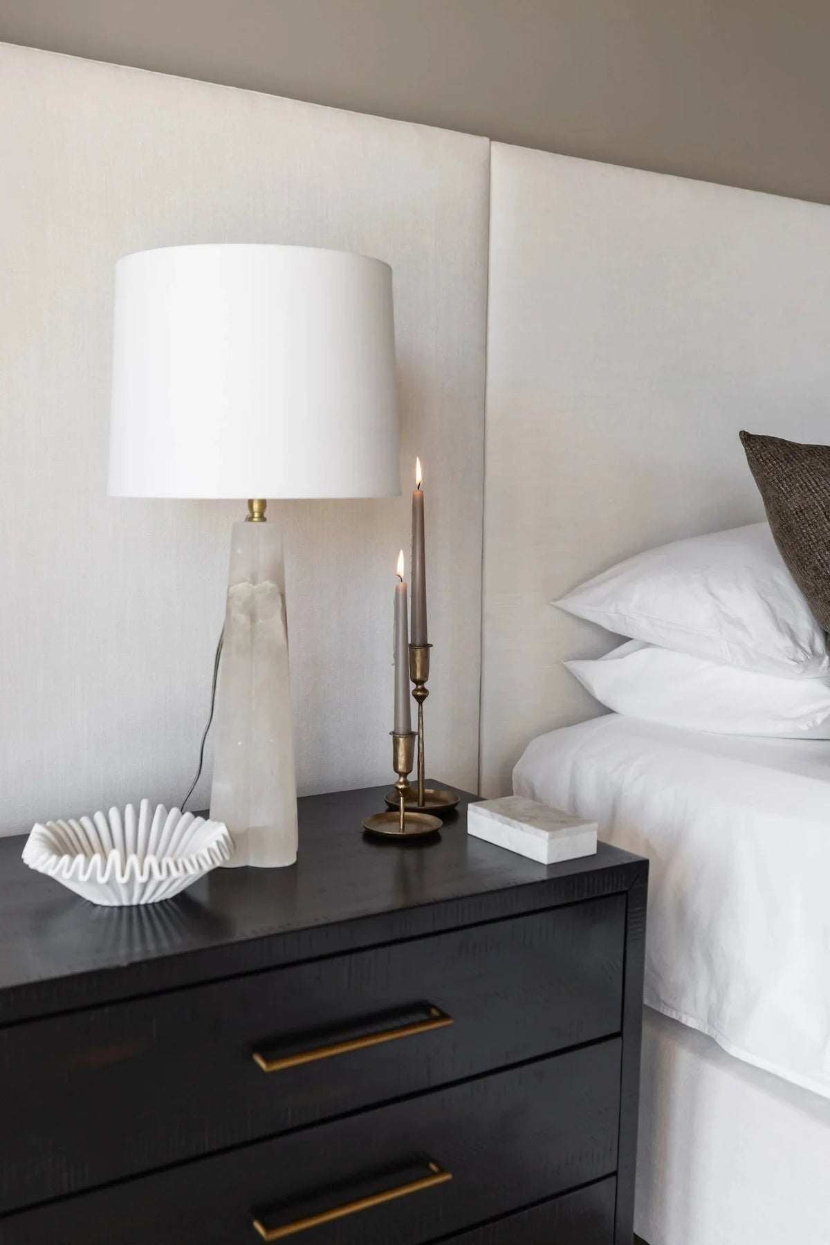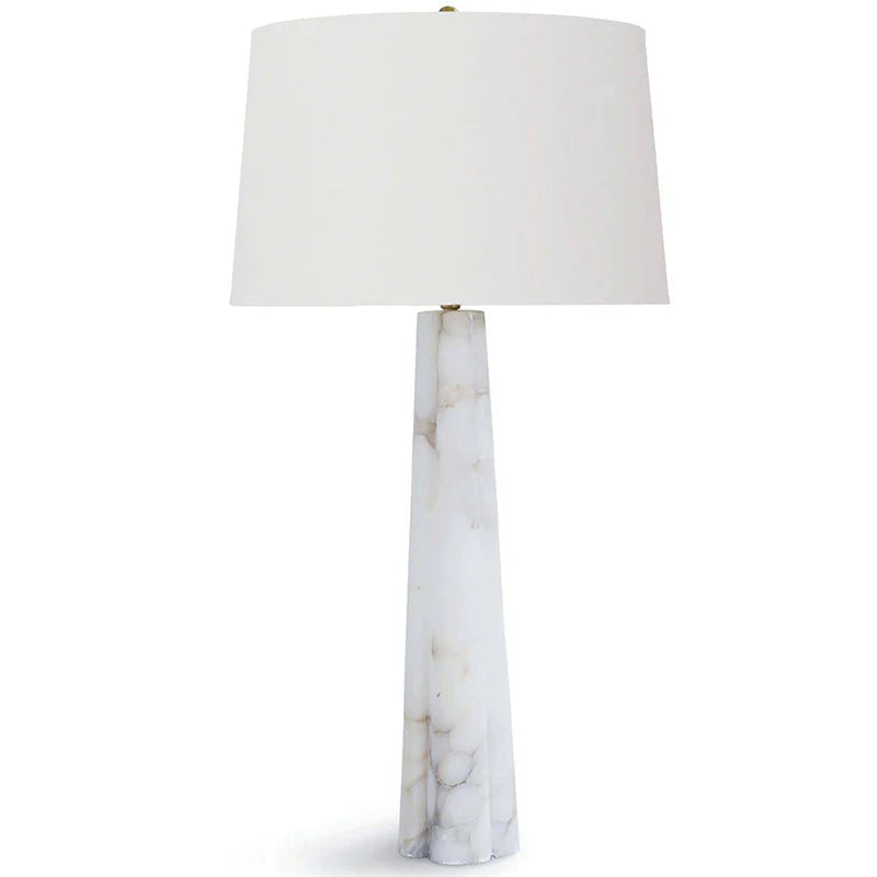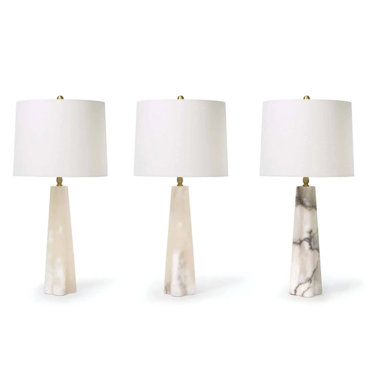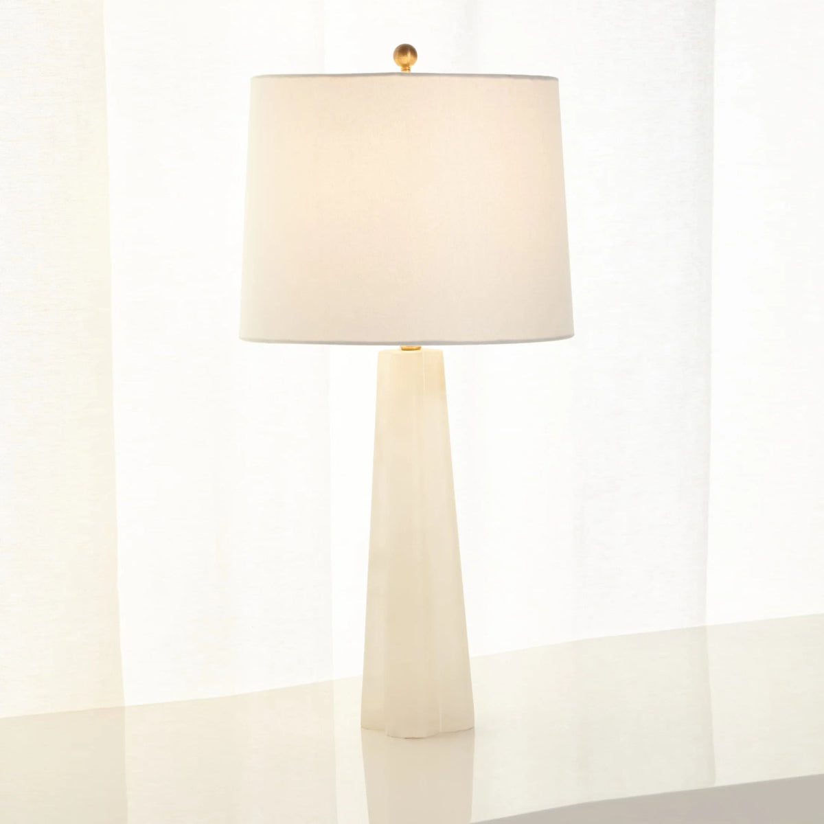 - Crafted from soft, luminous alabaster stone, the Quatrefoil Table Lamp features a gracefully tapered four-cornered base, blending organic texture with geometric sophistication. The warm glow of the alabaster pairs beautifully with the polished brass hardware, which elegantly supports a soft fabric lampshade for a harmonious balance of materials.
