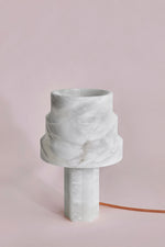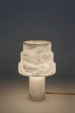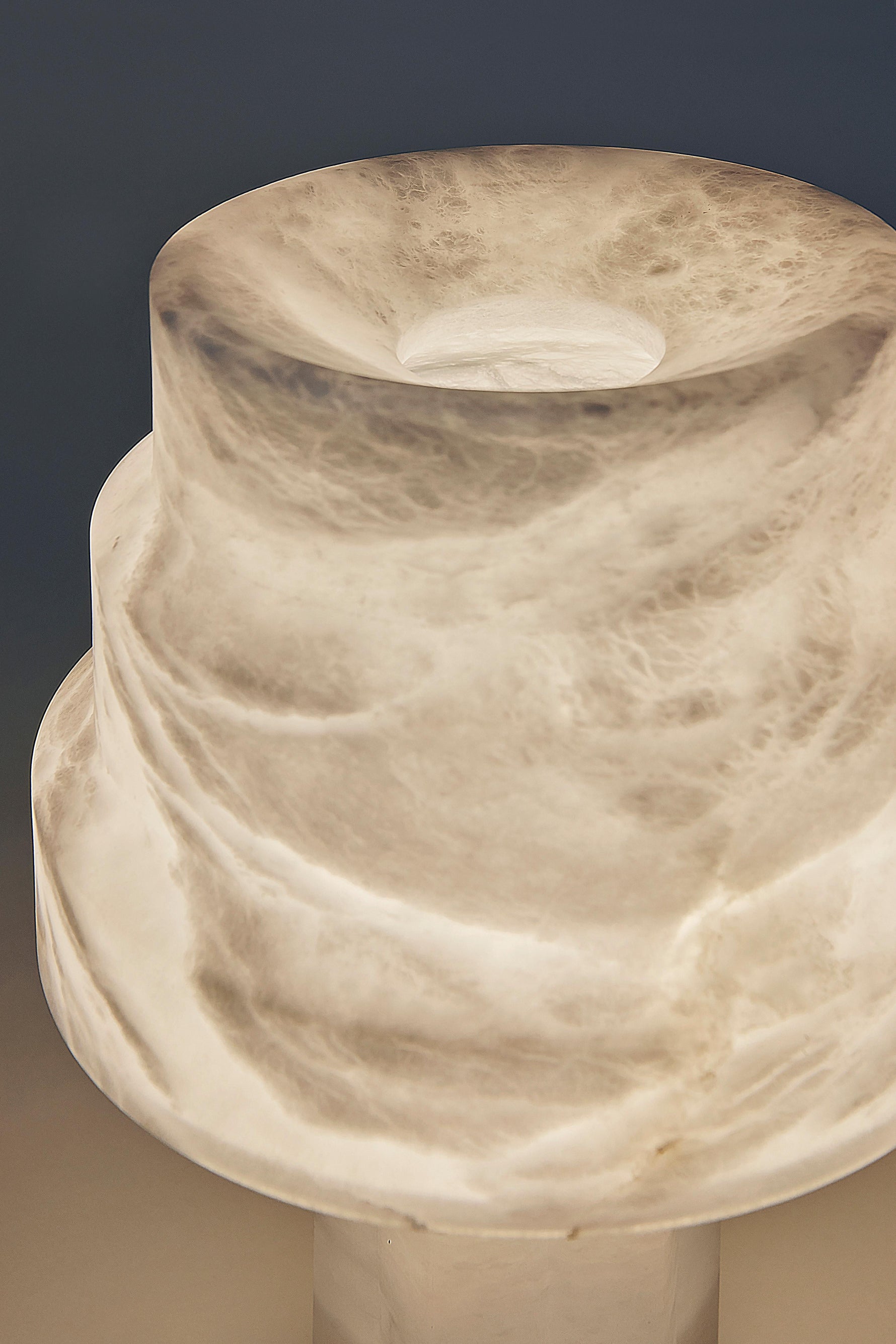 - Scale Alabaster Table Lamp carved from a single block of fine alabaster, its form is defined by a series of clean, precise facets. When unlit, it stands as a striking sculptural object, a contrast of solid form and soft texture. But it's when the light is turned on that the true magic happens. The alabaster transforms, as warm light glows through its translucent stone, revealing the unique, cloud-like veins and organic patterns within. This creates an ambiance of unparalleled warmth and serenity, casting a soft, inviting glow that enhances any room.