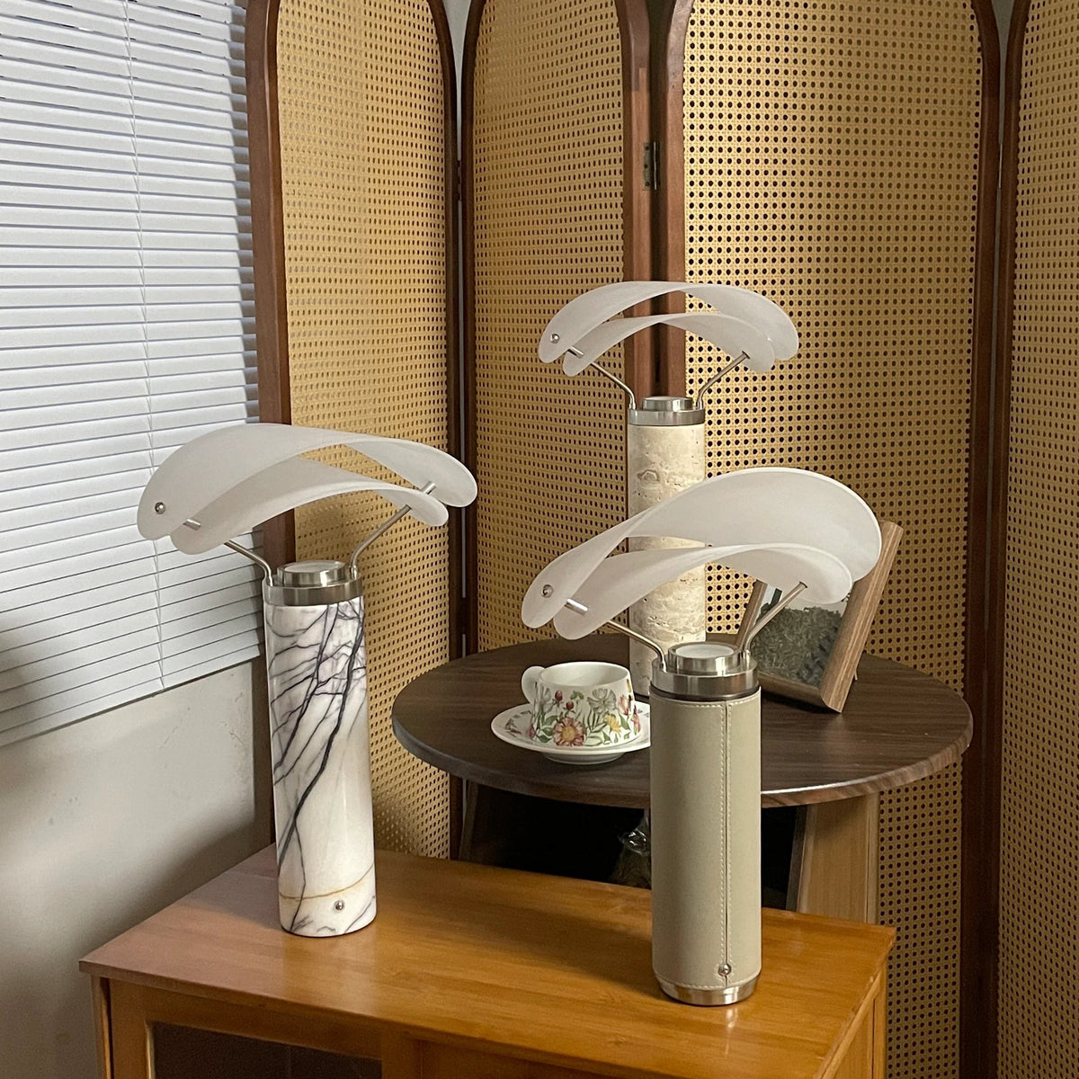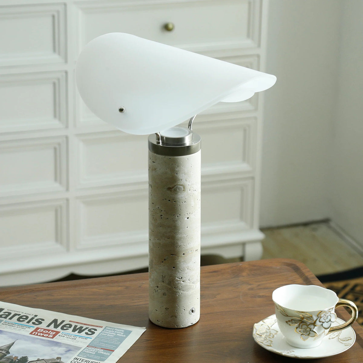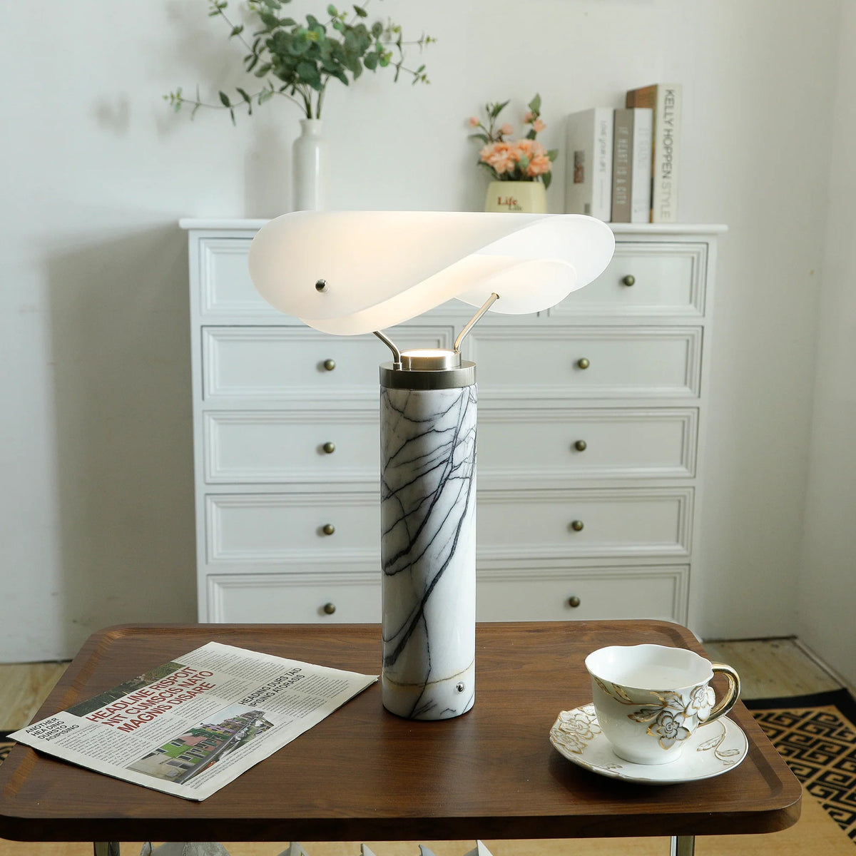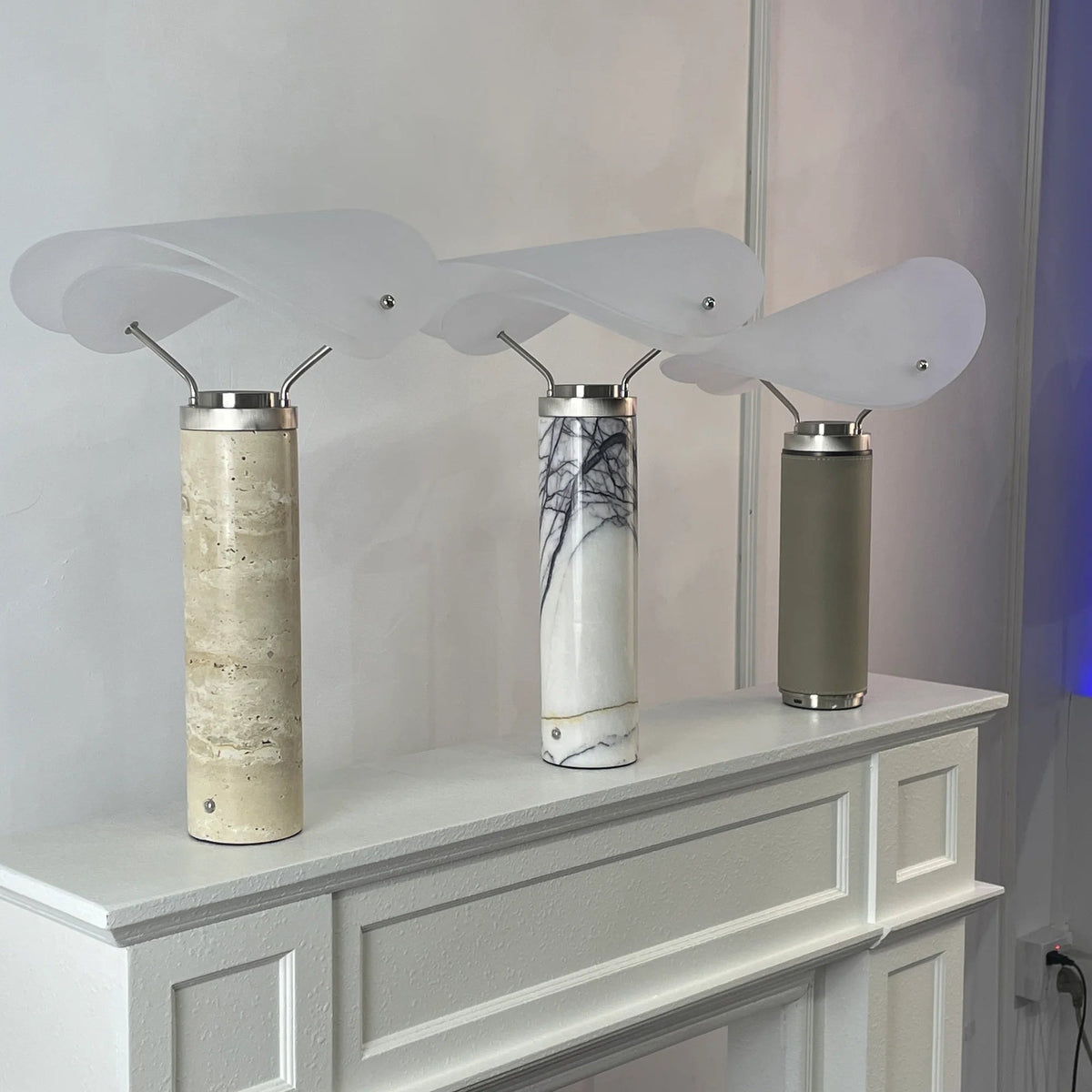 - Elevate your space with the Shed Marble Table Lamp, a harmonious blend of natural elegance and modern illumination. The sturdy base is crafted from premium Carrara marble or travertine, adding timeless sophistication to any setting.
