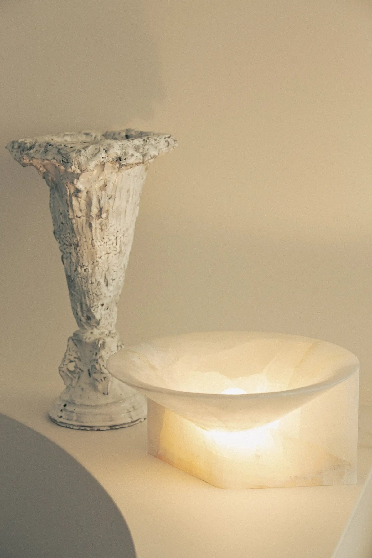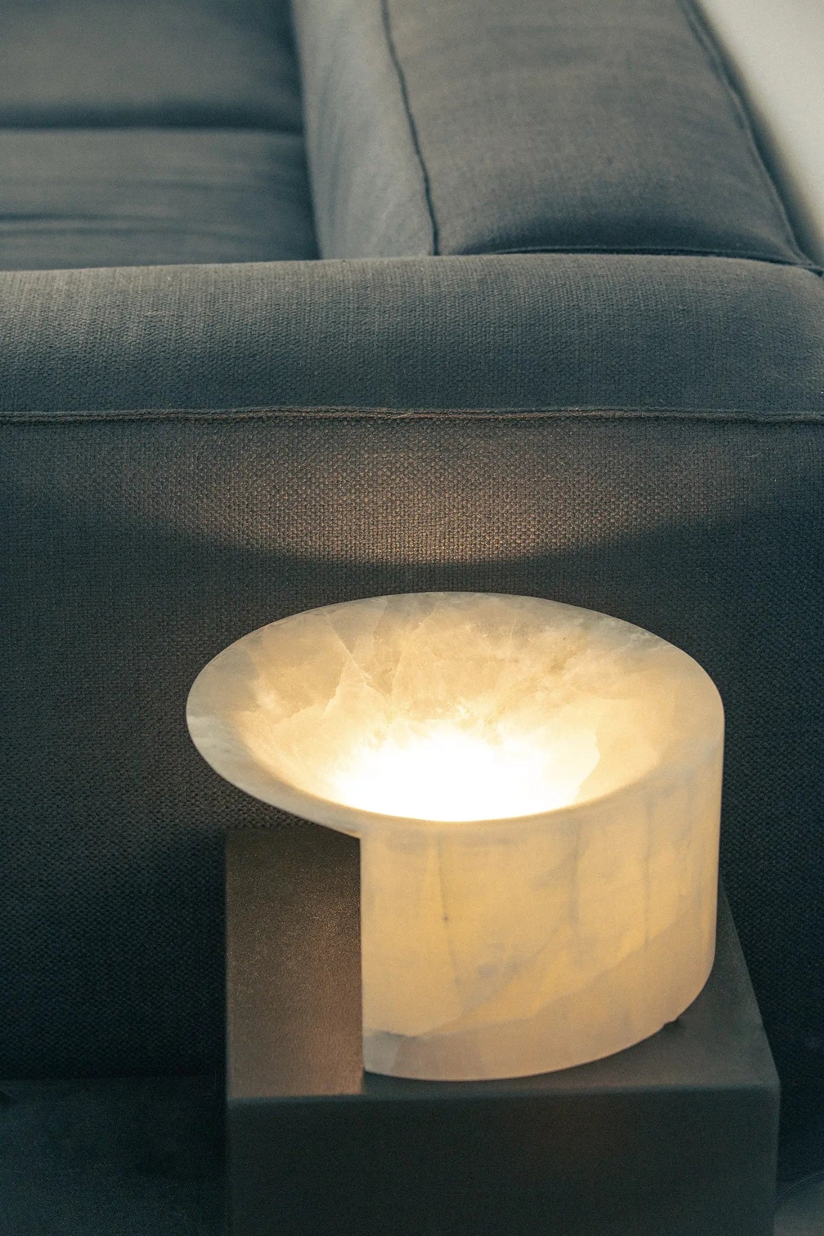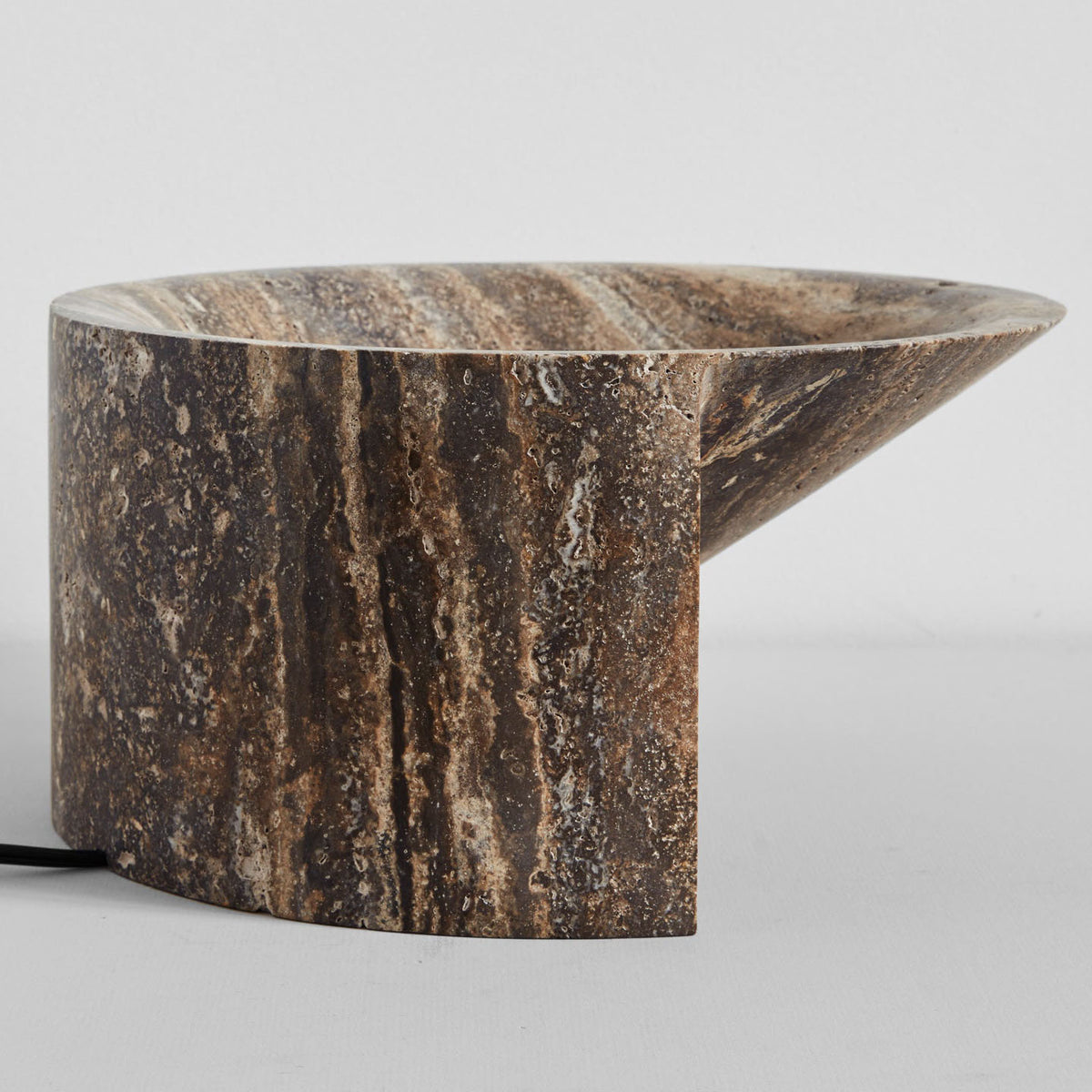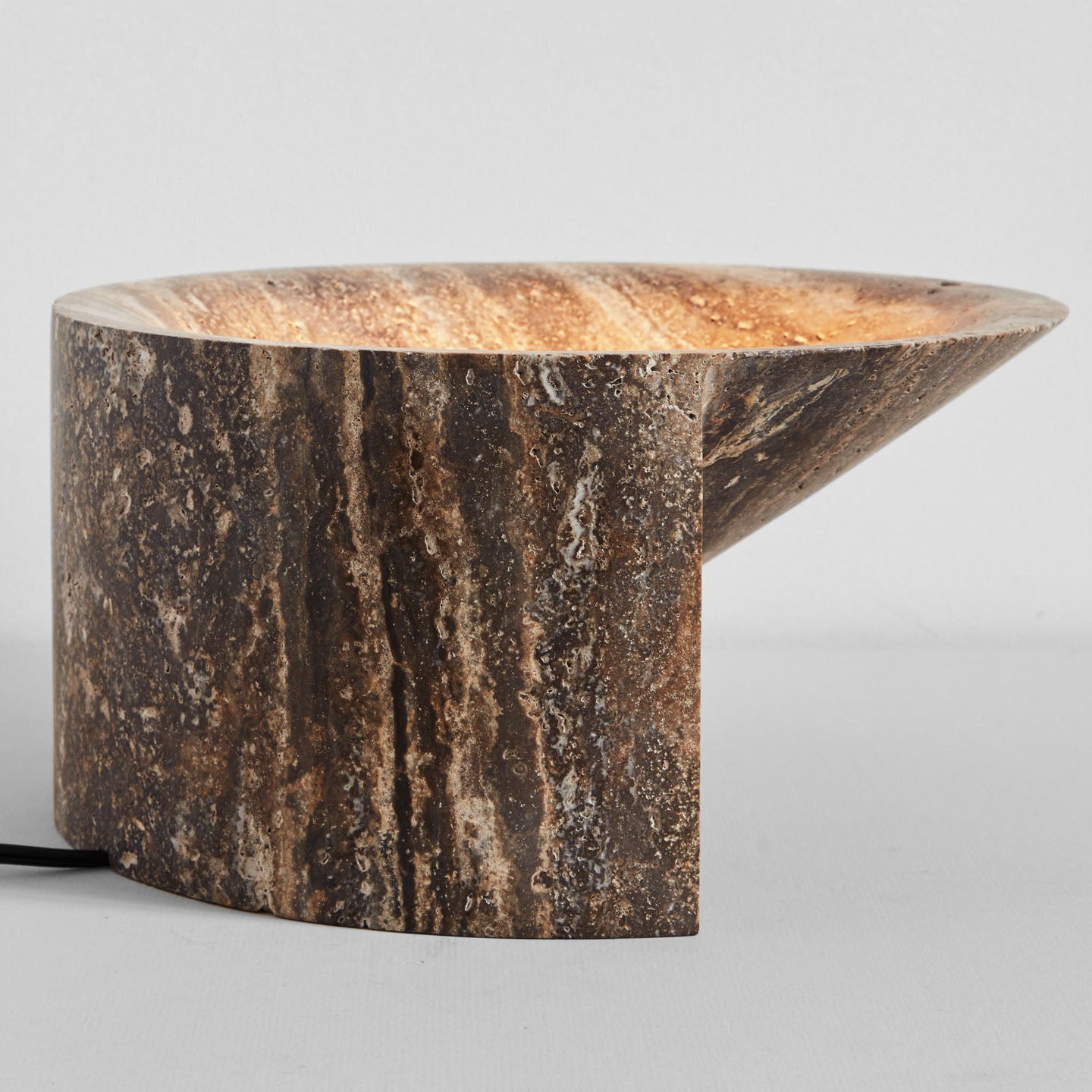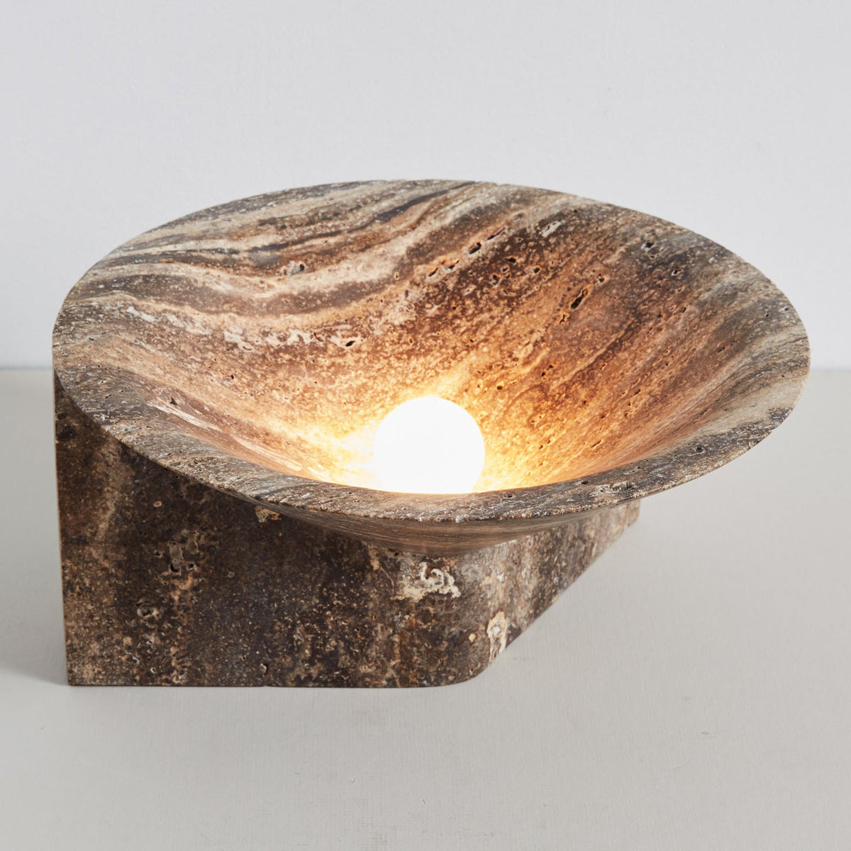 - Carved from a single, substantial block of natural stone, this Stone Uplight Table Lamp is defined by its compelling duality. From its core, a soft, atmospheric glow emanates, creating a warm and inviting pool of light. This delicate illumination contrasts dramatically with the piece's considerable heft and solidity, creating a subtle and alluring tension that is both grounding and ethereal.