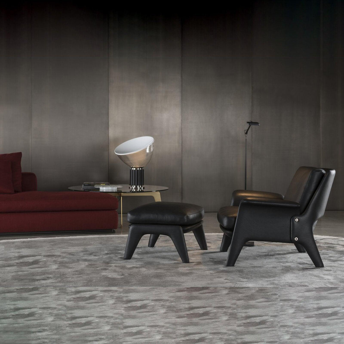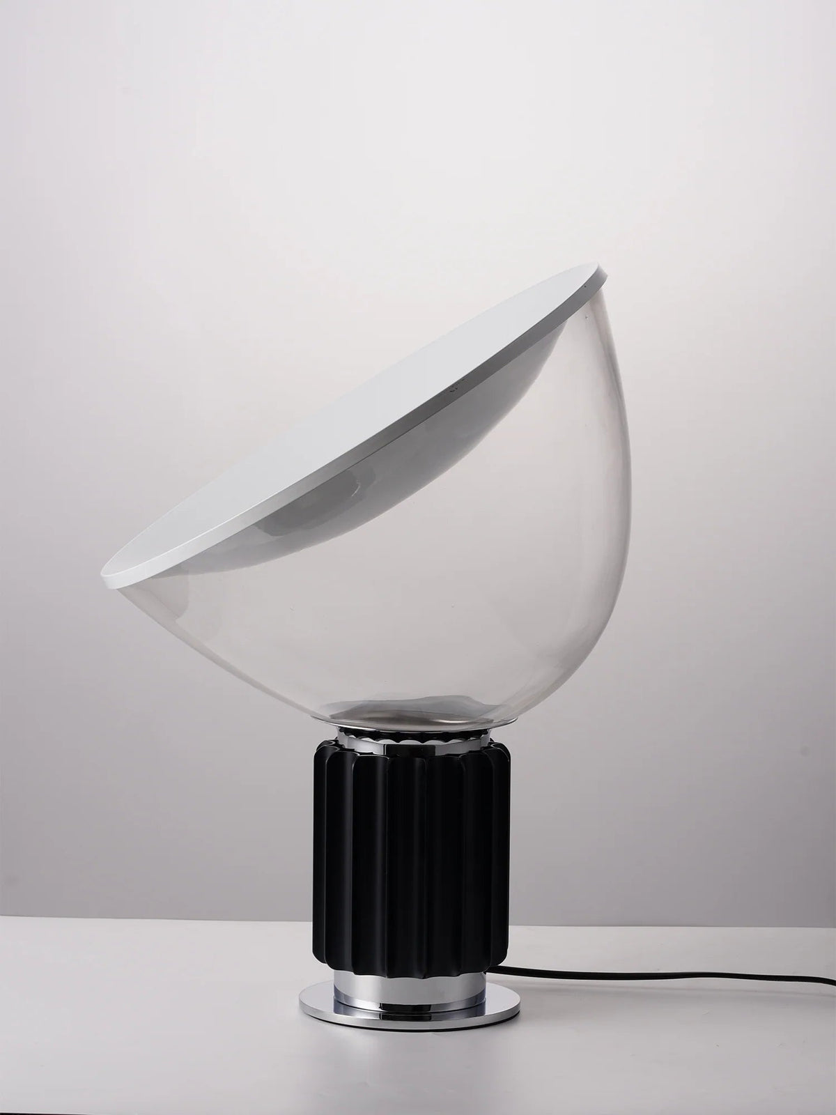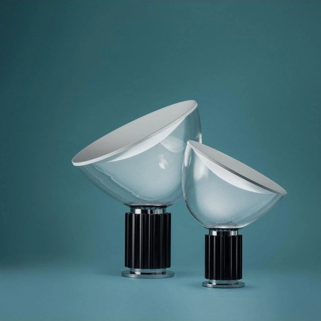 - The Castiglioni brothers, renowned for their innovative designs, created the Taccia lamp in 1962. This iconic piece challenges traditional lighting design with its inverted form, giving the illusion of a hanging lamp. Its unique design and high-quality materials make it a timeless classic that will elevate any space. The Taccia's blown glass diffuser can be adjusted to direct light as needed, offering versatility and functionality.