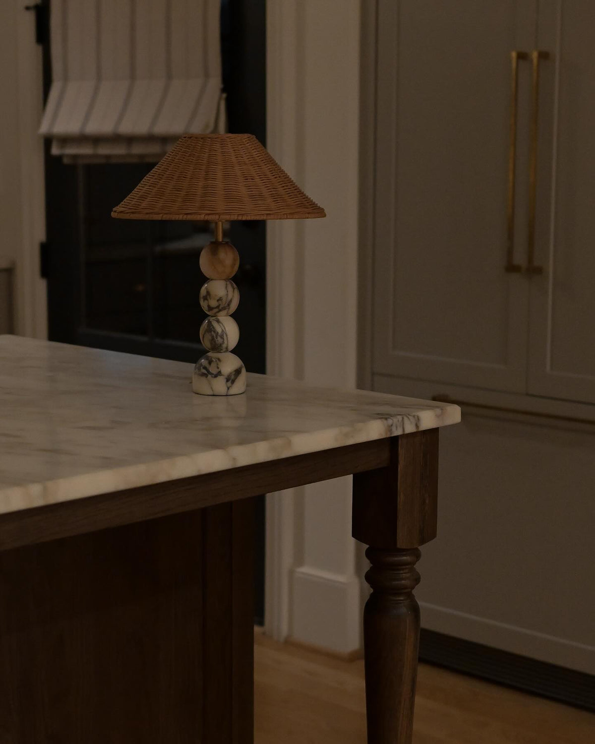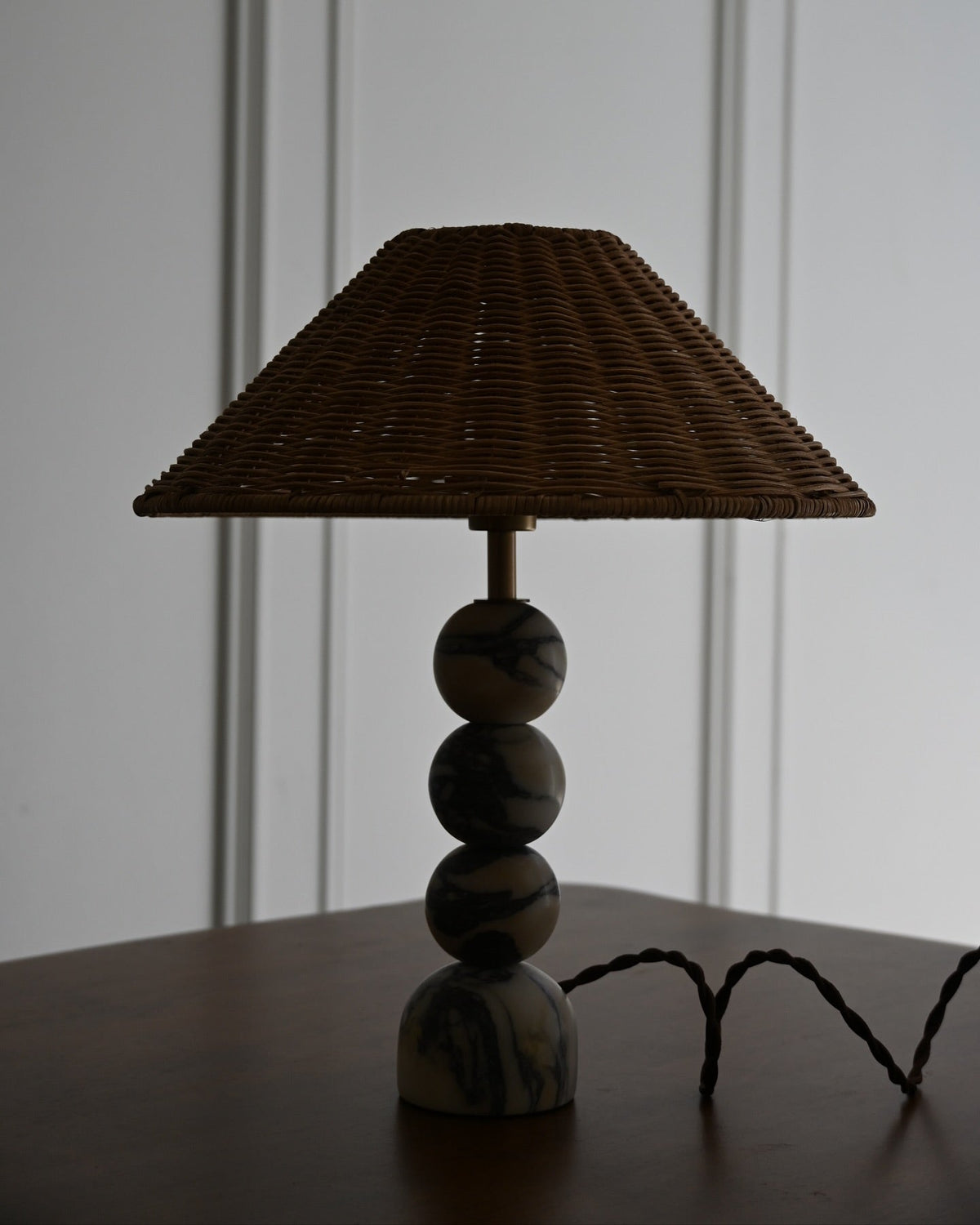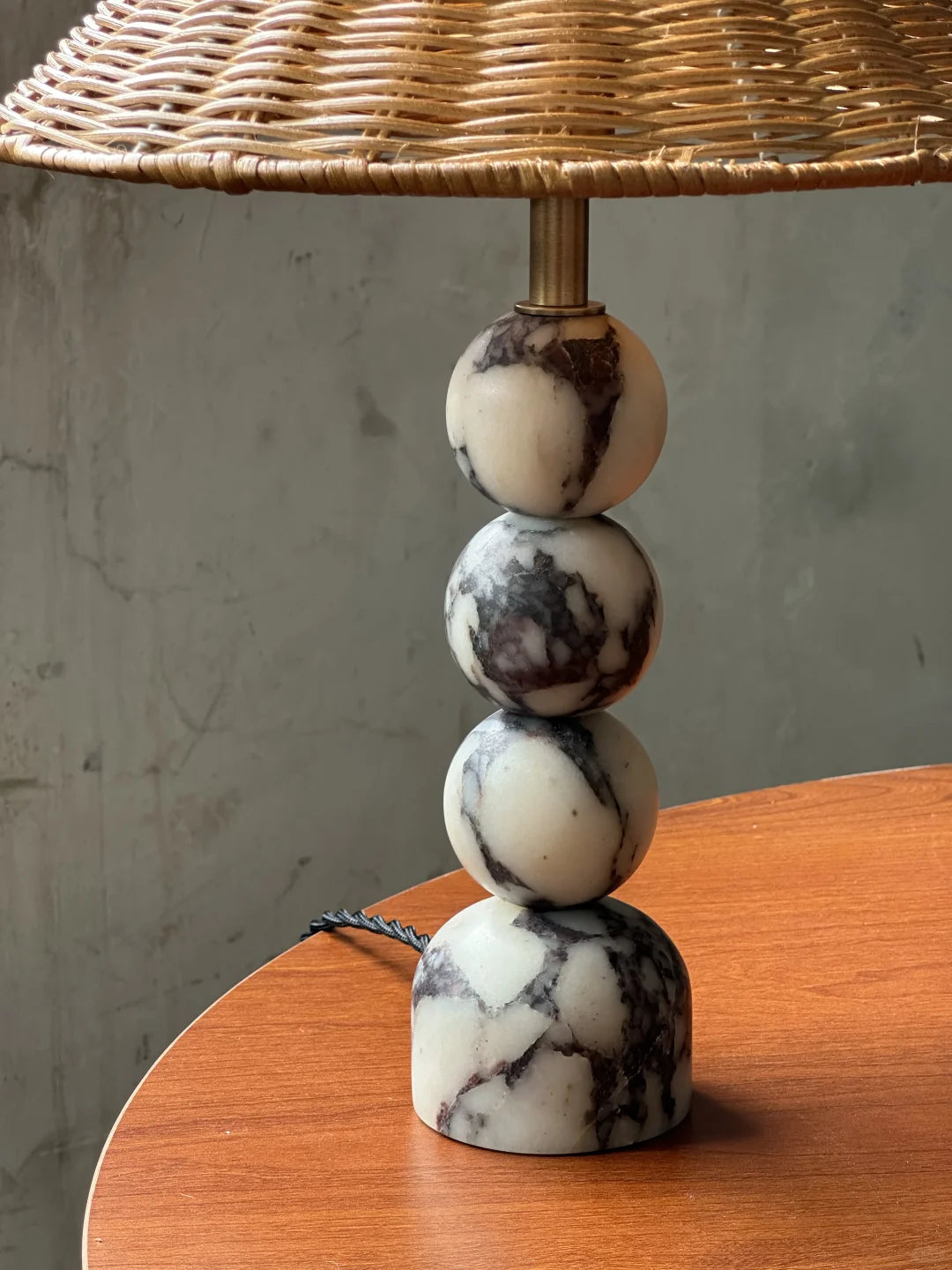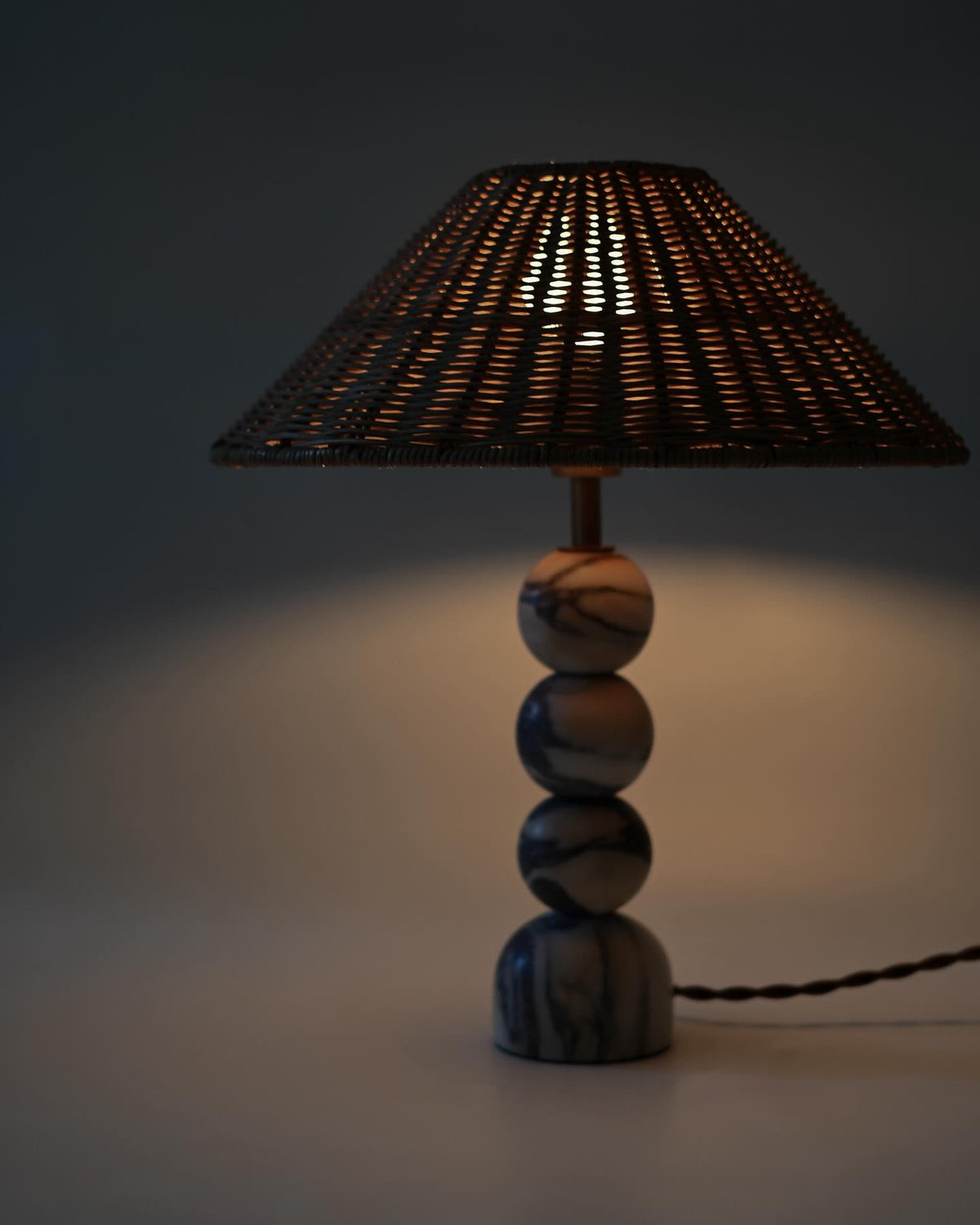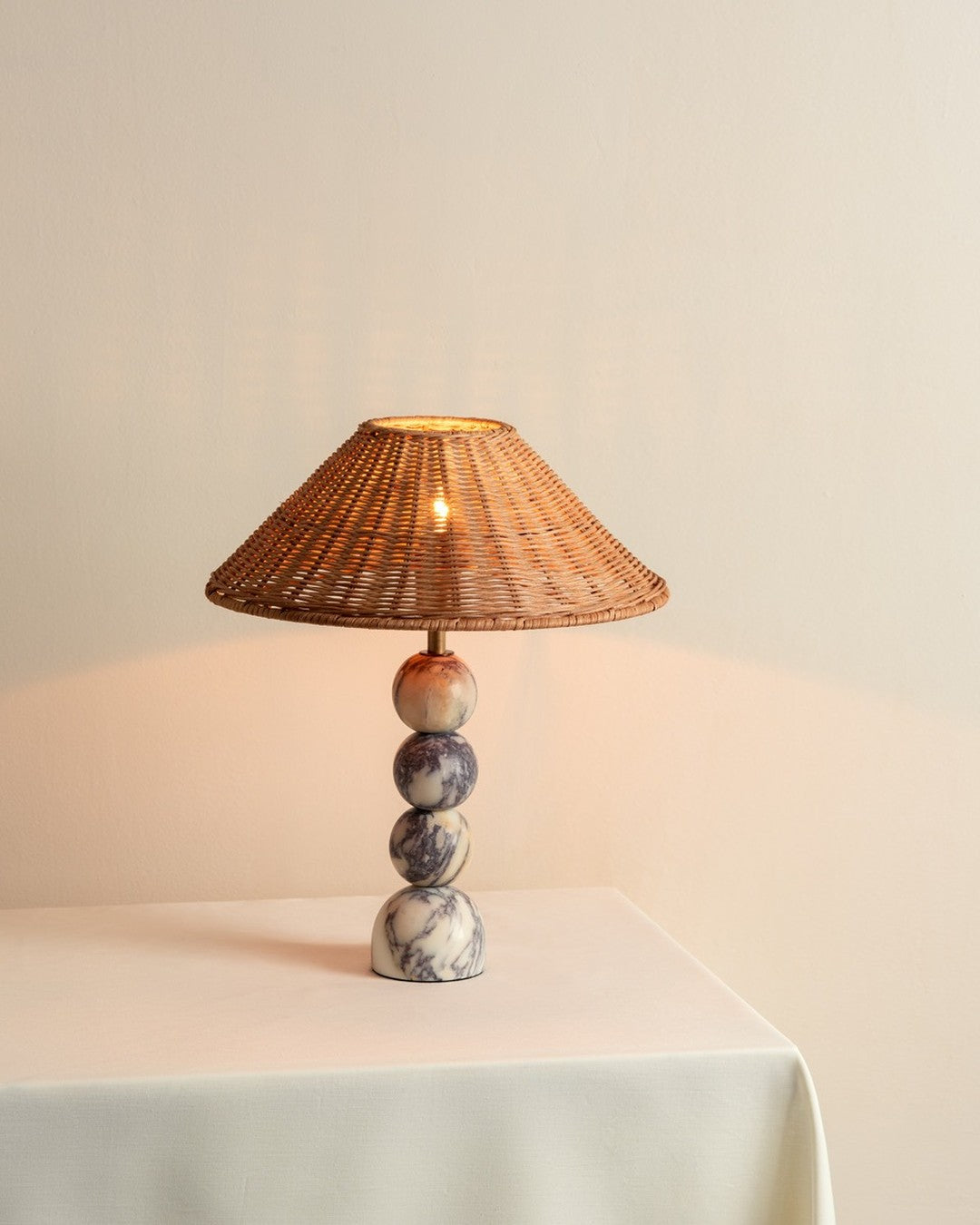 - Carroll Table Lamp is designed to be the perfect finishing touch for your desk, countertop, or side table, this lamp combines luxury and functionality in one exquisite piece. The solid Calacatta Viola Italian marble base exudes sophistication, showcasing its unique veining and rich, natural tones. Paired with a hand-woven rattan shade, the Carroll brings warmth and texture to any room, creating a harmonious balance of materials. Its durable construction ensures it will hold its beauty for years to come, making it a cherished addition to your home or office.