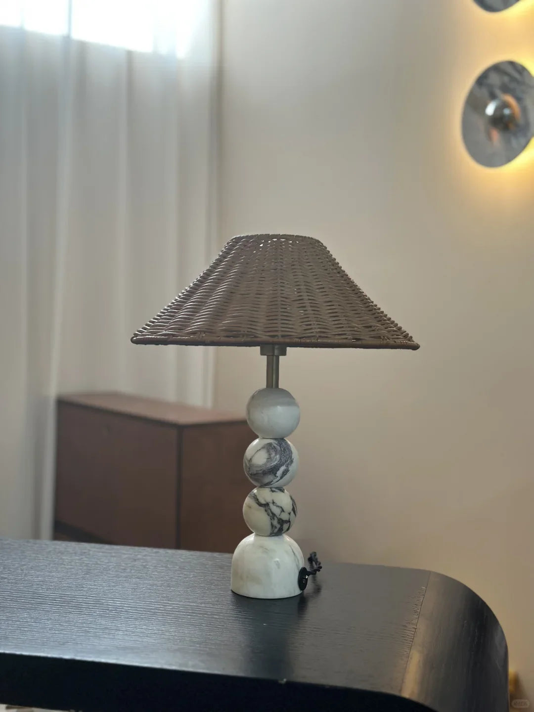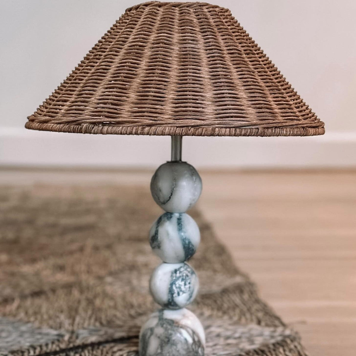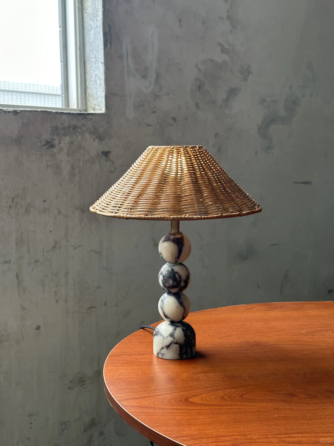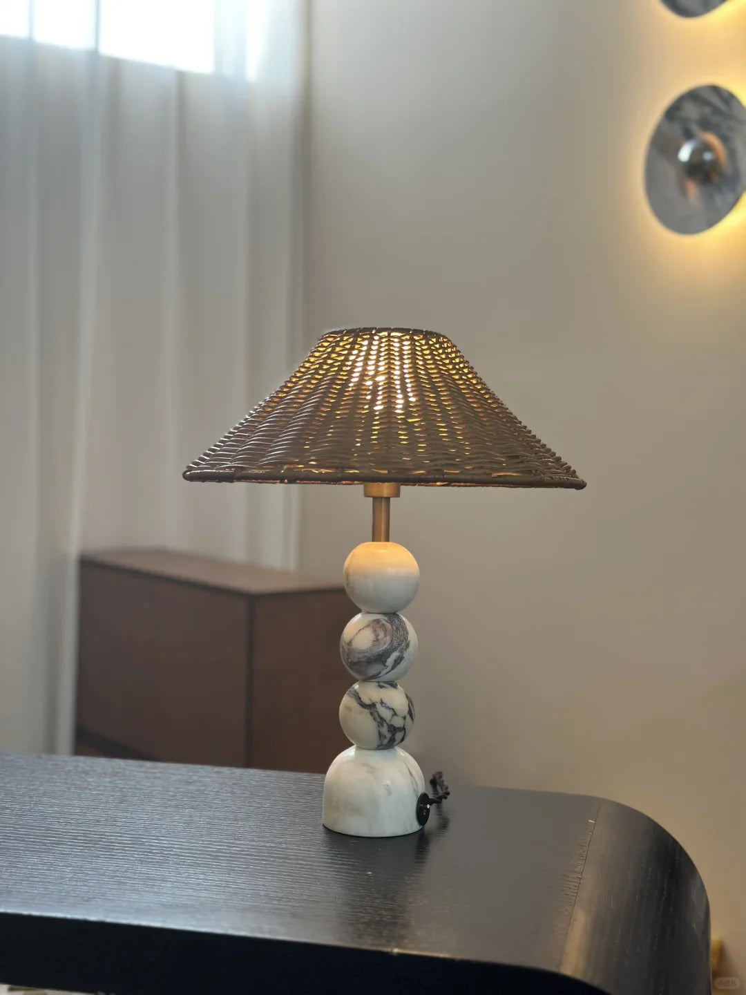 - Carroll Table Lamp is designed to be the perfect finishing touch for your desk, countertop, or side table, this lamp combines luxury and functionality in one exquisite piece. The solid Calacatta Viola Italian marble base exudes sophistication, showcasing its unique veining and rich, natural tones. Paired with a hand-woven rattan shade, the Carroll brings warmth and texture to any room, creating a harmonious balance of materials. Its durable construction ensures it will hold its beauty for years to come, making it a cherished addition to your home or office.