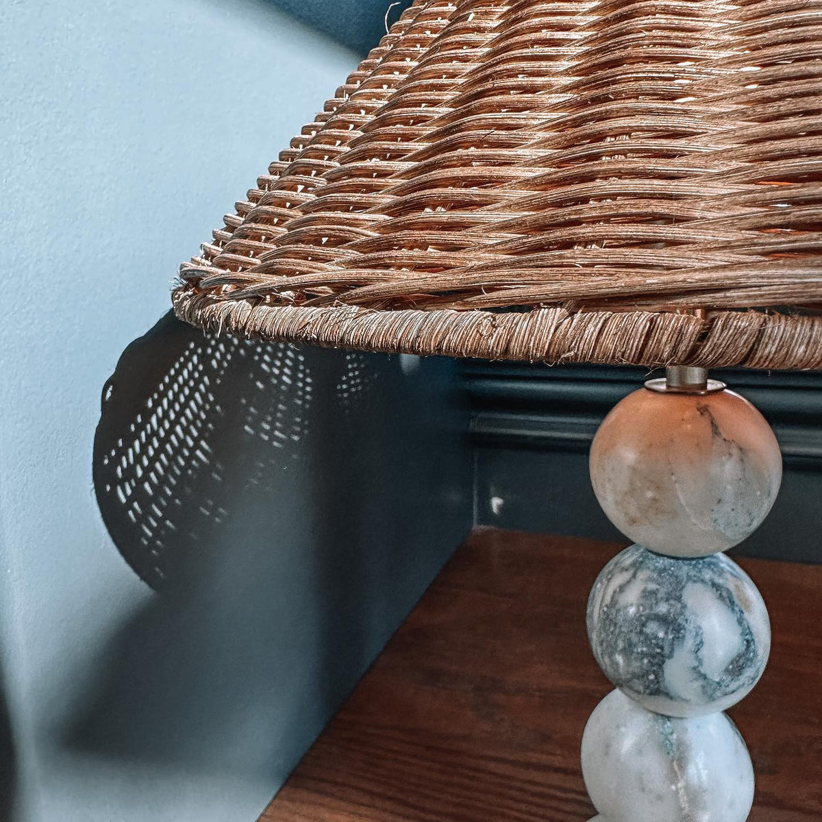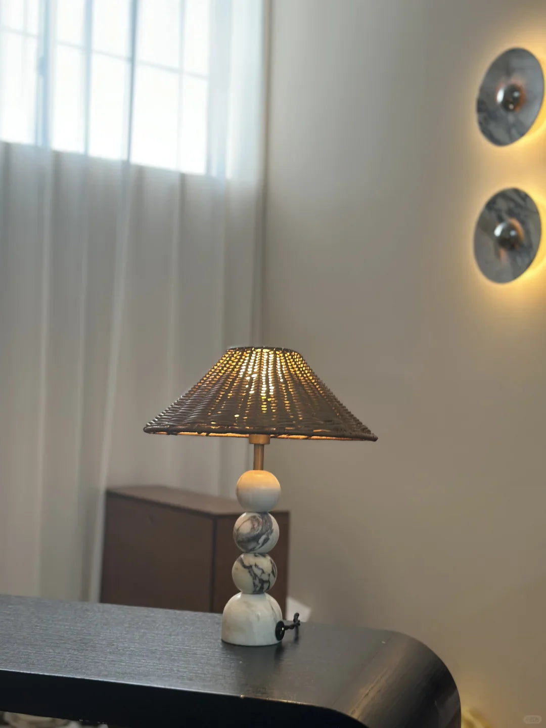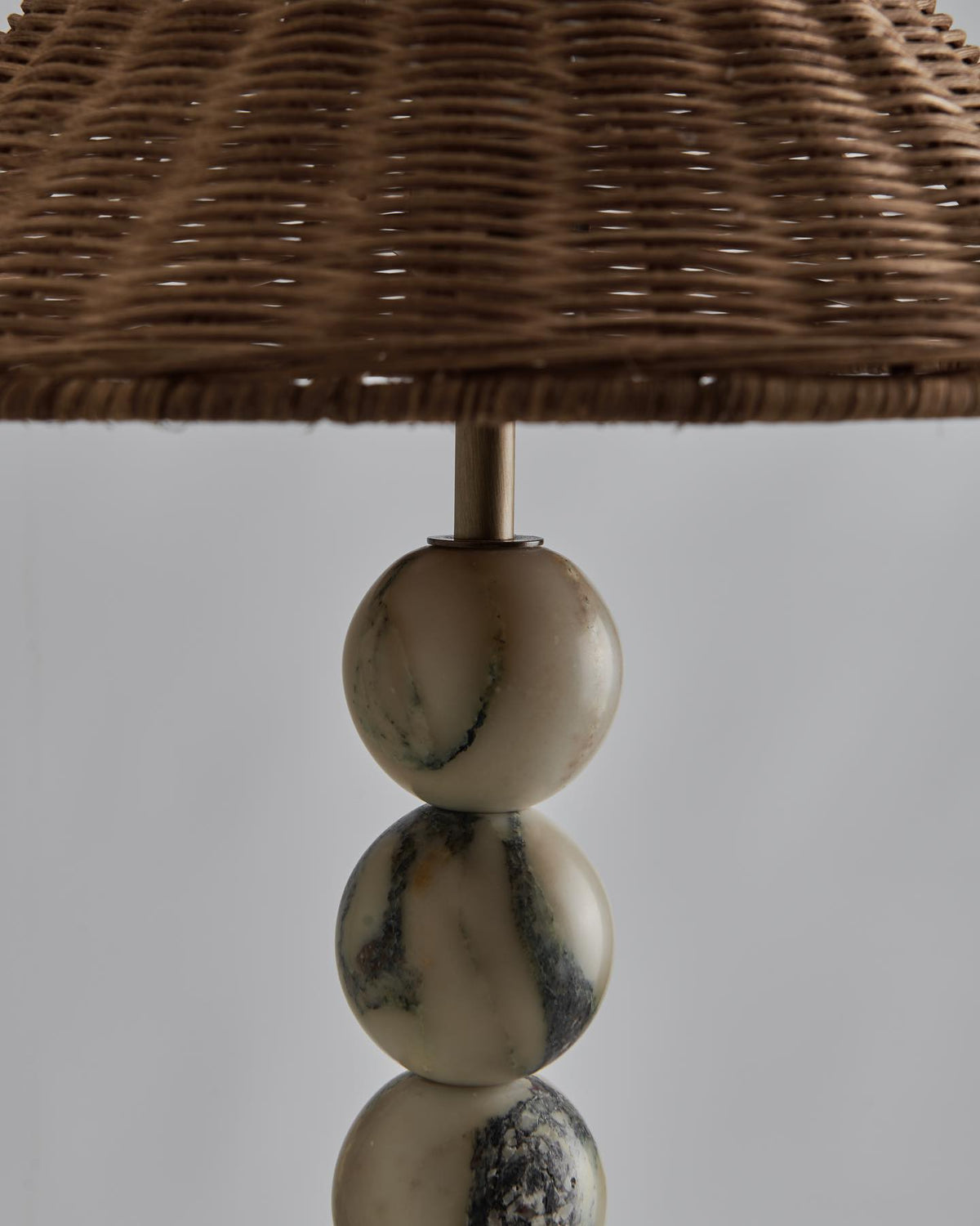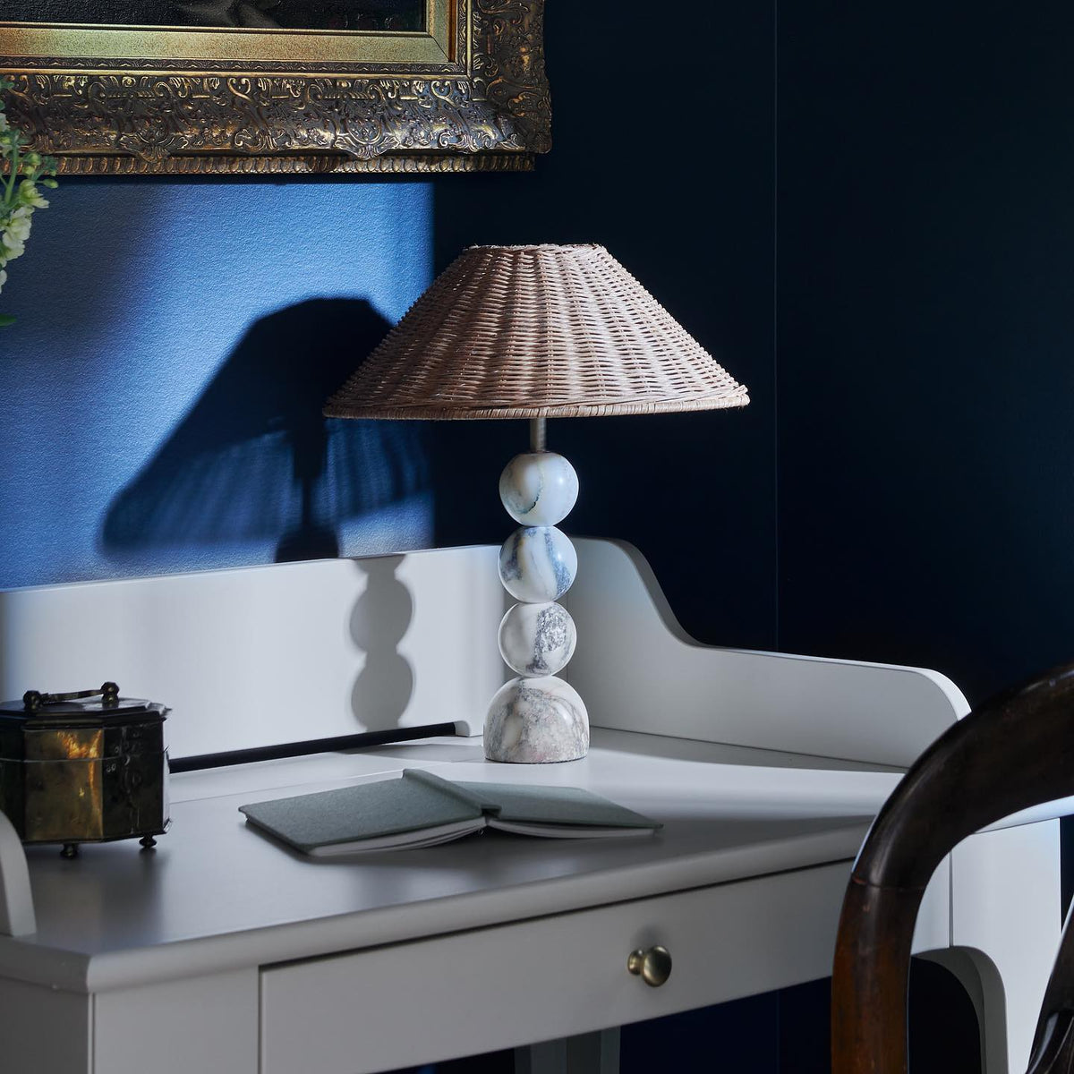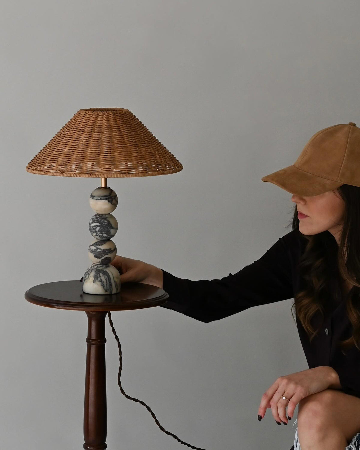 - Carroll Table Lamp is designed to be the perfect finishing touch for your desk, countertop, or side table, this lamp combines luxury and functionality in one exquisite piece. The solid Calacatta Viola Italian marble base exudes sophistication, showcasing its unique veining and rich, natural tones. Paired with a hand-woven rattan shade, the Carroll brings warmth and texture to any room, creating a harmonious balance of materials. Its durable construction ensures it will hold its beauty for years to come, making it a cherished addition to your home or office.