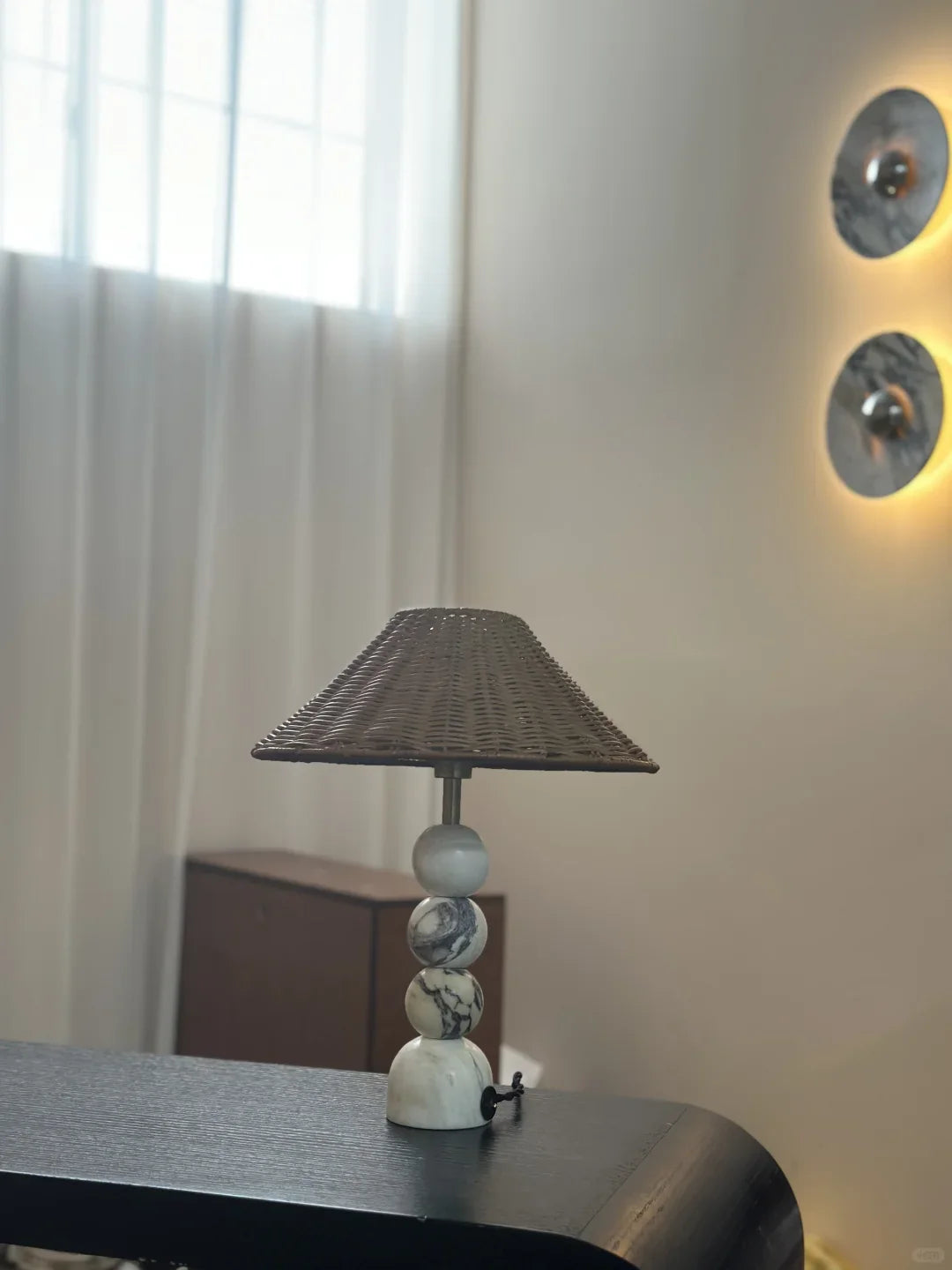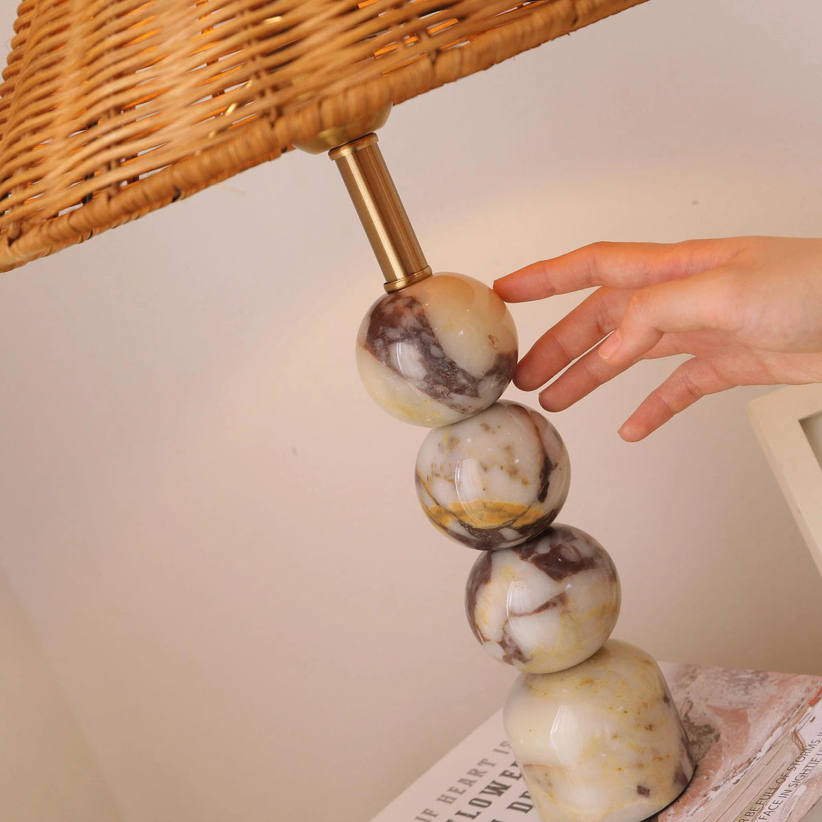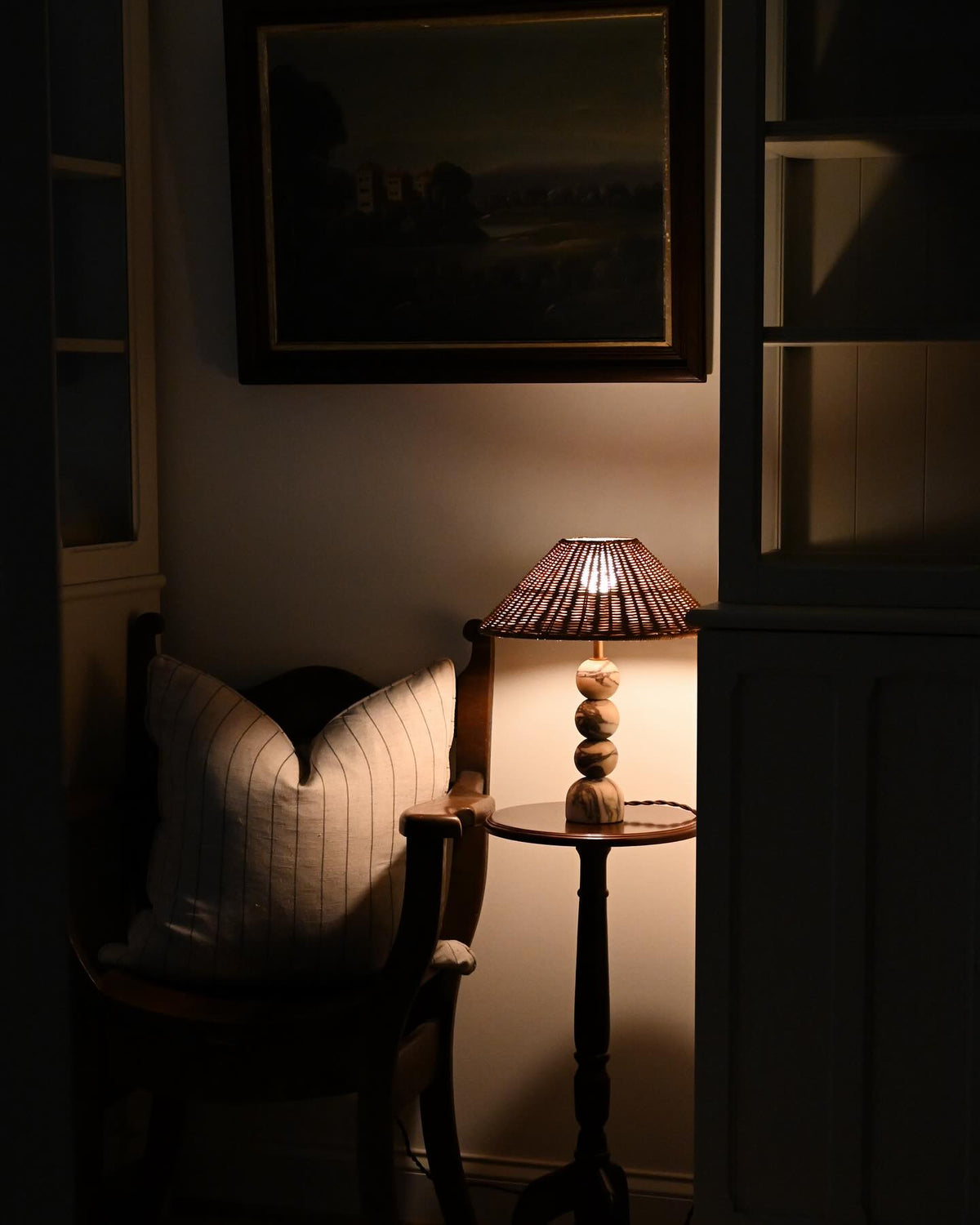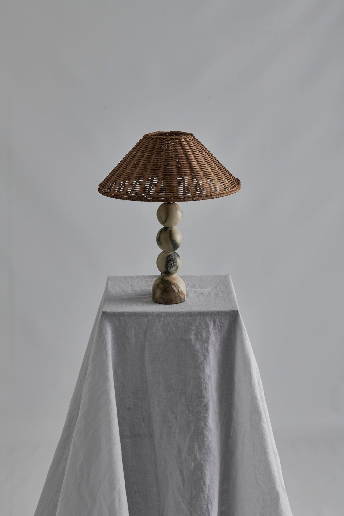 - Carroll Table Lamp is designed to be the perfect finishing touch for your desk, countertop, or side table, this lamp combines luxury and functionality in one exquisite piece. The solid Calacatta Viola Italian marble base exudes sophistication, showcasing its unique veining and rich, natural tones. Paired with a hand-woven rattan shade, the Carroll brings warmth and texture to any room, creating a harmonious balance of materials. Its durable construction ensures it will hold its beauty for years to come, making it a cherished addition to your home or office.