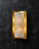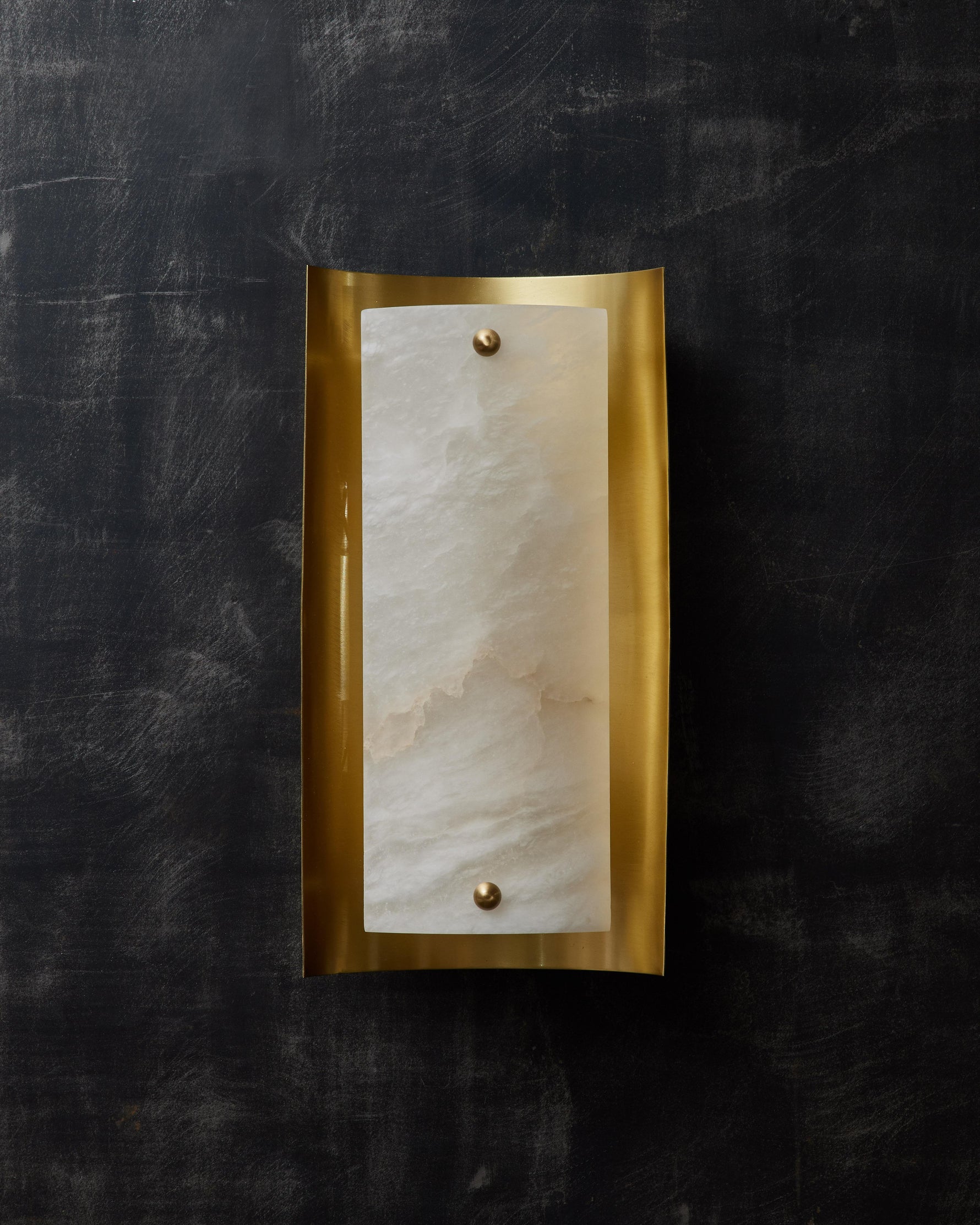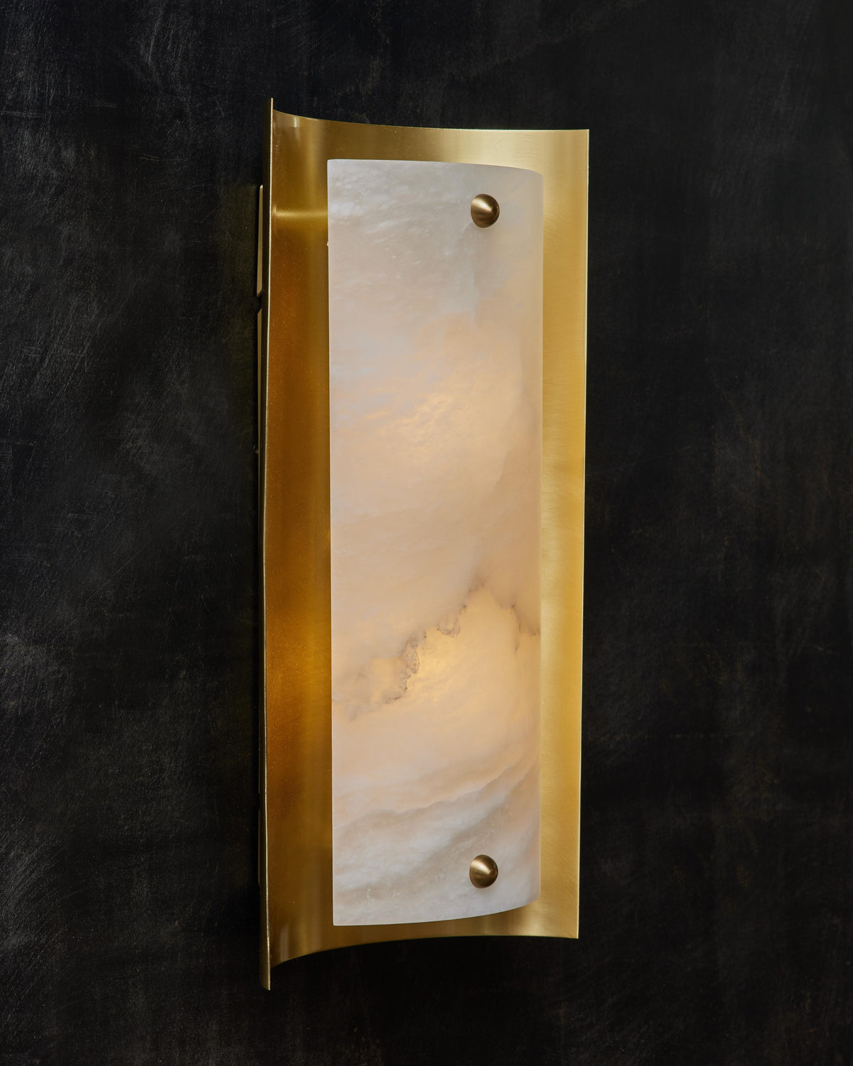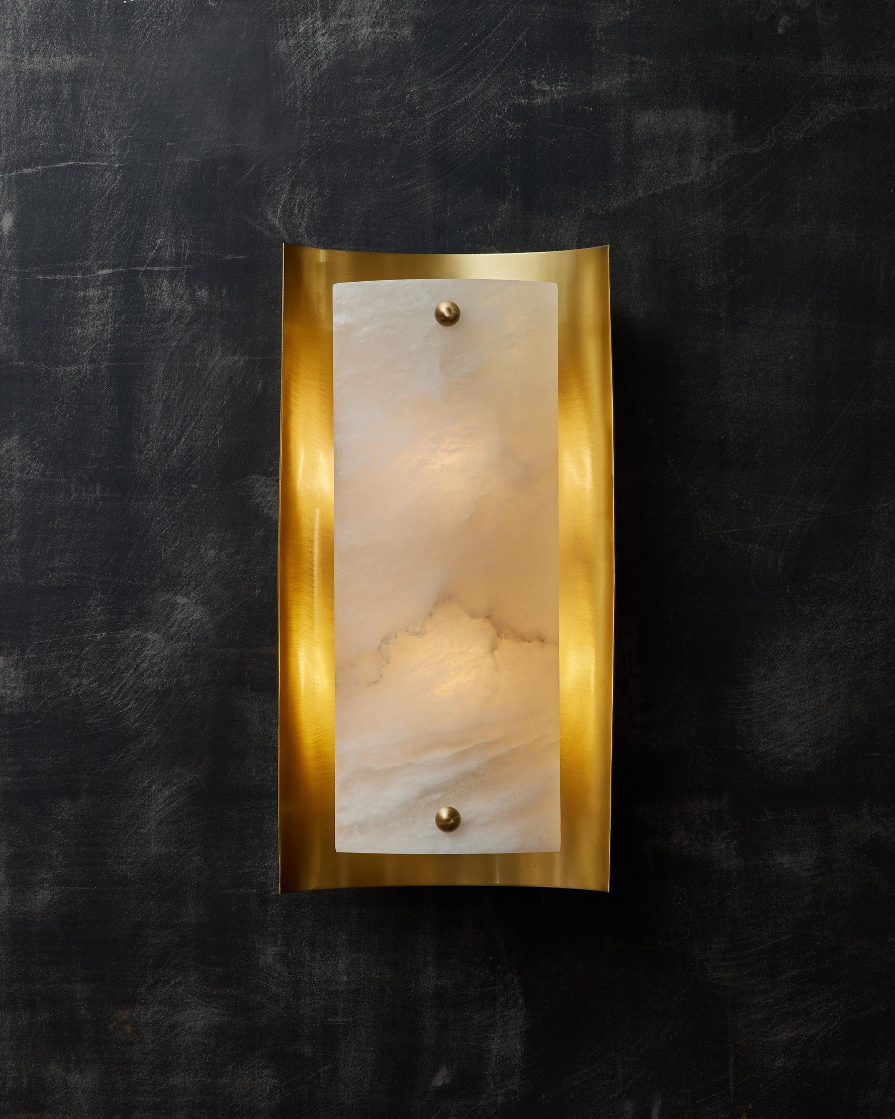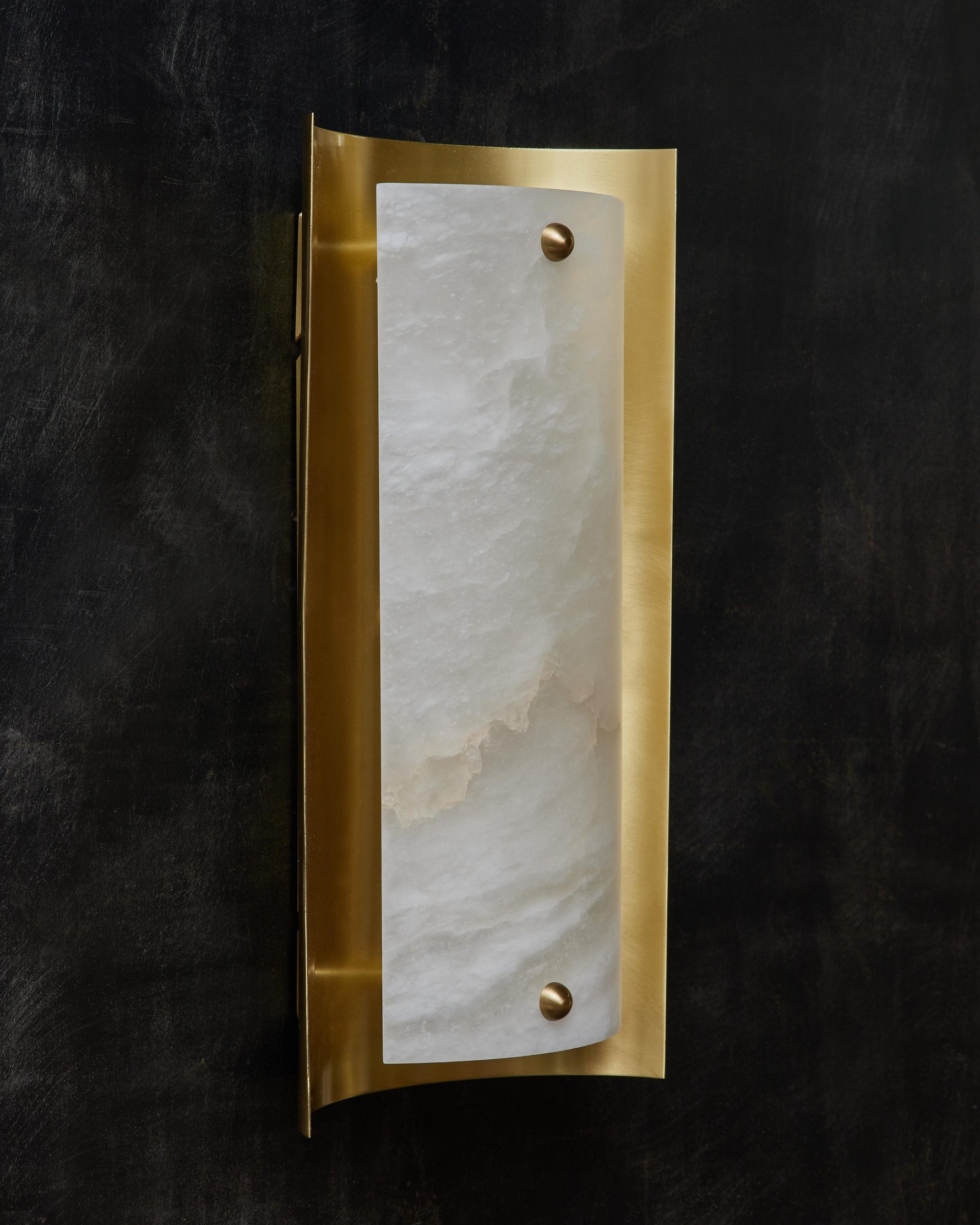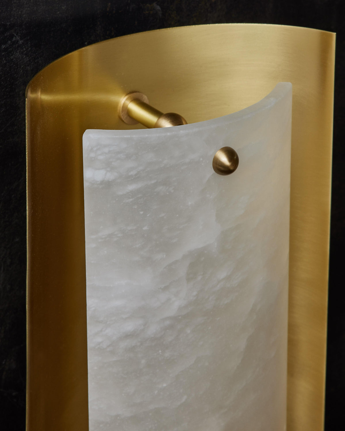 - Discover the perfect blend of form and function with our Alabaster Shield Wall Sconce. This elegant fixture combines a concave satin brass reflector with a convex alabaster diffuser to create a soft, gallery-quality glow that enhances any room.