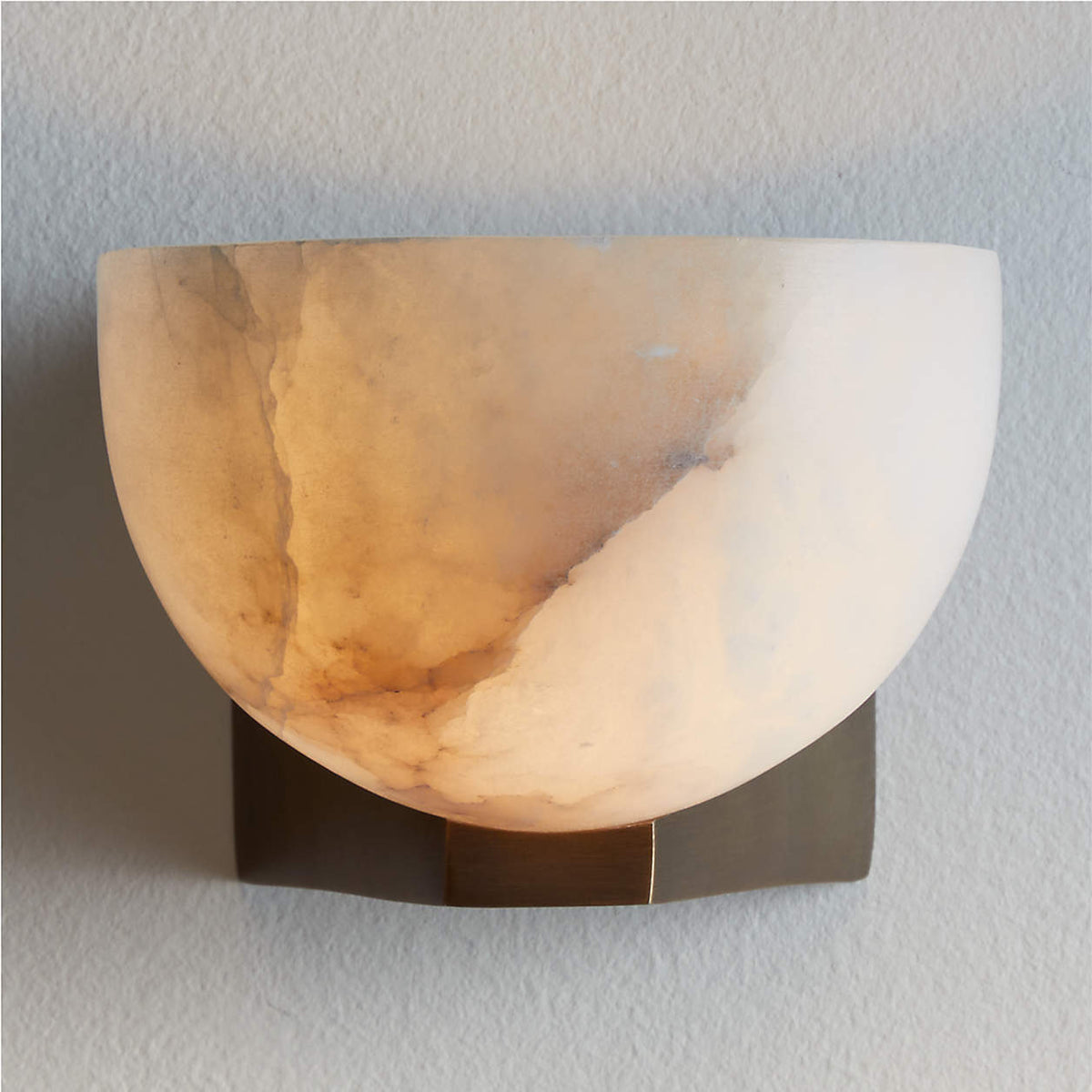 - Embrace the timeless beauty of natural stone with the Ando Alabaster Sconce. Prized for its frosty white hue and soft translucency, each hand-selected alabaster shade is a unique work of art, featuring delicate, one-of-a-kind veining. When illuminated, the stone glows warmly, casting a serene and ambient light that enhances any space.