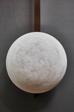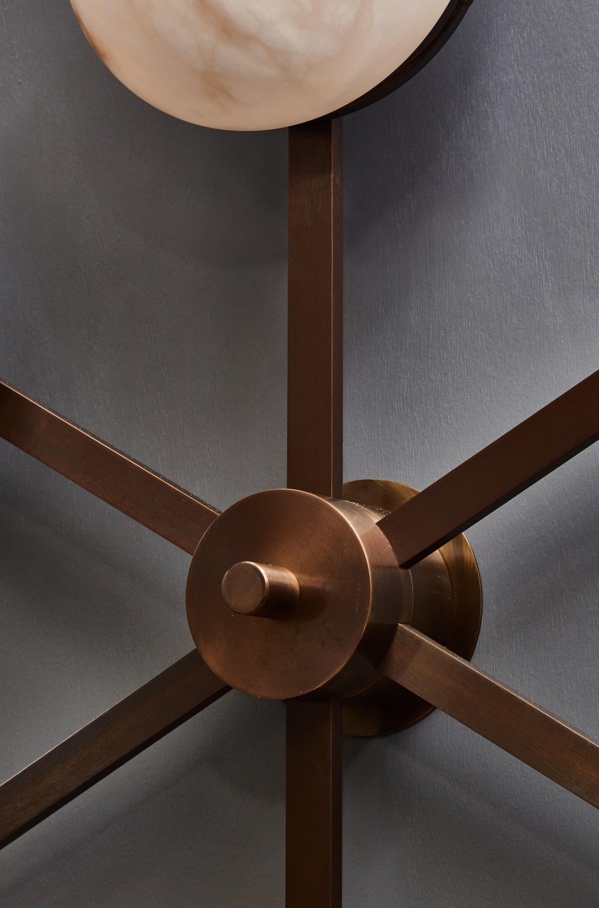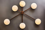 - Introduce an arresting focal point to any room with our Asymmetrical Flush Mount Lamp, where modern design meets organic artistry. Crafted with precision, six gracefully curved brass arms extend asymmetrically from a central core, creating a dynamic, sculptural form that is never the same from every angle. Each arm is meticulously finished to cradle a hand-selected, half-sphere of natural alabaster. The delicate veining and semi-translucent quality of the alabaster ensure that each sconce is utterly unique.