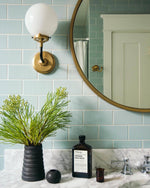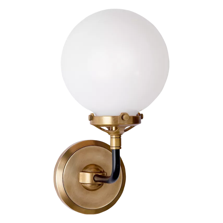 - Bistro Single Sconce crafted with precision, the design features slender, gracefully arched metal arms that create an elegant and airy silhouette. This delicate framework is crowned with a refined glass globe, diffusing a soft, inviting light that enhances the mood without overwhelming the space. The collection's clean lines and minimalist profile ensure it lends a graceful touch to your walls, making it a versatile choice for modern, farmhouse, or industrial decors.