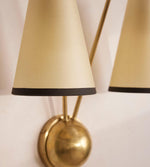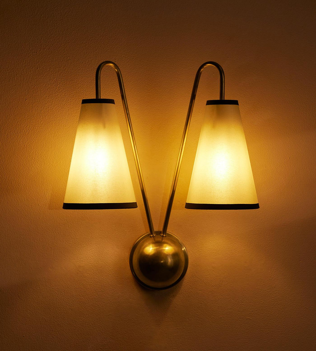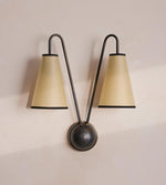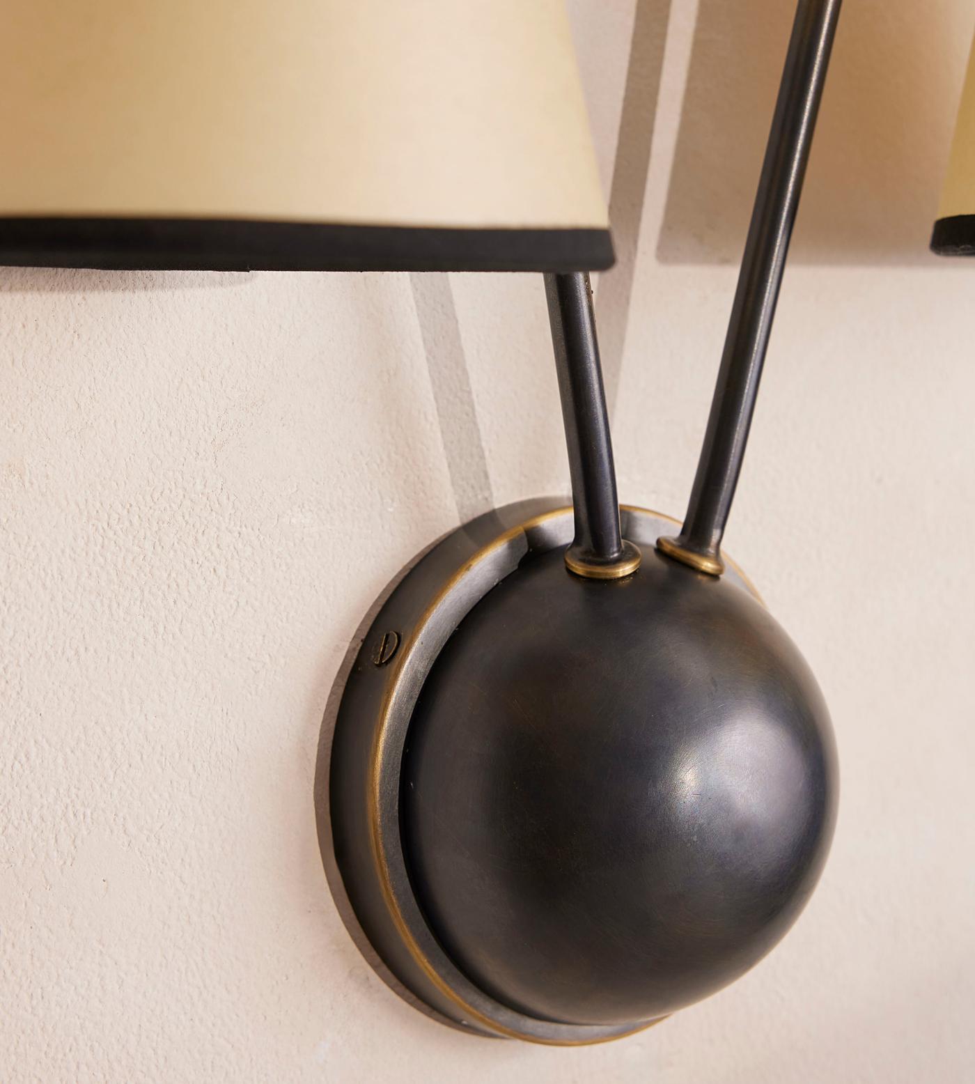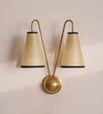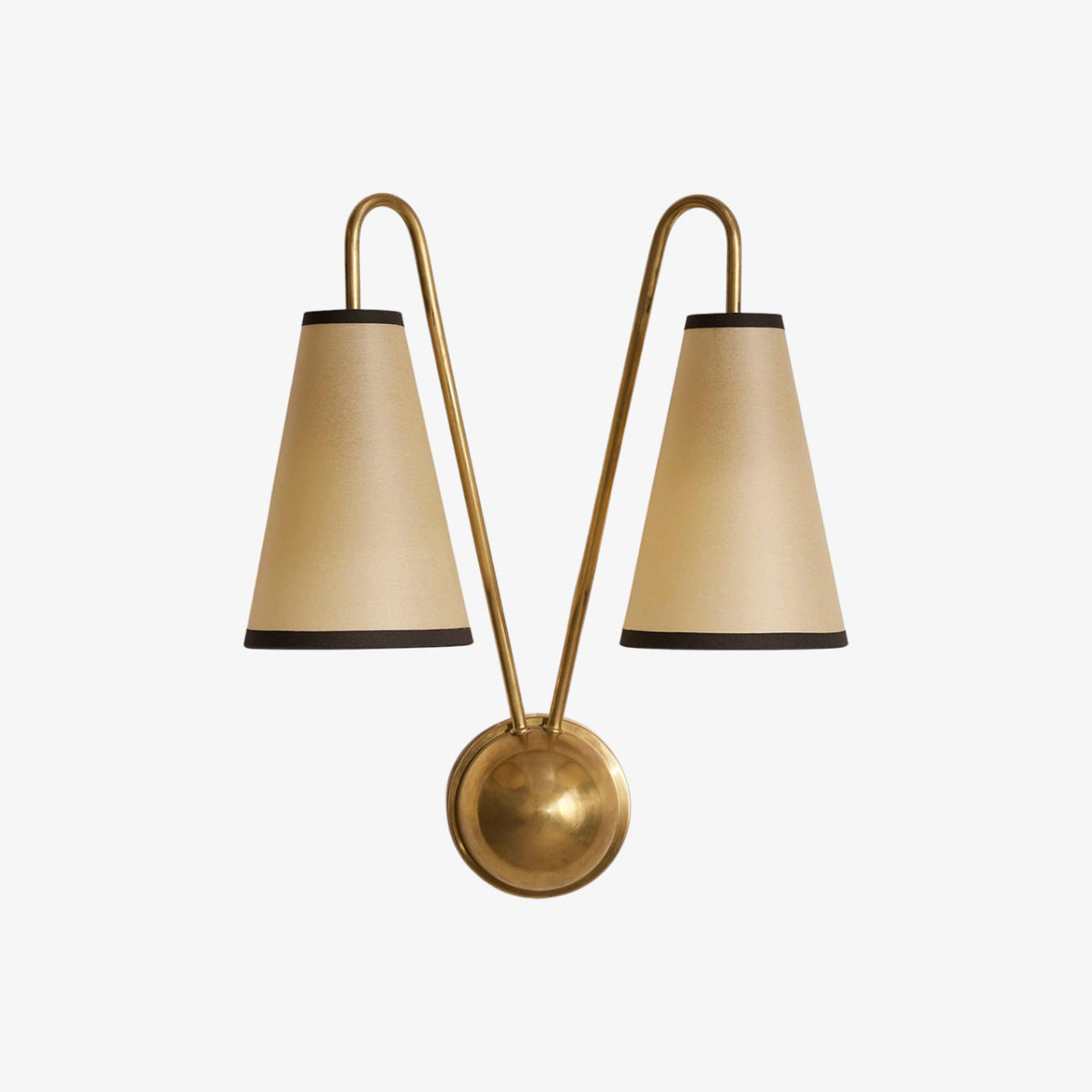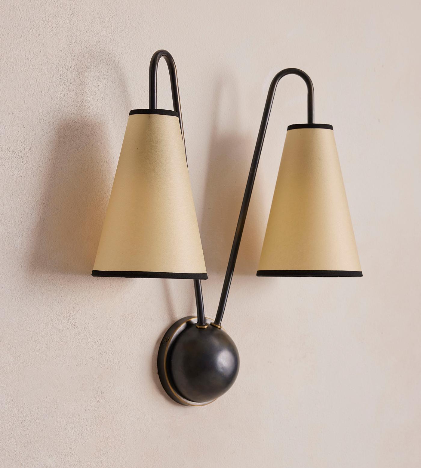 - Introducing the Clarke Wall Sconce, a piece where historic inspiration meets impeccable modern design. Expertly crafted in-house from blackan brass and Antiqued Brass finished with coned parchment shades, this dual-light sconce casts a warm, inviting glow perfect for creating an ambiance of sophisticated comfort. Its timeless silhouette is a direct tribute to the grandeur of 19th-century Parisian architecture, specifically the iconic Soho House Paris, making it a statement piece for the discerning homeowner.