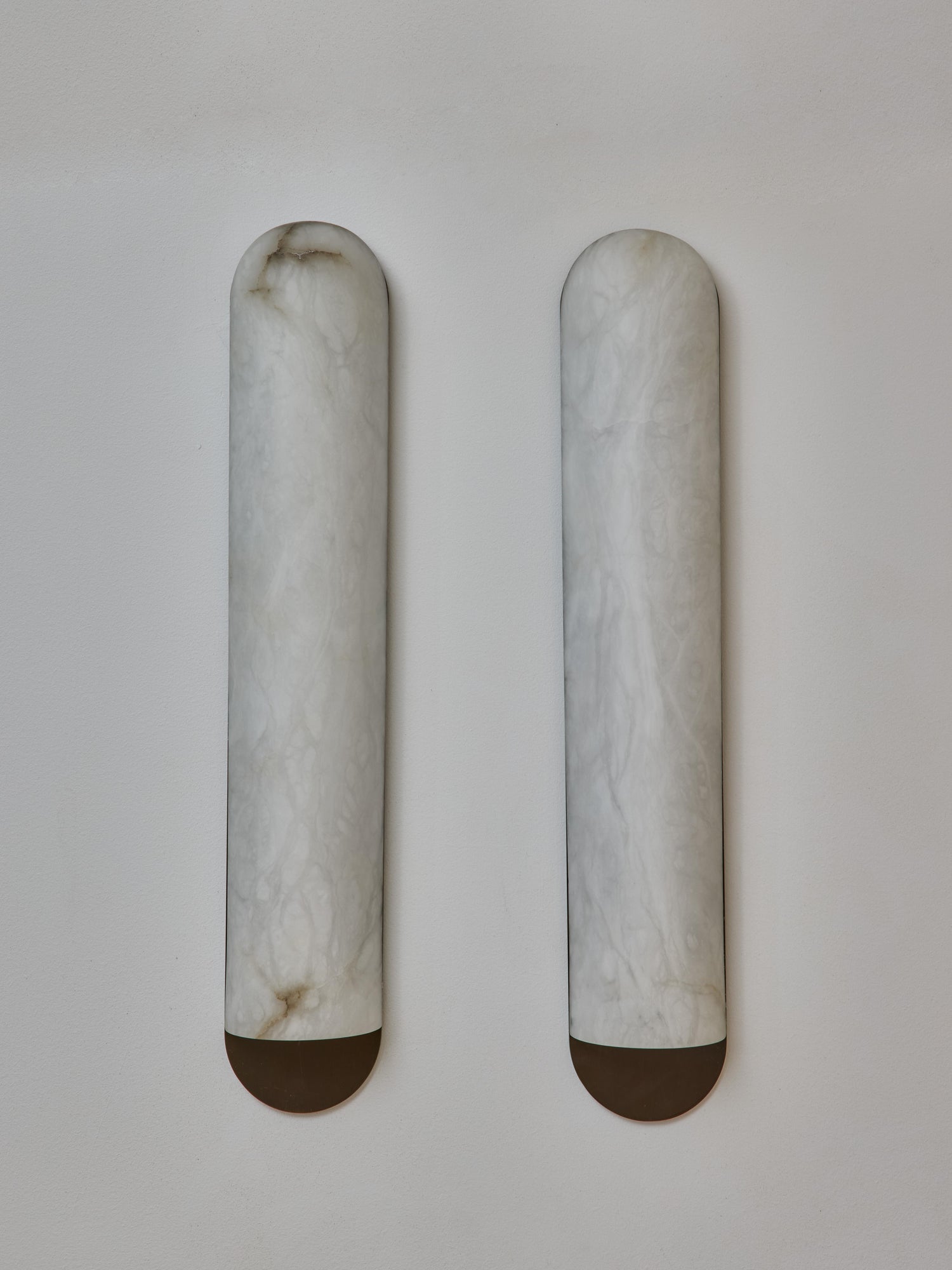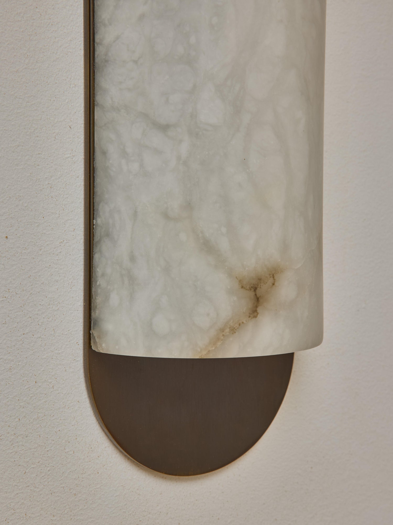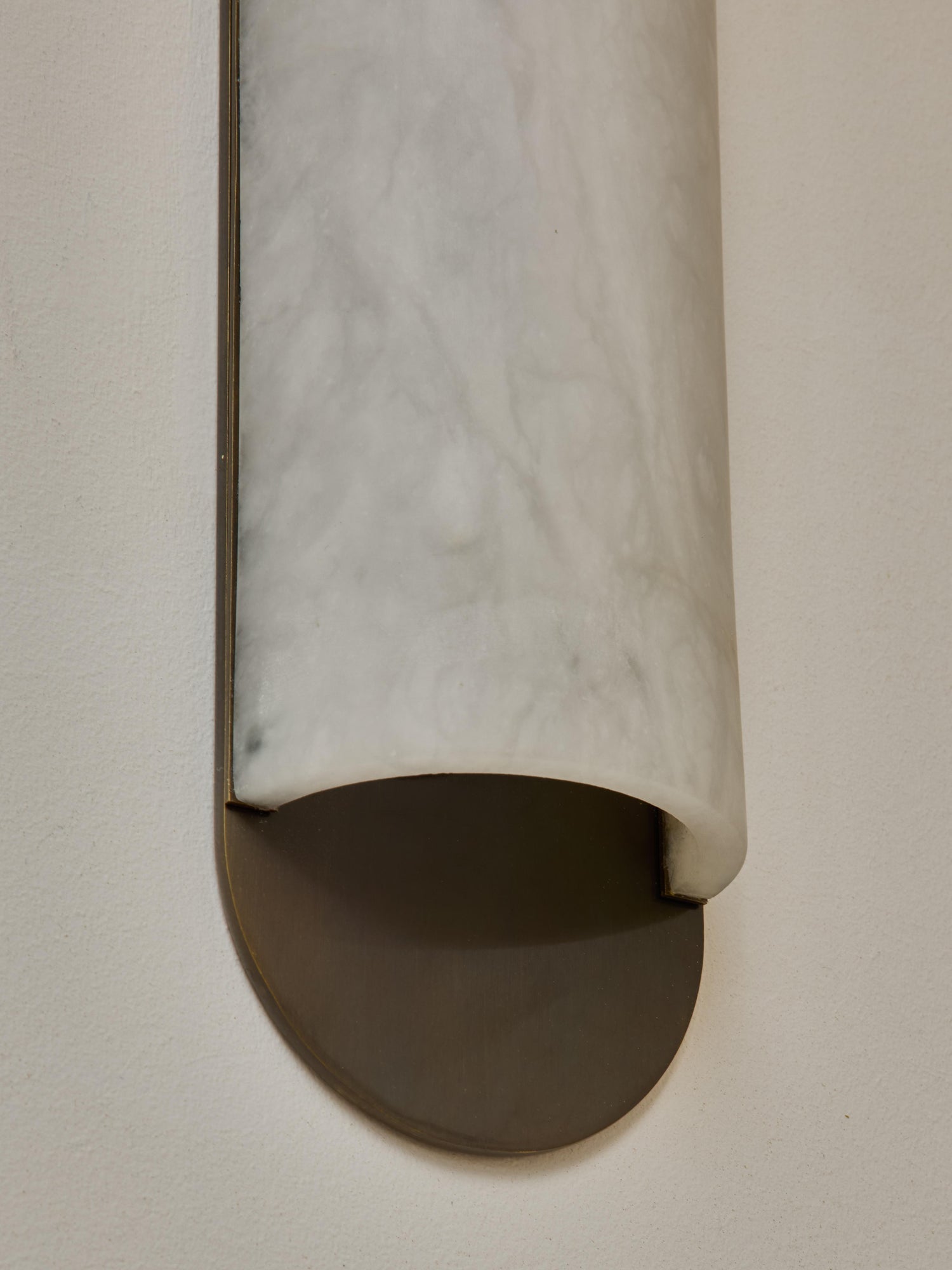 - Introduce a touch of timeless sophistication and modern artistry to your space with our stunning Curved Long Wall Sconce. This piece made of a single rounded and curved carved alabaster piece sat on a light bronze-finish brass backplate.