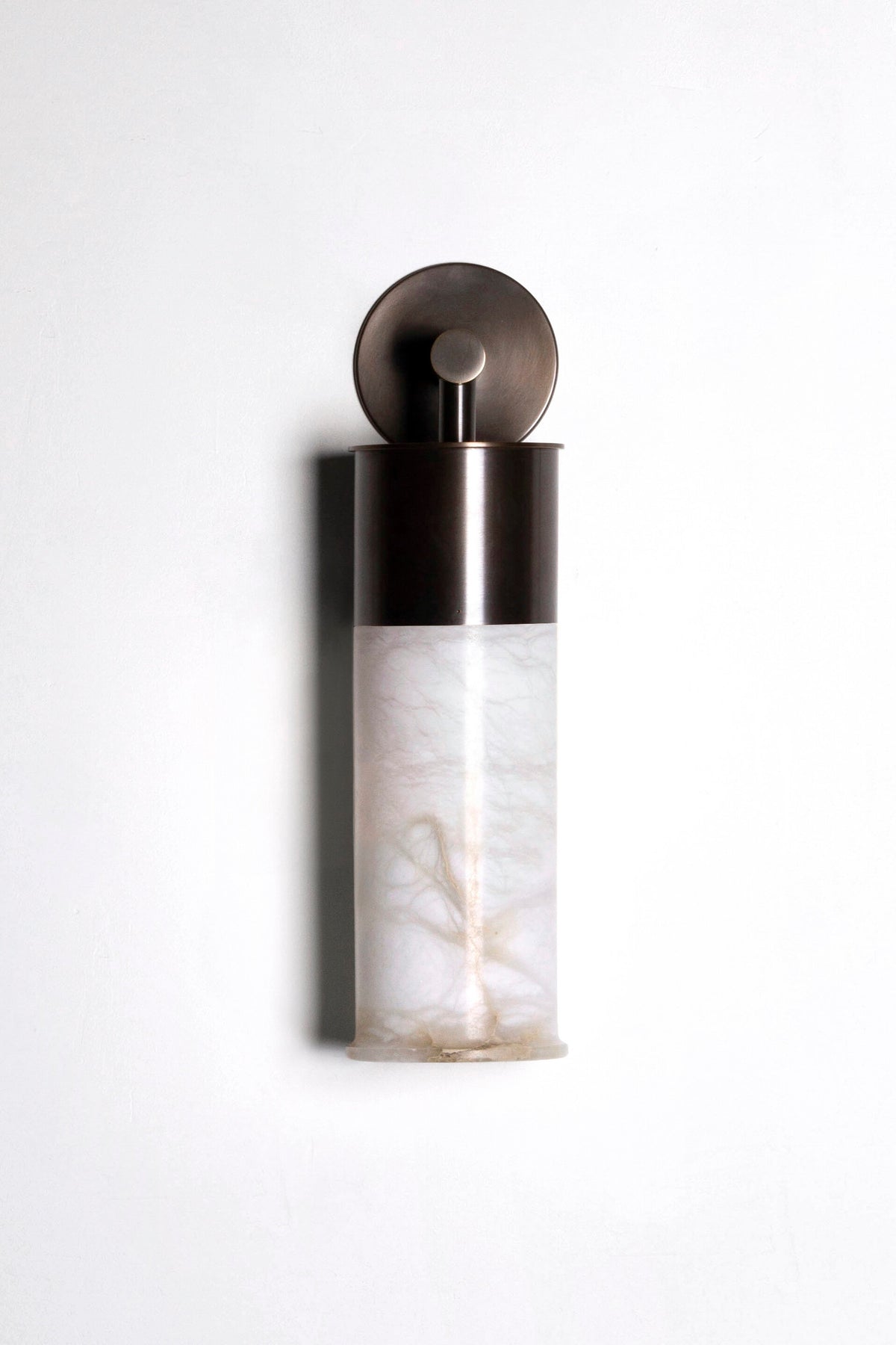 - The Erato Medium Sconce embraces a clean, cylindrical silhouette defined by flowing, uninterrupted lines. The design is a masterclass in balance; the robust presence of the brass is perfectly counterweighted by the soft, luminous volume of the alabaster. This harmonious proportion is key to its versatile appeal. Deliberate design details, such as the precisely formed circular base that anchors it to the wall and the sleek cylindrical connecting parts, introduce a layer of refined sophistication. These elements prevent the simplicity from being plain, adding just enough design intellect to captivate the eye.