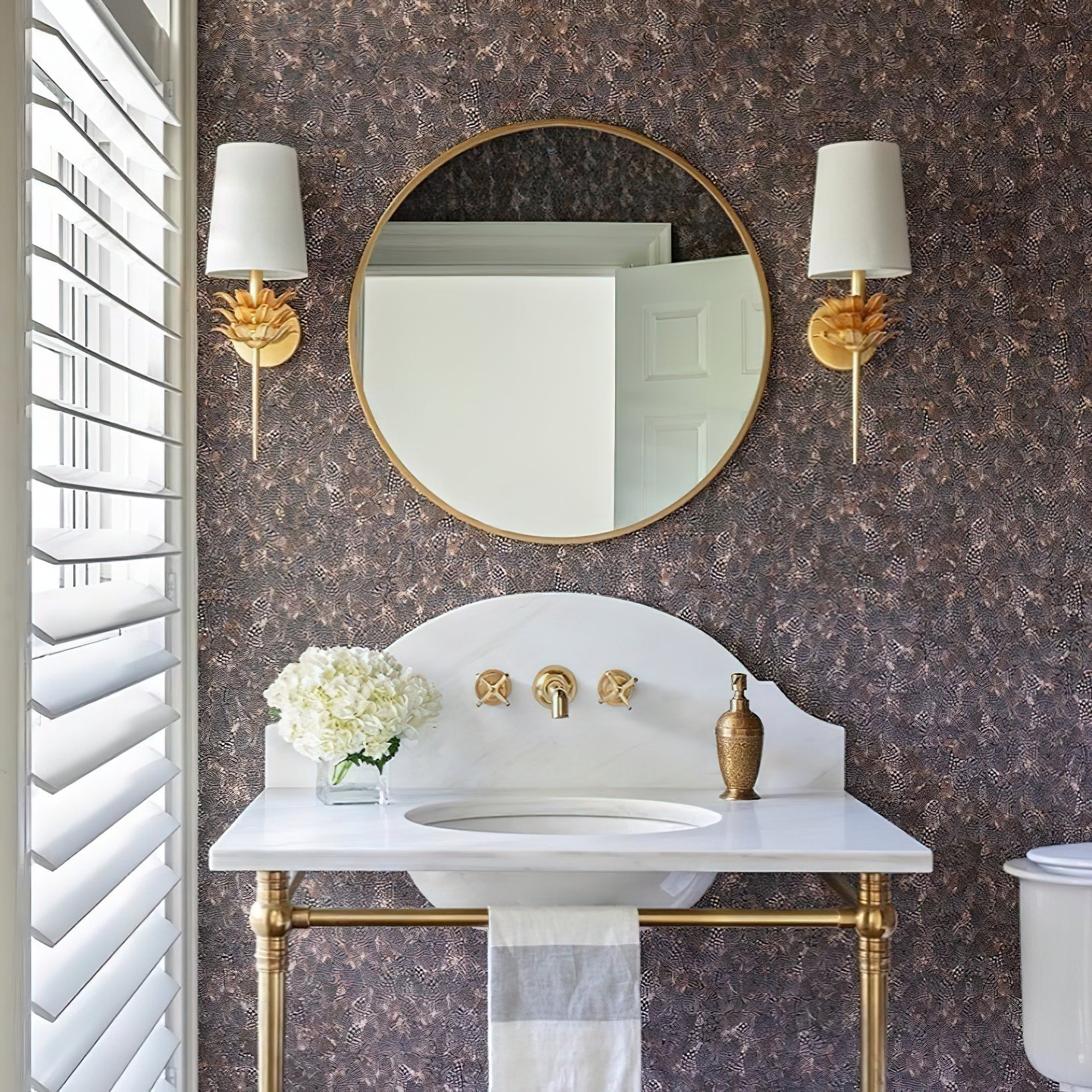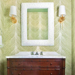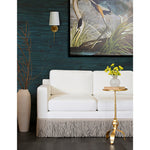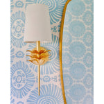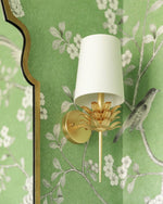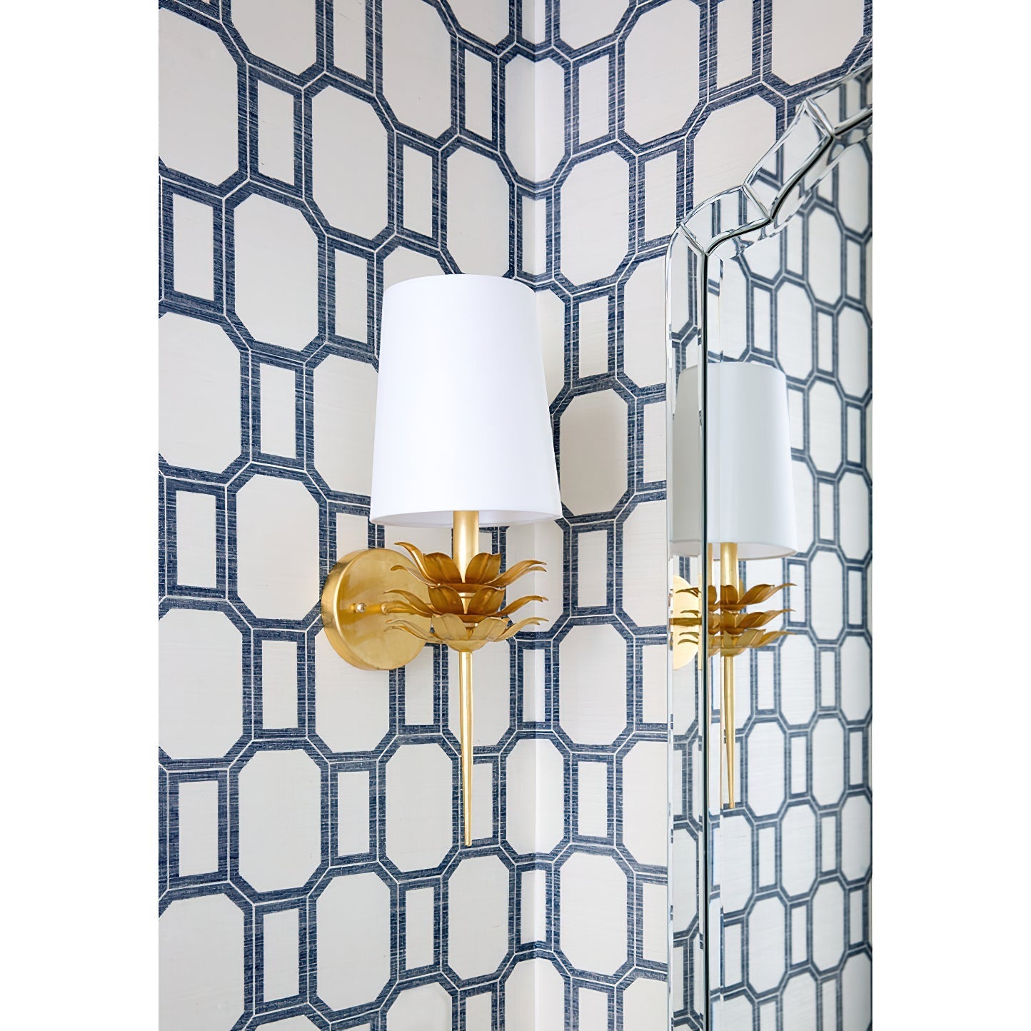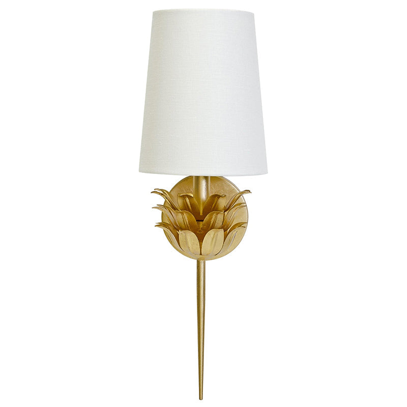 - Embrace the allure of the Glasby Wall Sconce, a captivating piece that adds a touch of botanical elegance to any space. Its graceful, three-layer floral motif creates an interplay of light and shadow, casting enchanting patterns across your walls. The sconce is meticulously finished with hand-applied gold or silver leaf, lending a touch of radiant sophistication. The white linen shade softens the light, creating a warm and inviting ambiance.