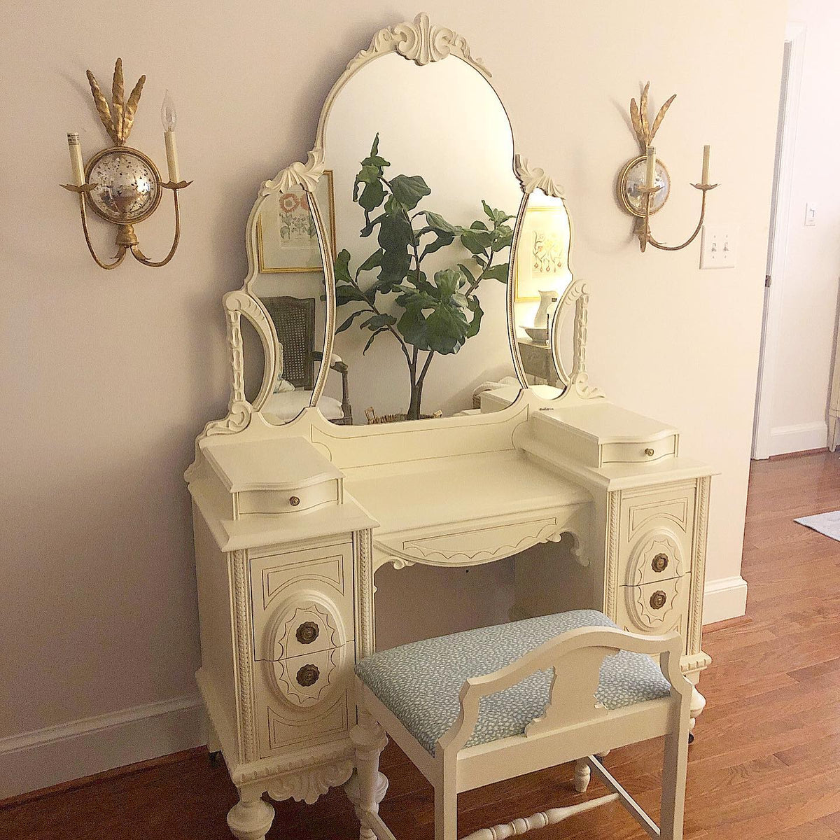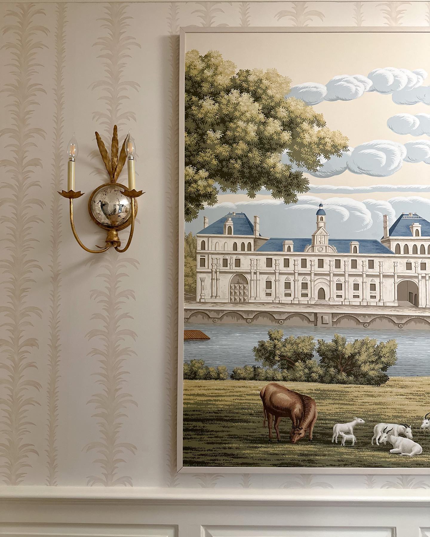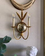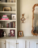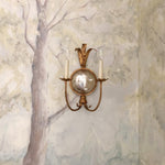 - The soul of the design lies in its captivating central sphere, featuring a hand-applied mirror finish. This is not a simple reflective surface; it is a deeply layered, subtly distressed metal that captures and softens light, throwing a delicate, ambient luminescence around the room. The mirror’s vintage character ensures it complements rather than dominates, adding a layer of depth and sophisticated glamour that changes throughout the day. To complete the ensemble, the sconce is crowned with candle-inspired lights, designed to emulate the gentle, flickering glow of a true flame.