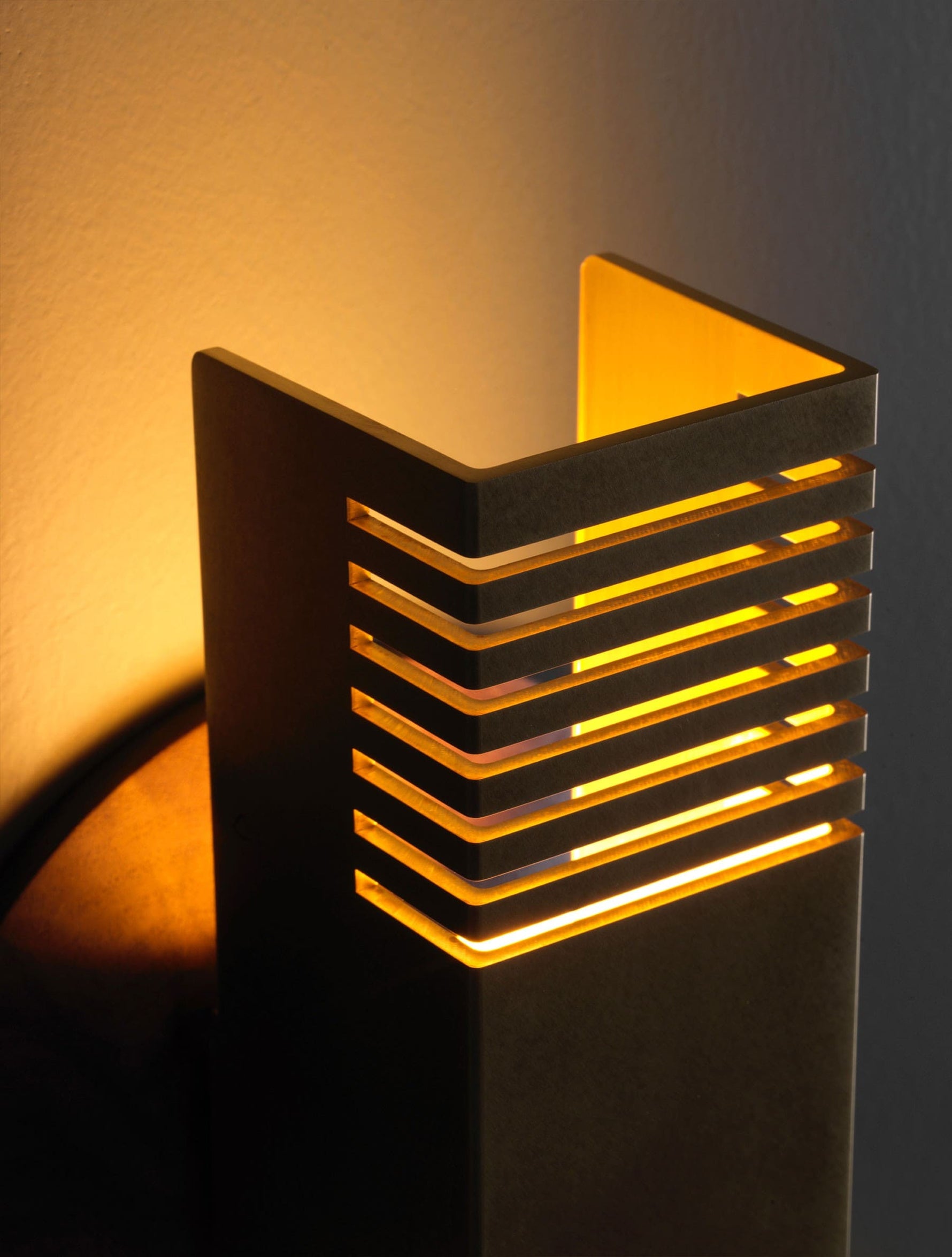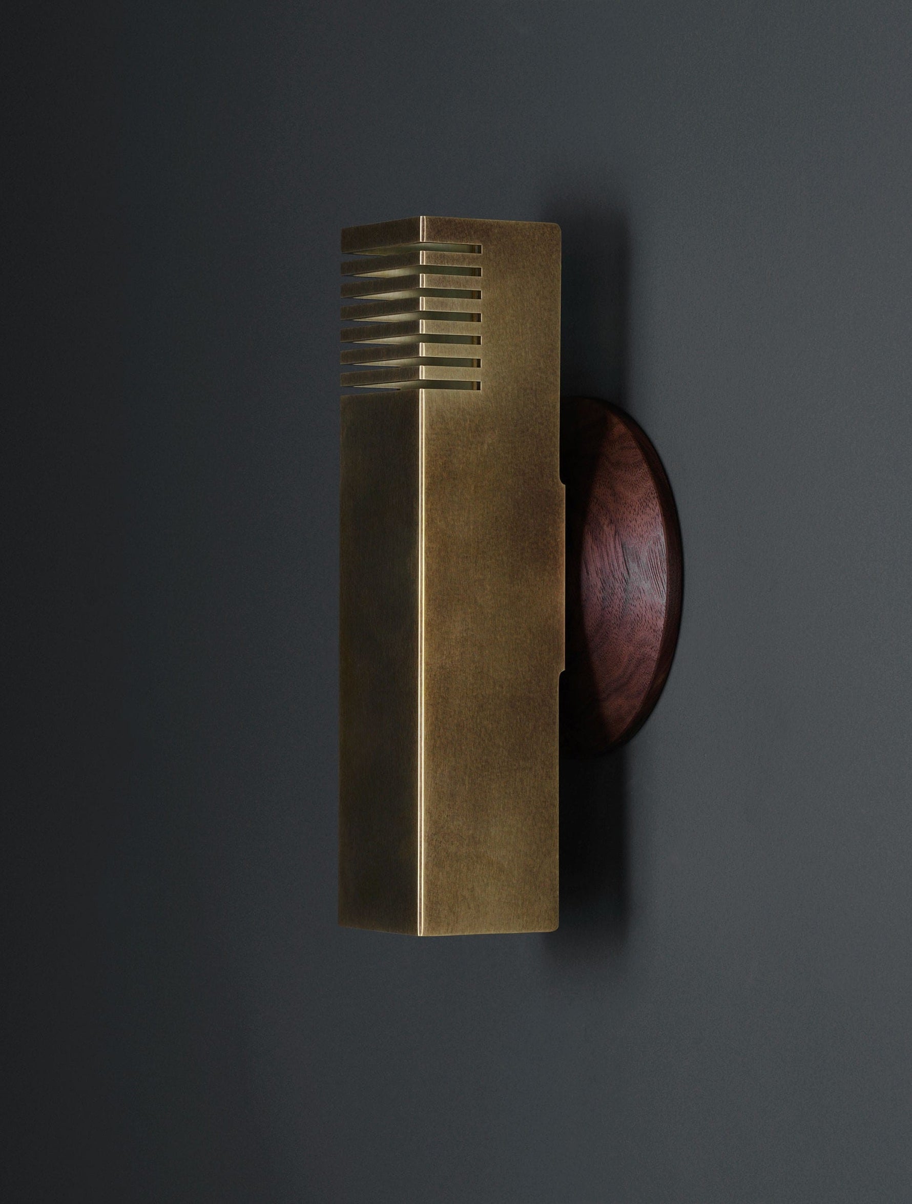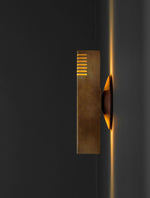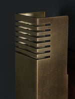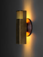 - Illuminate your space with the Groove Sconce, a masterpiece of minimalist design. Its solid brass shade is precisely milled with clean channels that cast captivating lines of light and shadow. The 2-1/2" square profile offers a substantial, modern feel, creating a dramatic ambiance without clutter. Perfect for adding a touch of refined, architectural interest to any hallway, bedroom, or living space.