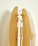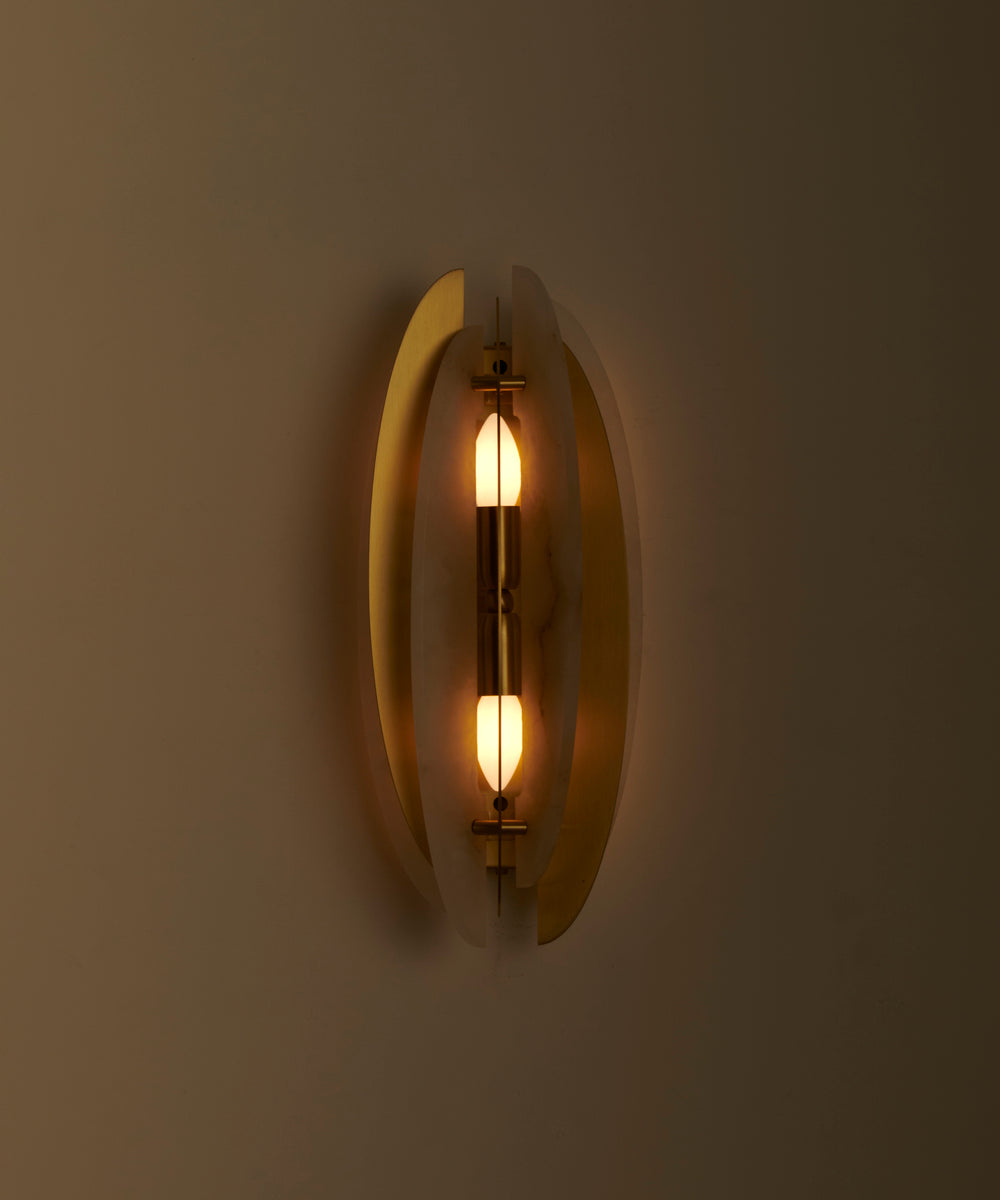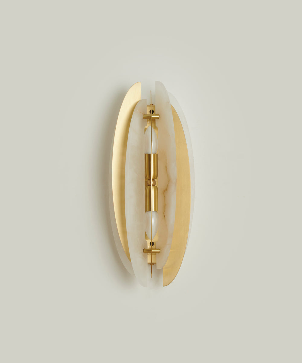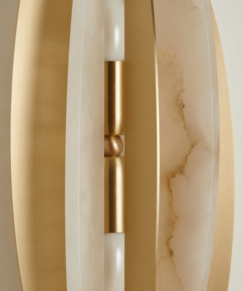 • Each element is meticulously balanced, with the warm metal and luminous stone alternating in perfect harmony. When illuminated, light gently filters through the unique, natural veining of the alabaster, casting a soft, warm, and sophisticated glow that transforms any room into an inviting sanctuary. The satin brass finish adds a touch of modern luxury, gently reflecting its surroundings to enhance the overall sense of depth and elegance.